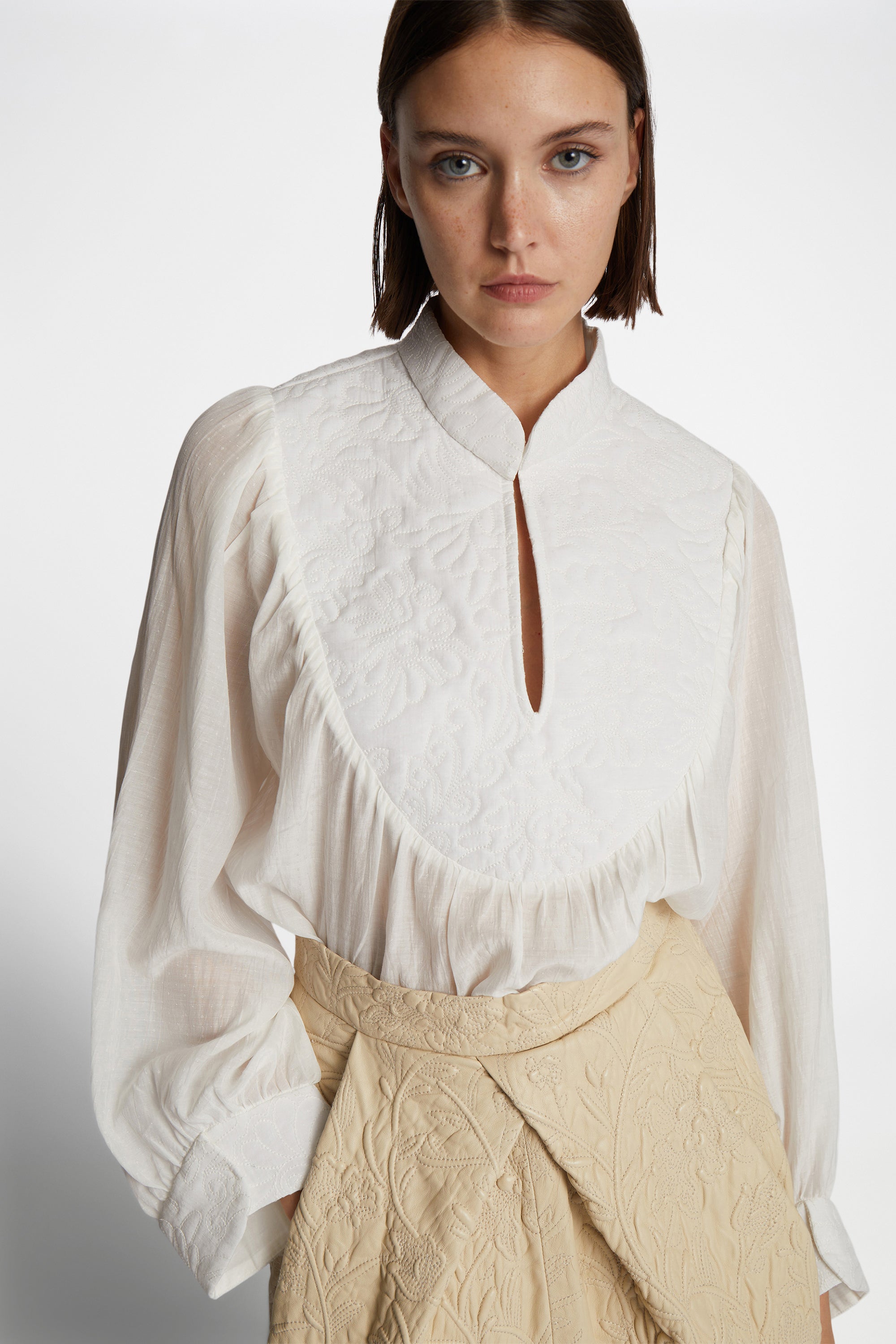 Blouse with an elegant quilted flower embroidery, on the chest and cuffs. This blouse is designed with a mandarin collar and puffy sleeves with wide cuffs.