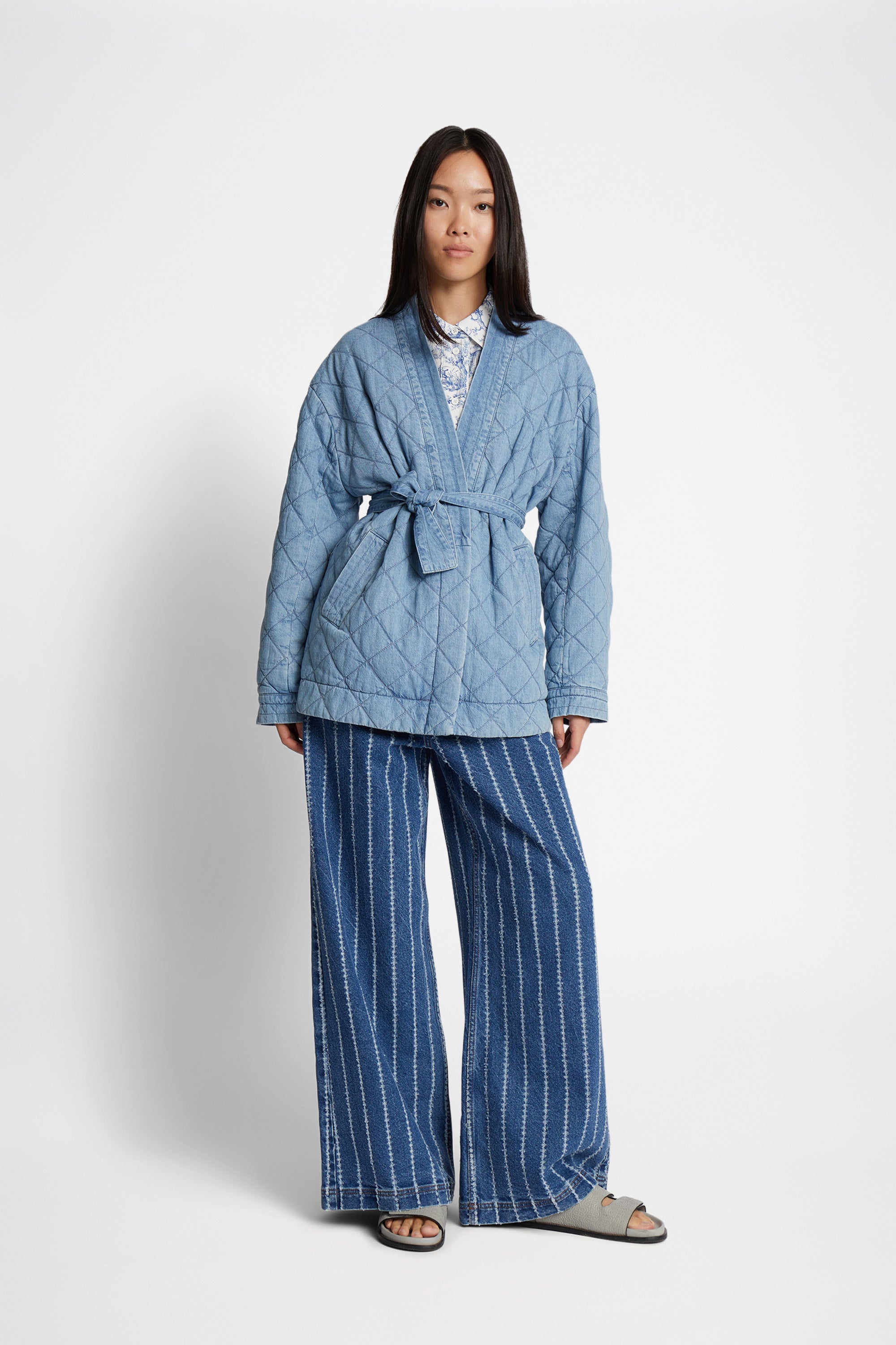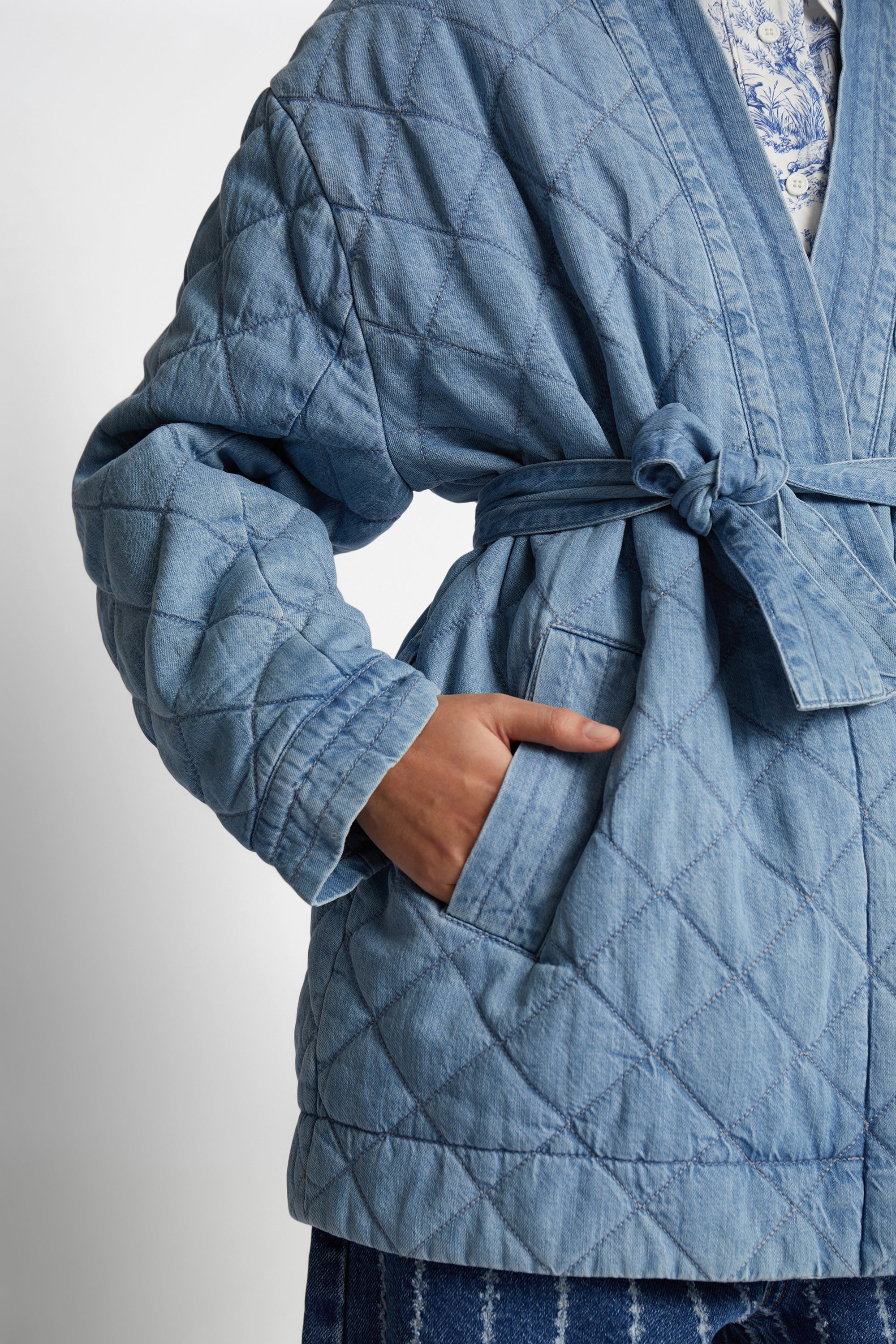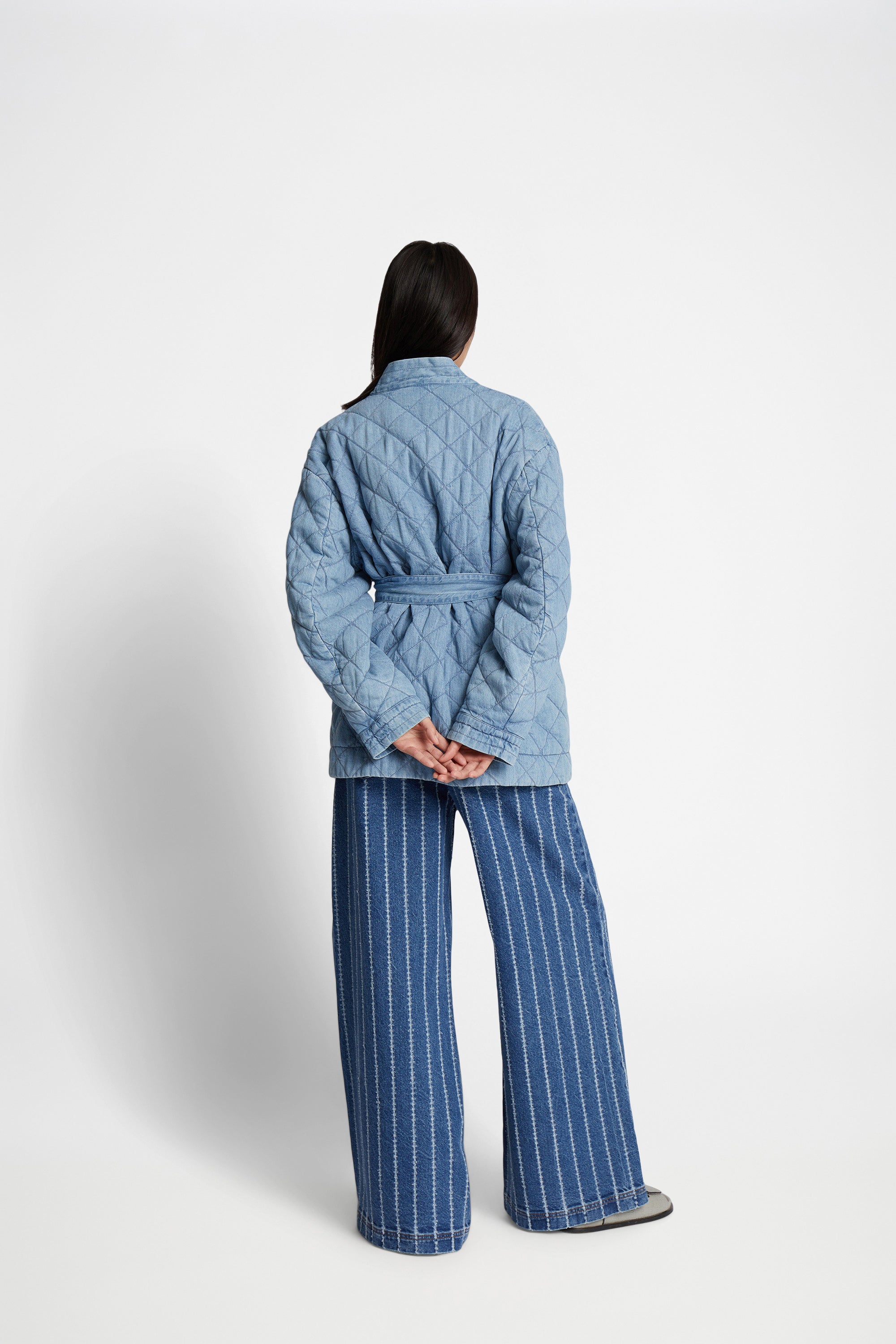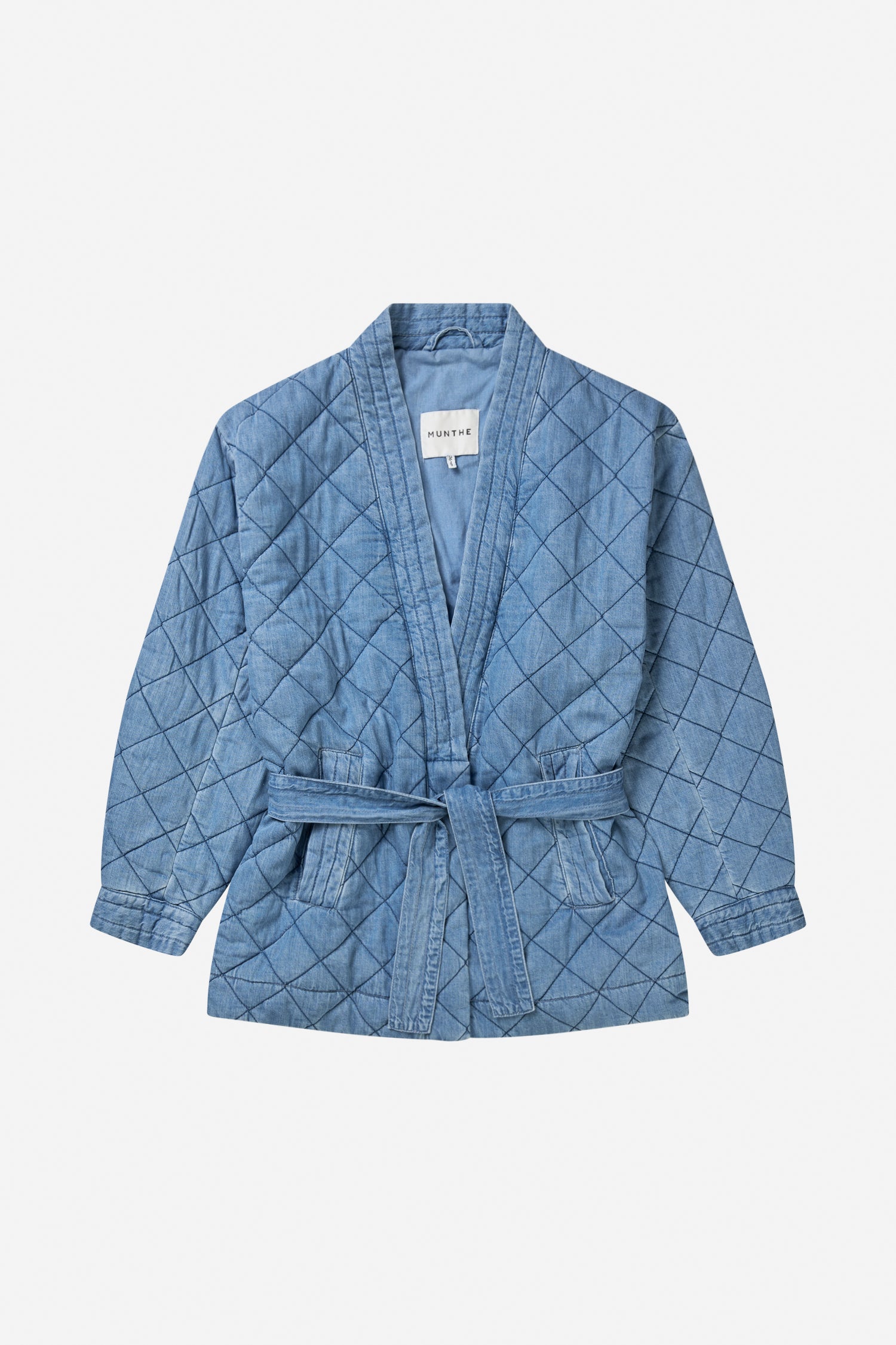 Elegant quilted denim jacket with semi-wide sleeves, a flattering belted waist, and side pockets. The jacket comes with a belt and is designed for a loose fit.
