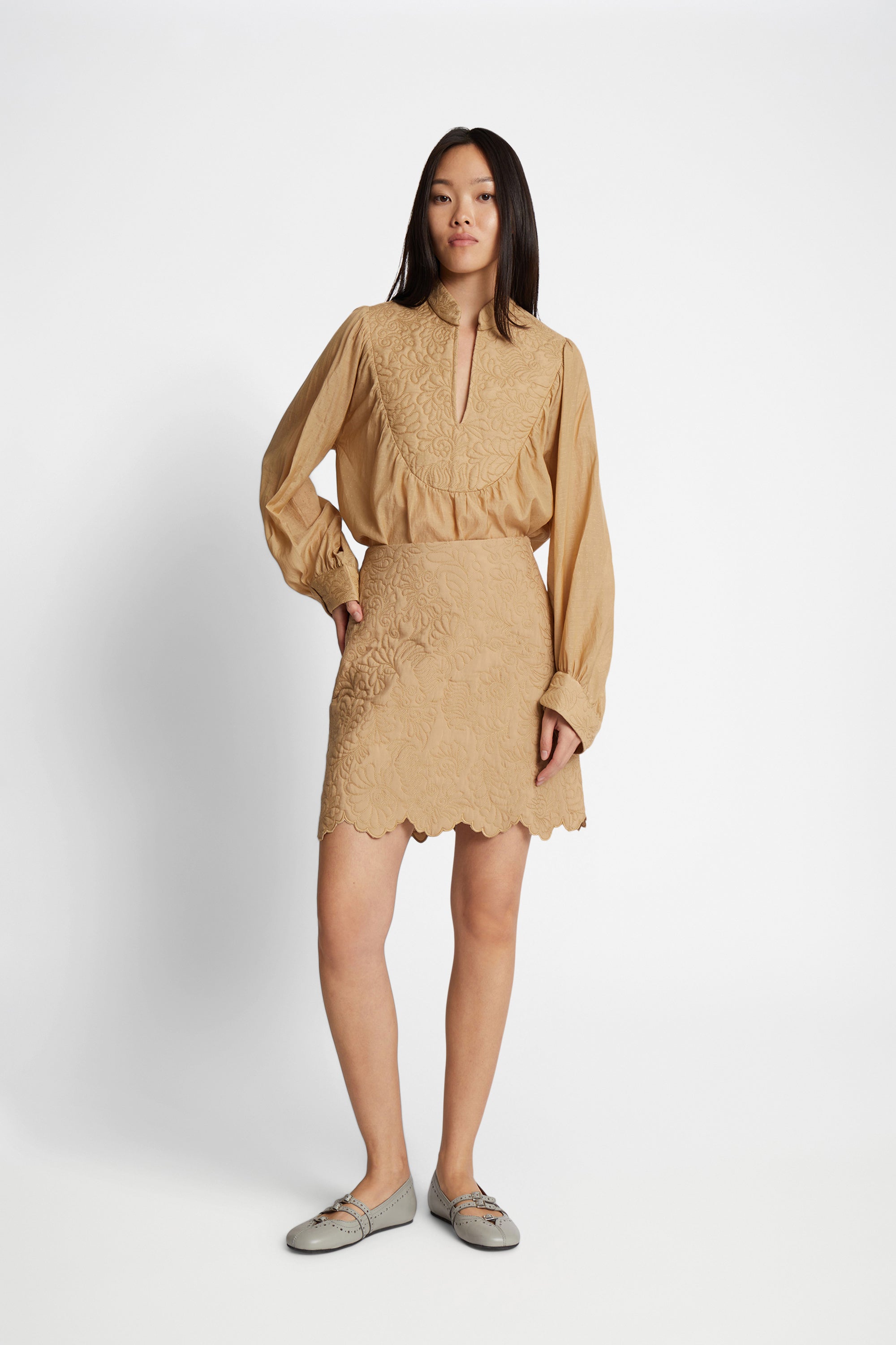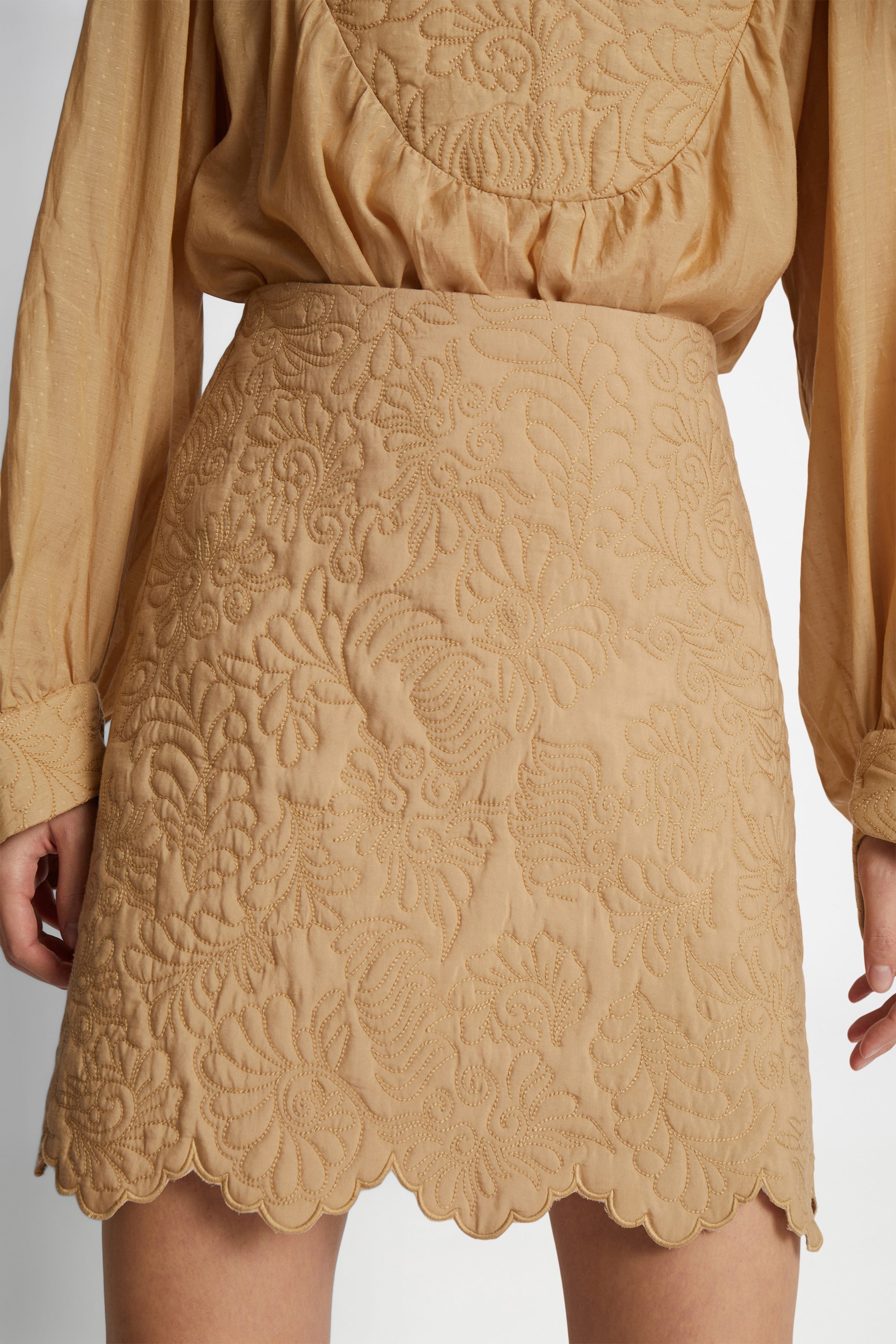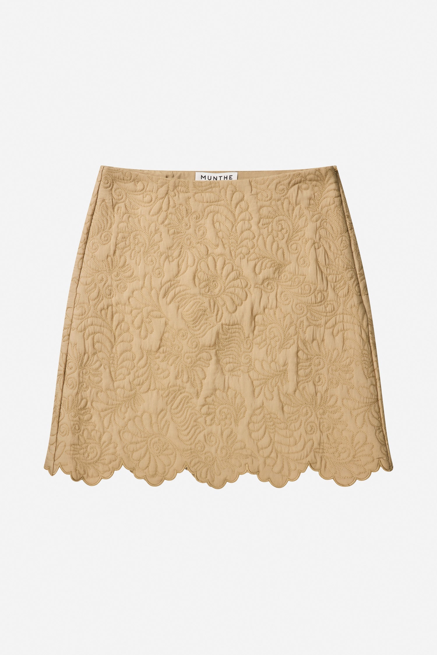 A short skirt with an elegant quilted flower embroidery, designed with a beautiful wavy finish around the edge of the skirt. The skirt has a zip closure and is made from an organic cotton blend.