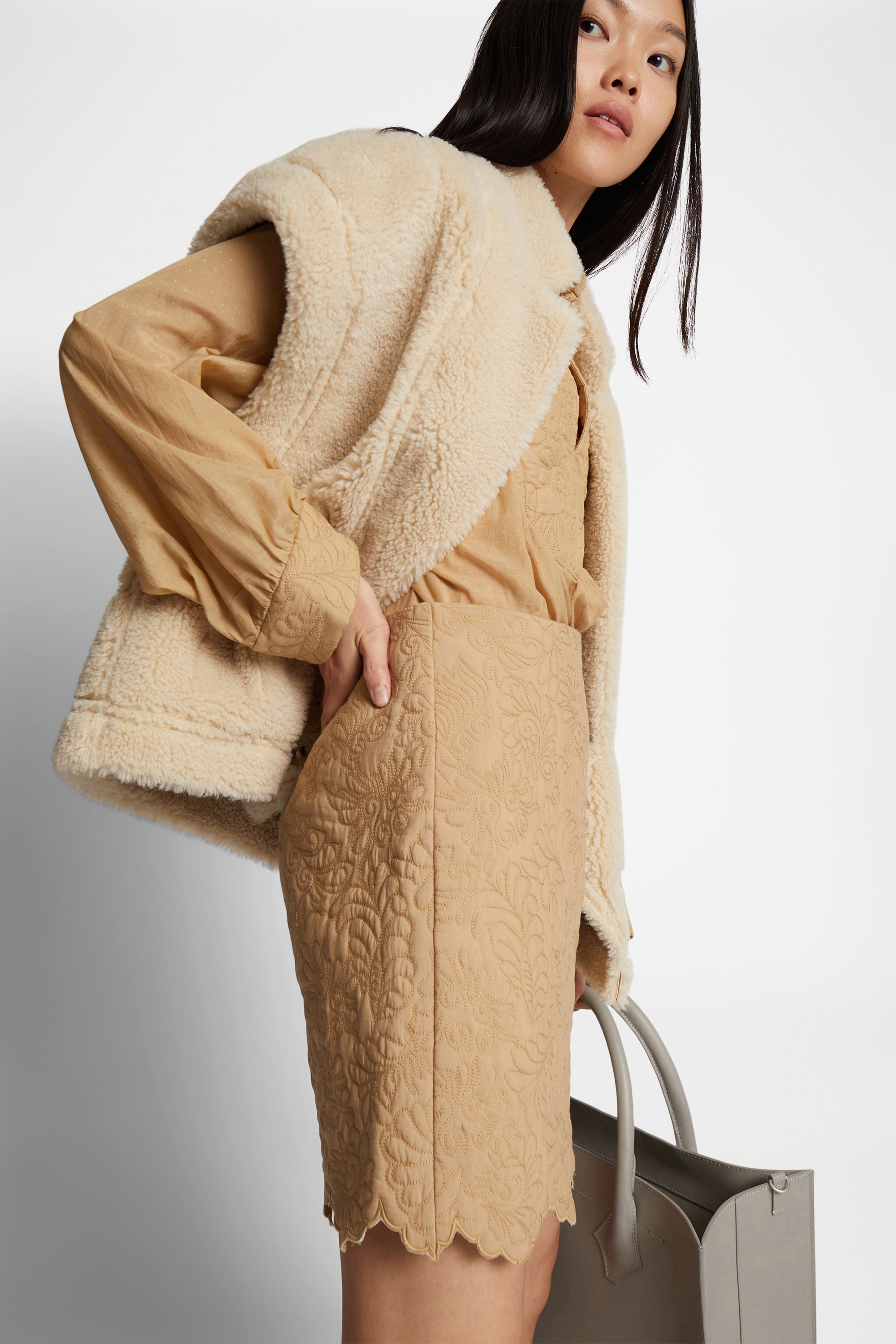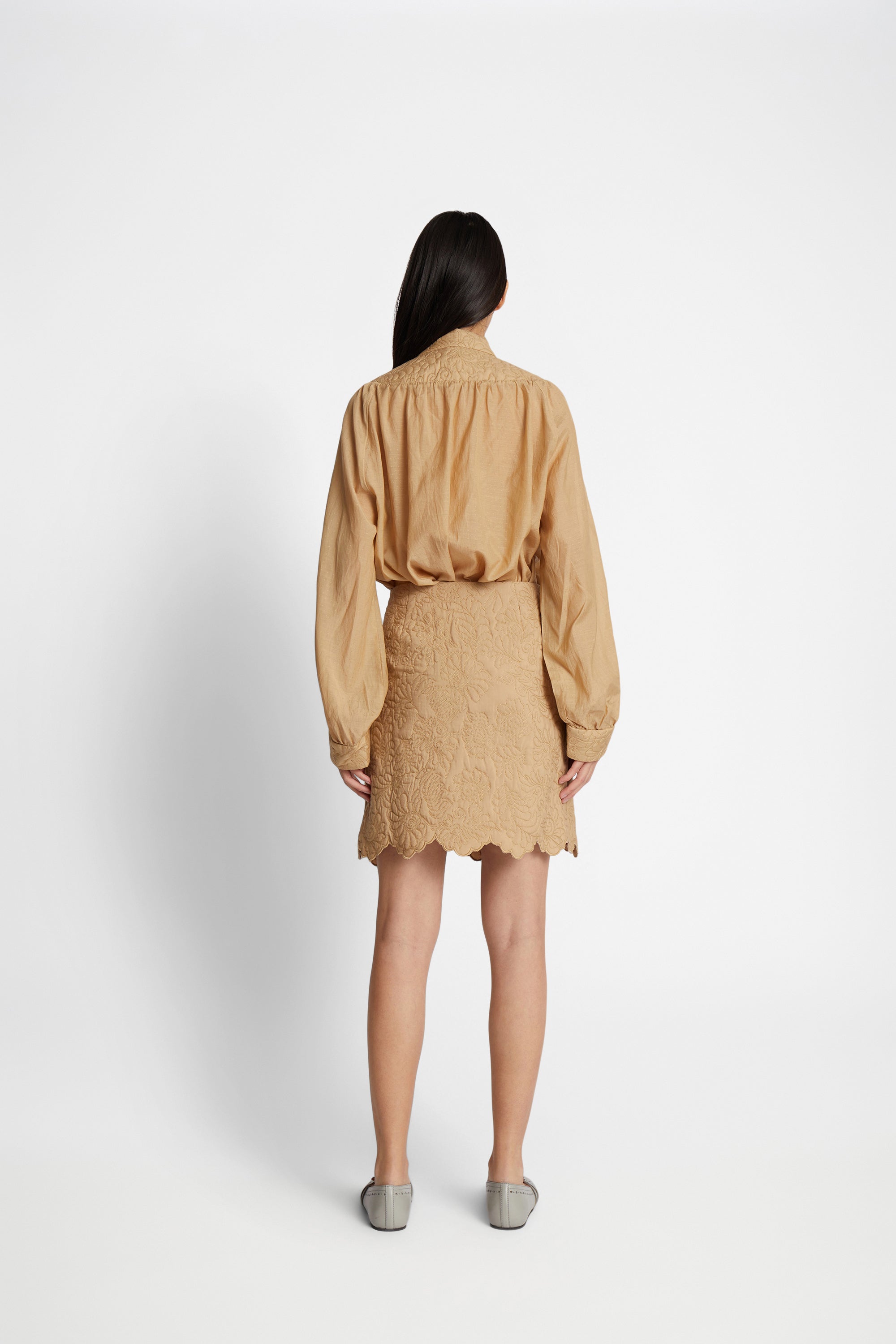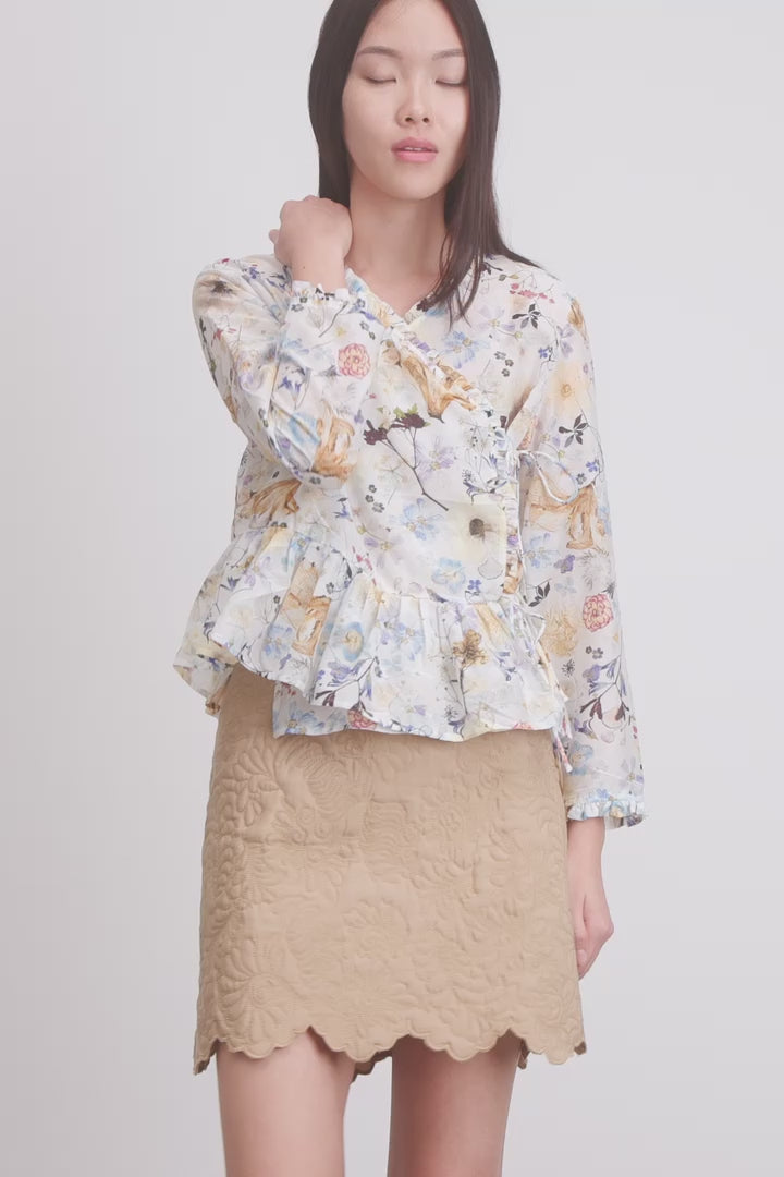 A short skirt with an elegant quilted flower embroidery, designed with a beautiful wavy finish around the edge of the skirt. The skirt has a zip closure and is made from an organic cotton blend.