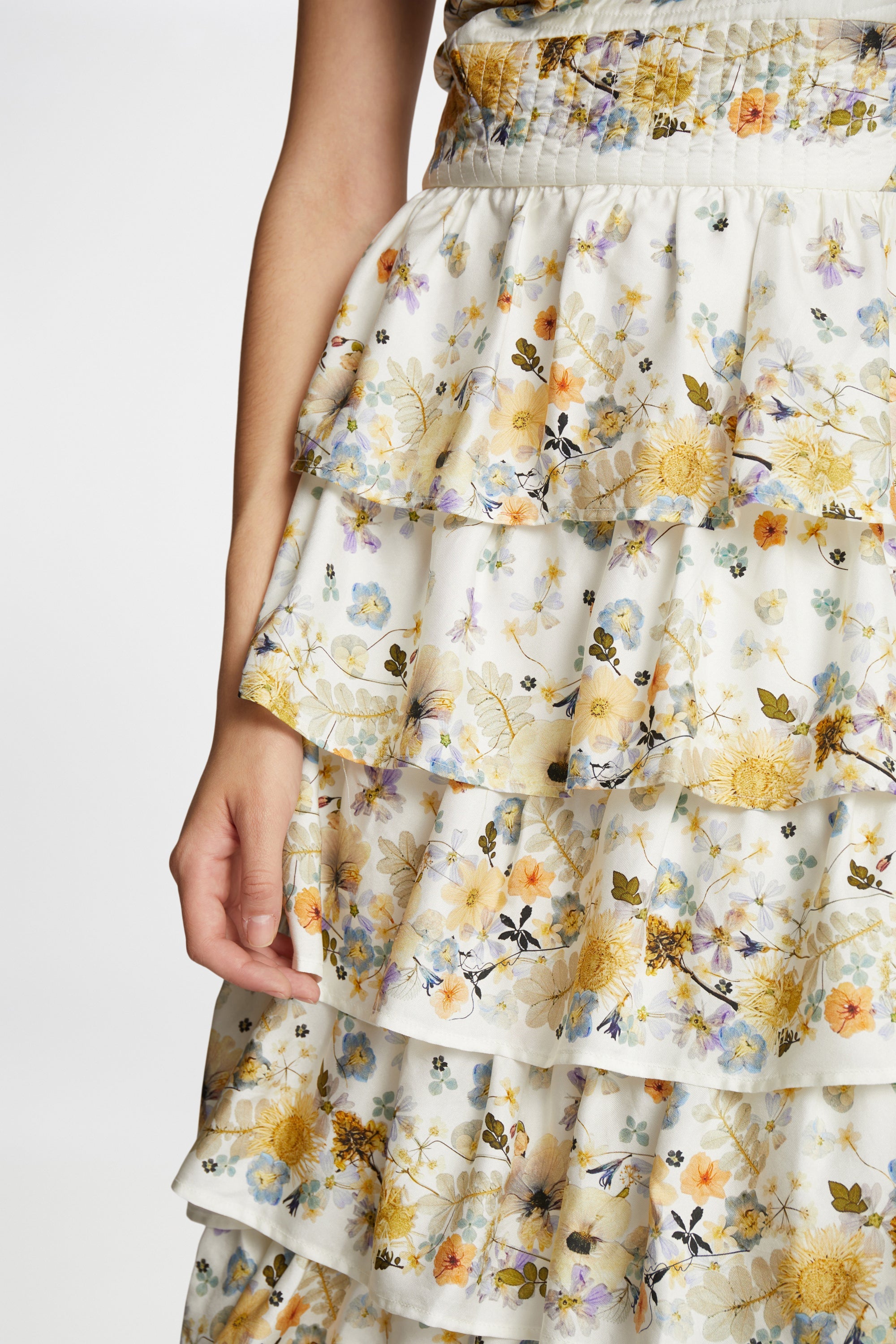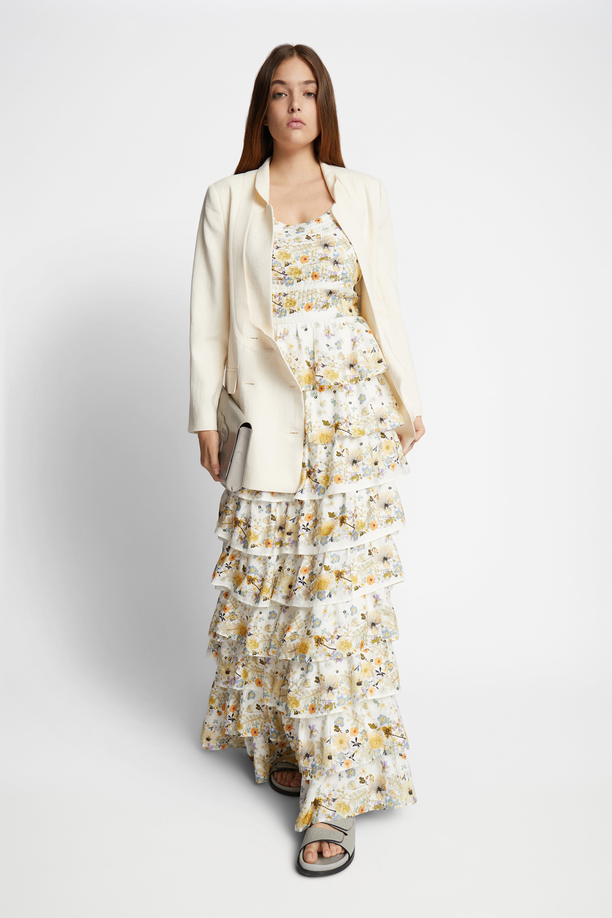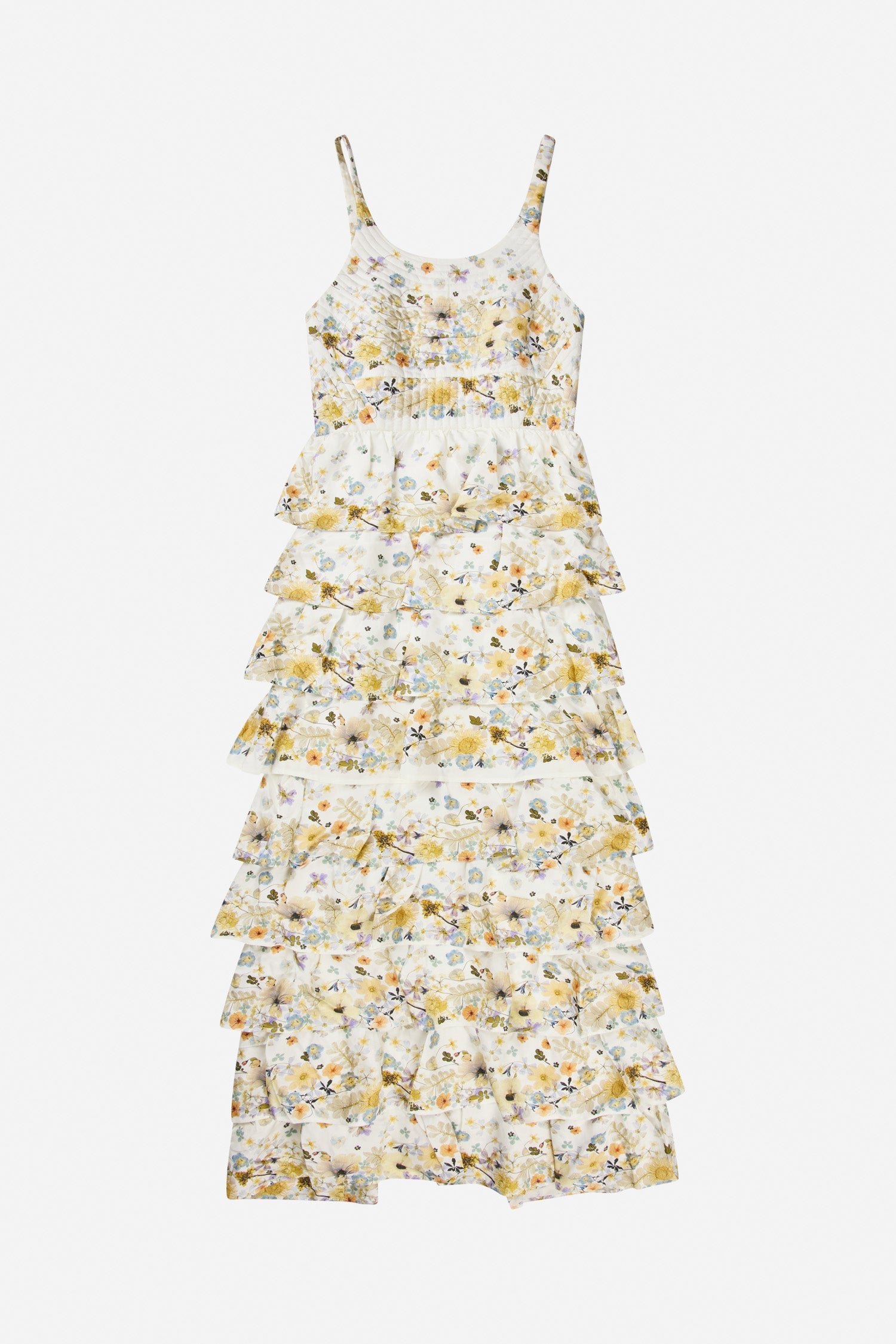 A long, beautiful layered dress, made from 100% silk and designed with an elegant all-over print, made from flowers Naja Munthe has planted in her own garden. This dress has a fitted chest and waist with elegant details and a zip closure on the back.