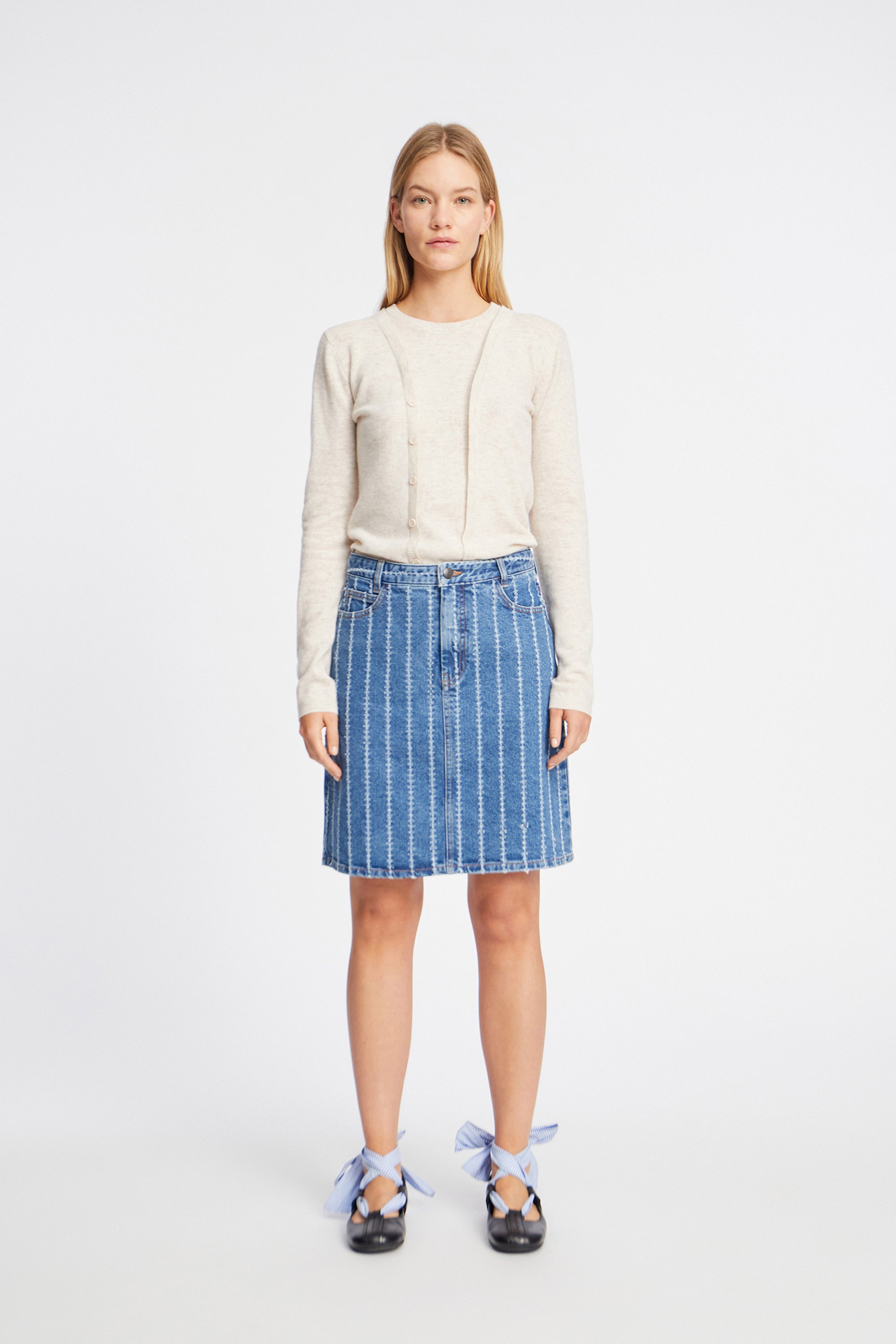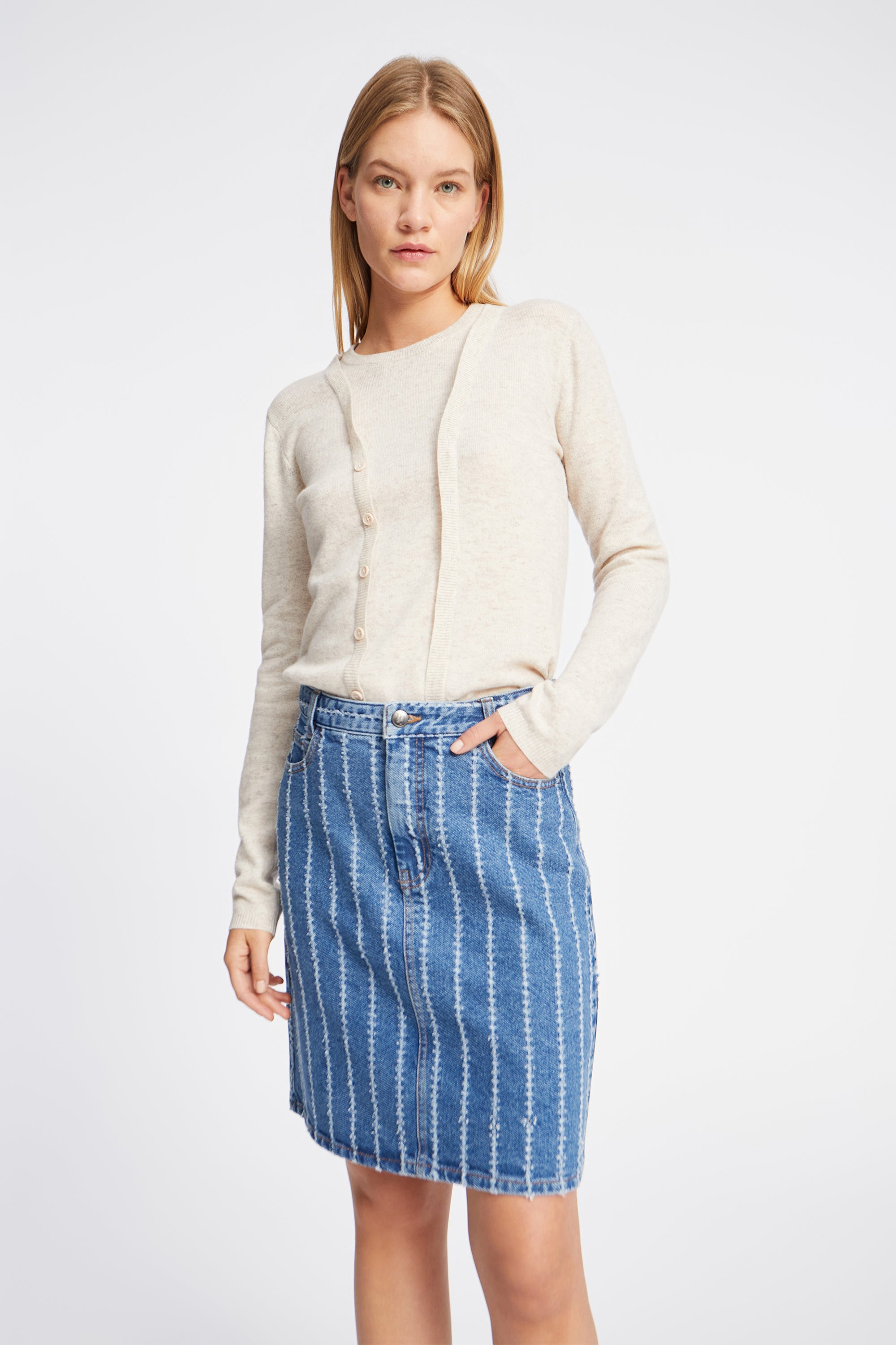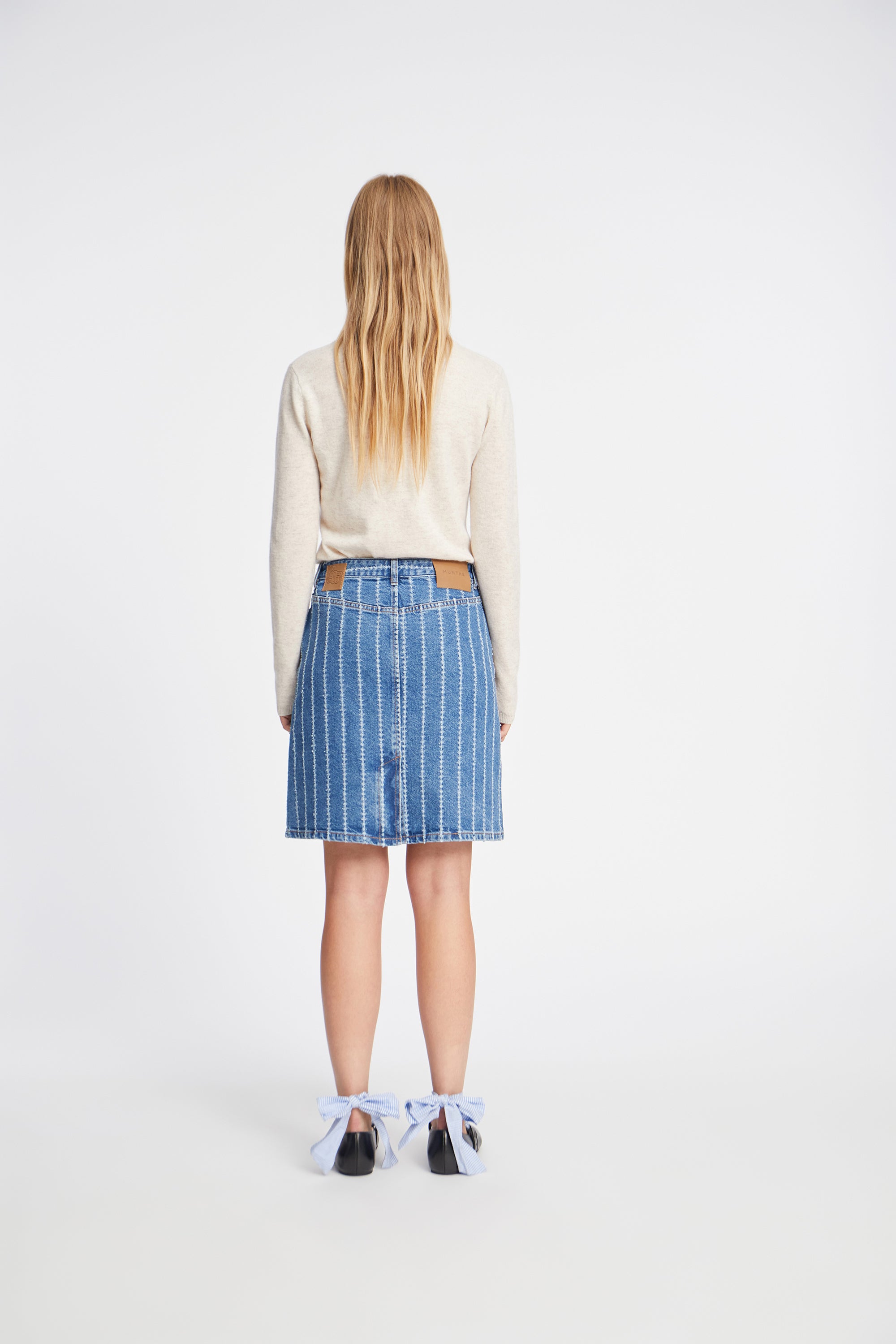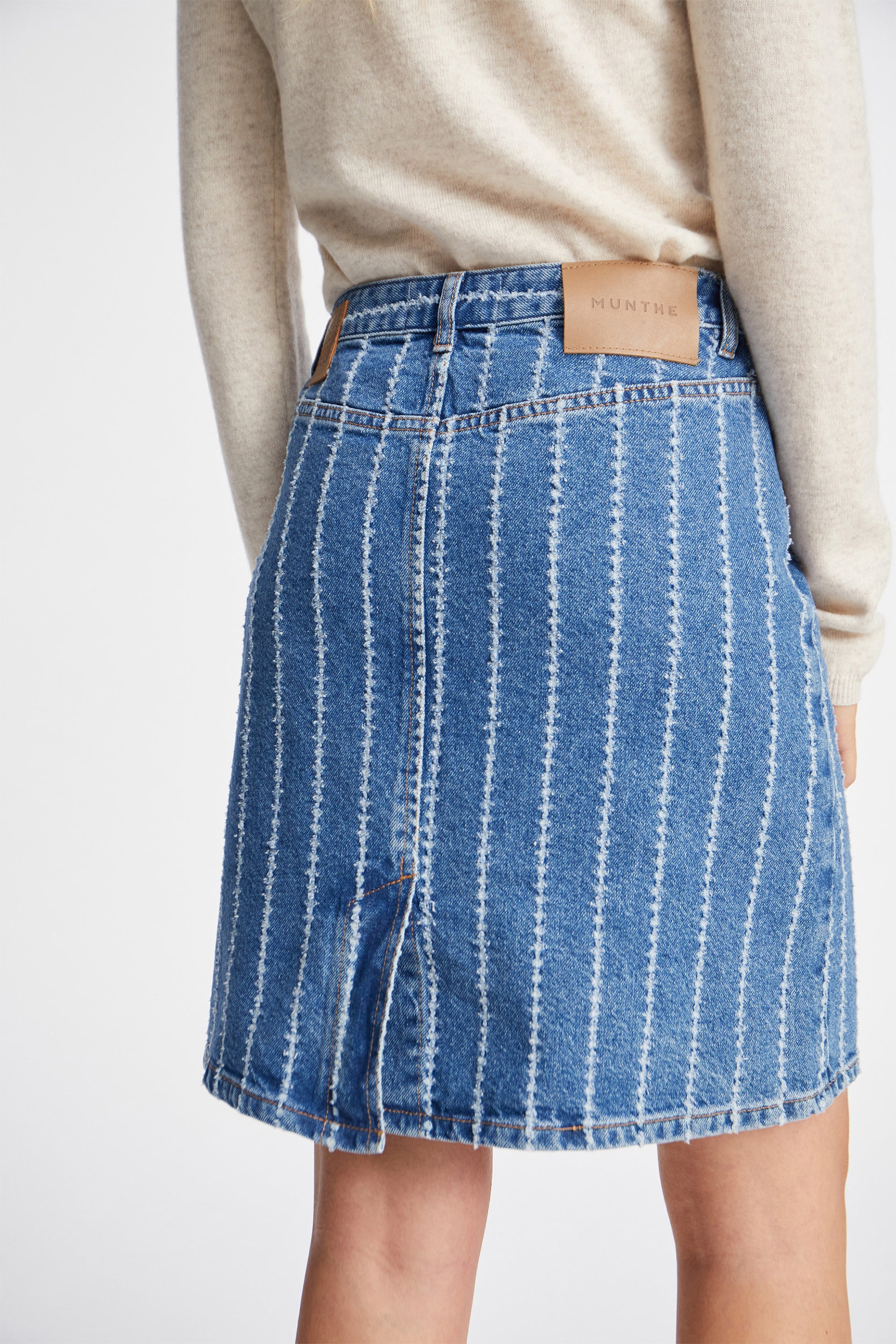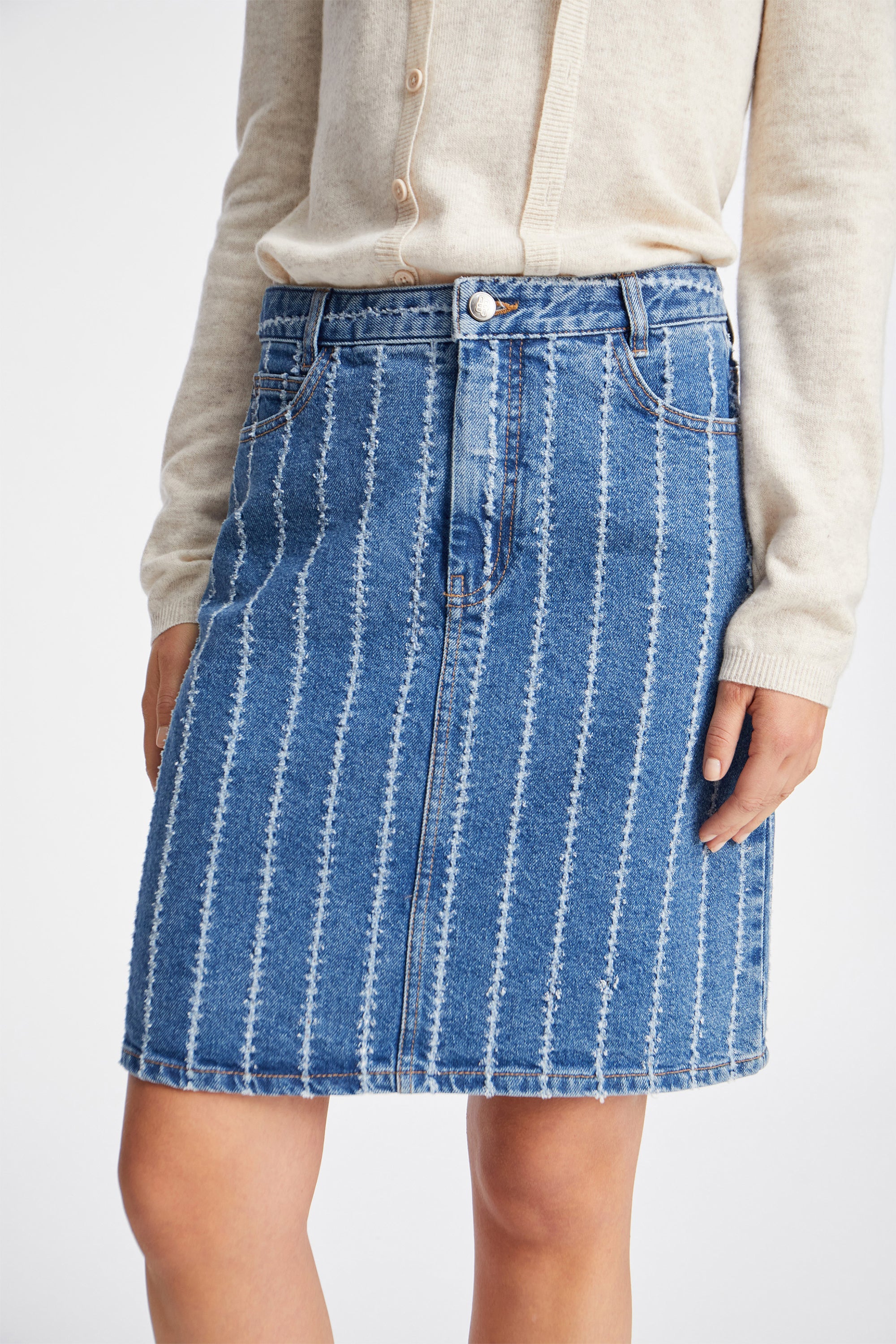A beautiful short pinstriped denim skirt. This skirt is designed with pockets, a button and zip closure, and a regular fit.