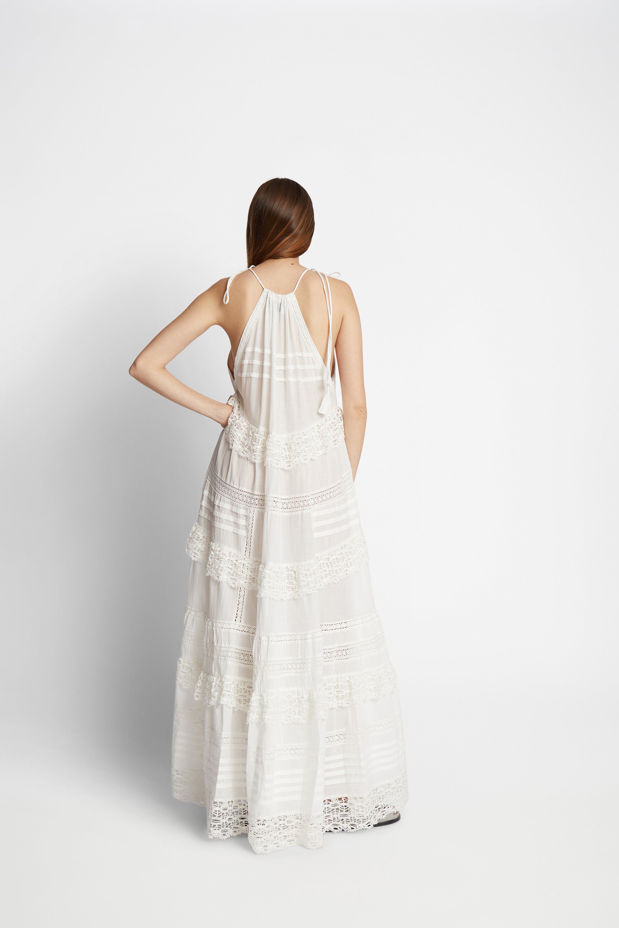 A beautiful long dress, decorated with elegant crocheted ribbons and a tie string detail at the shoulders. This dress is made from an organic cotton blend.