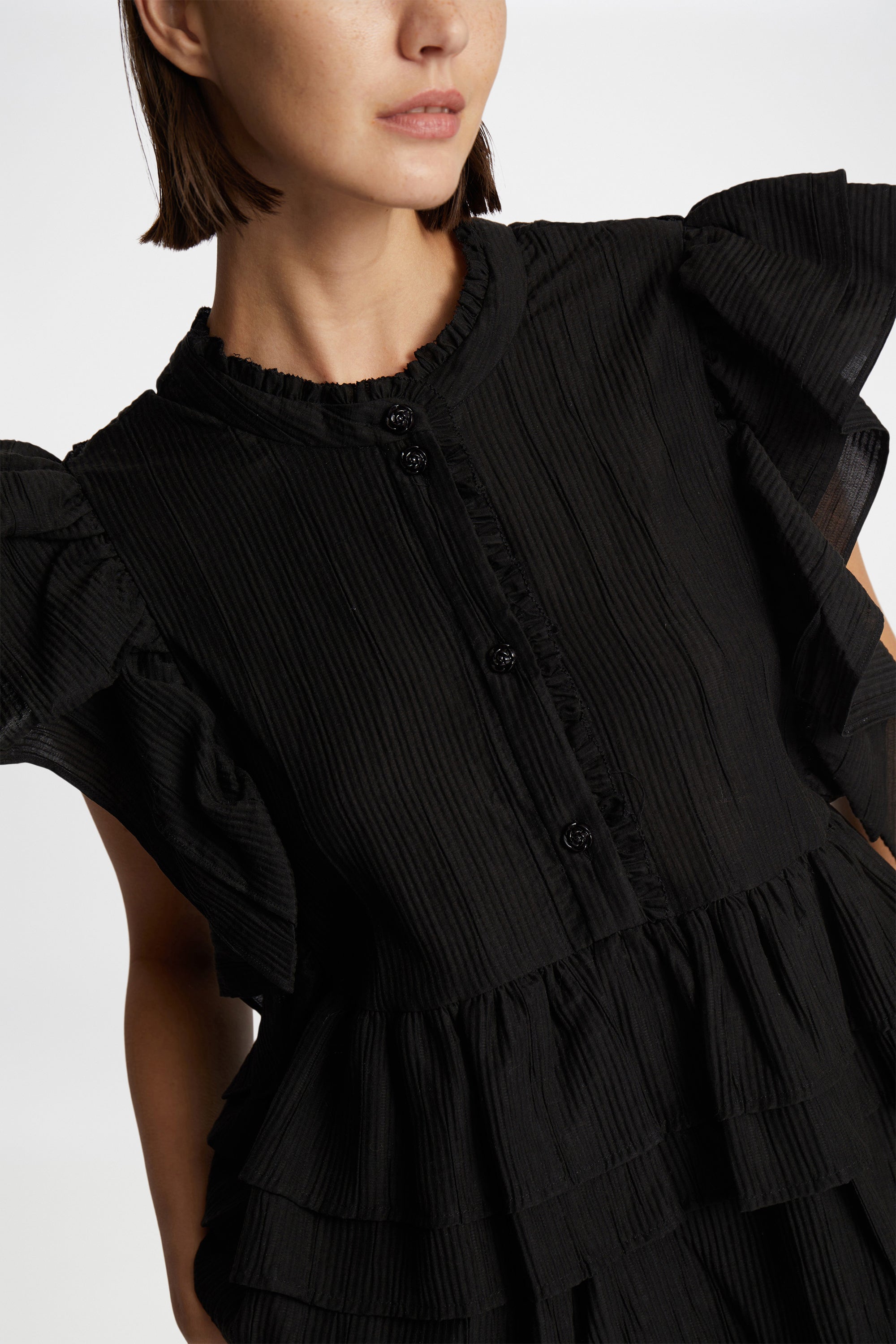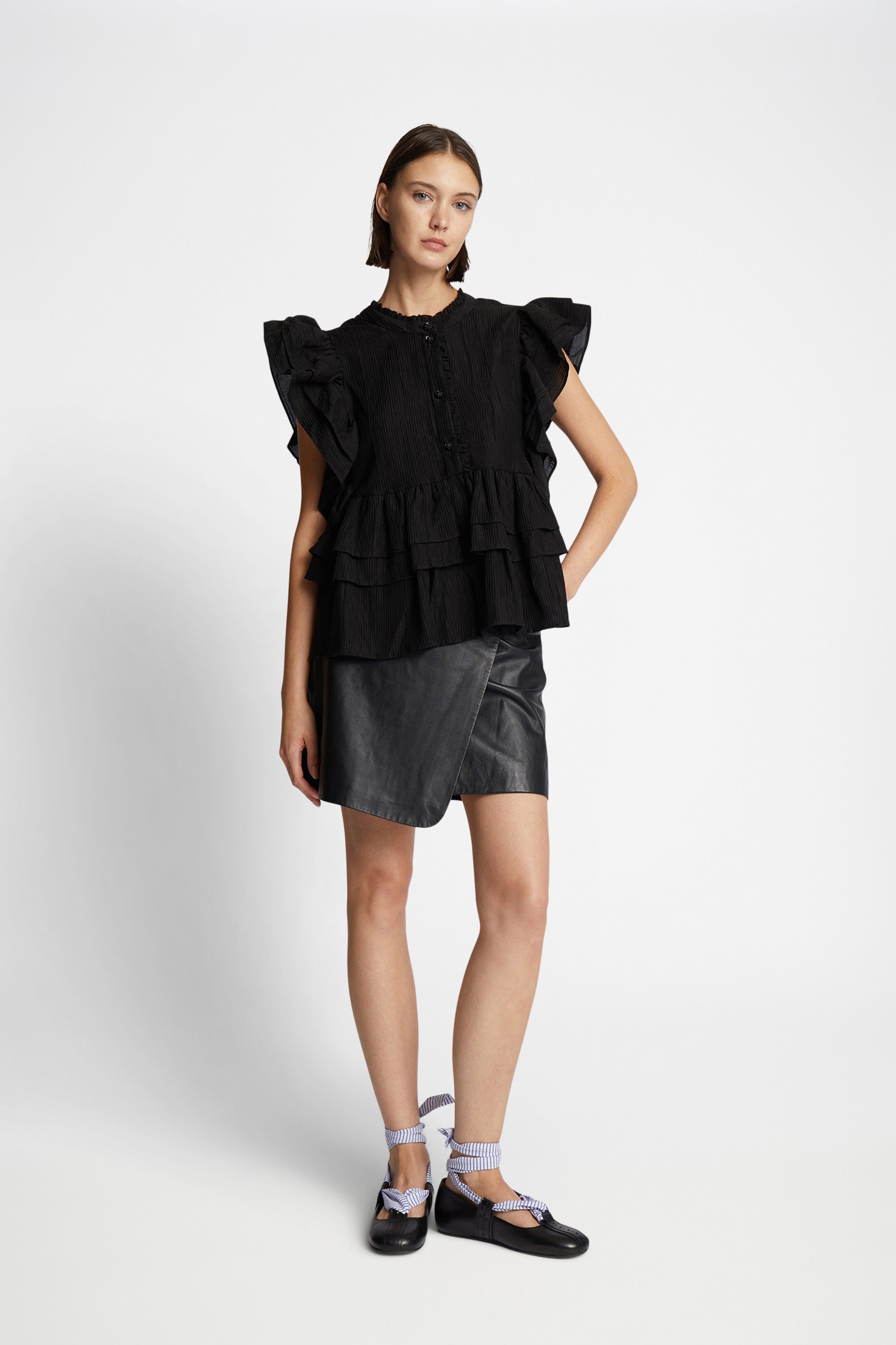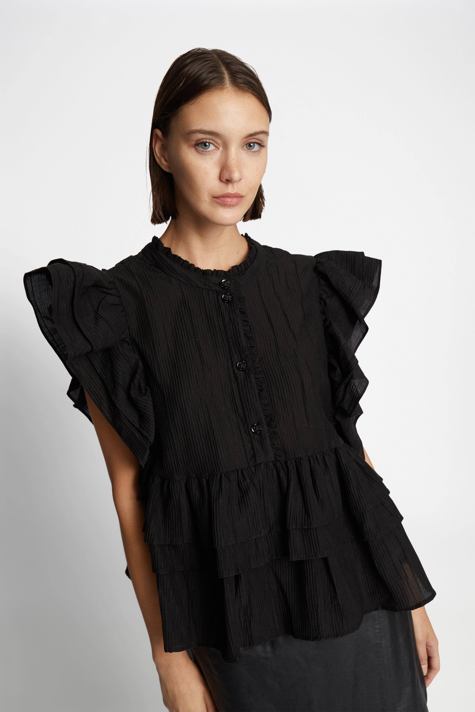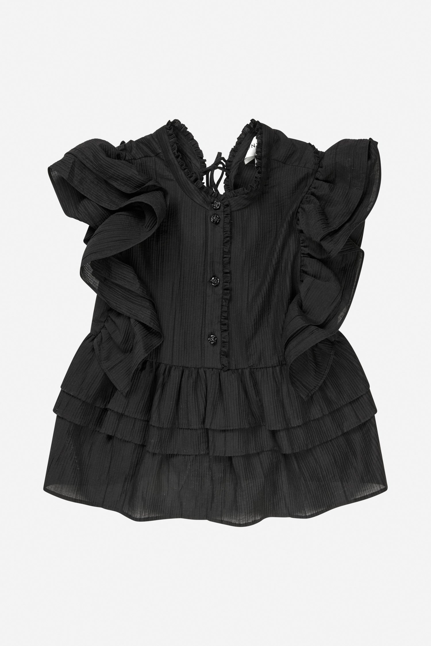 Blouse designed with elegant ruffle details on the sleeves and at the bottom. The blouse has a beautiful tie-string closure on the back.