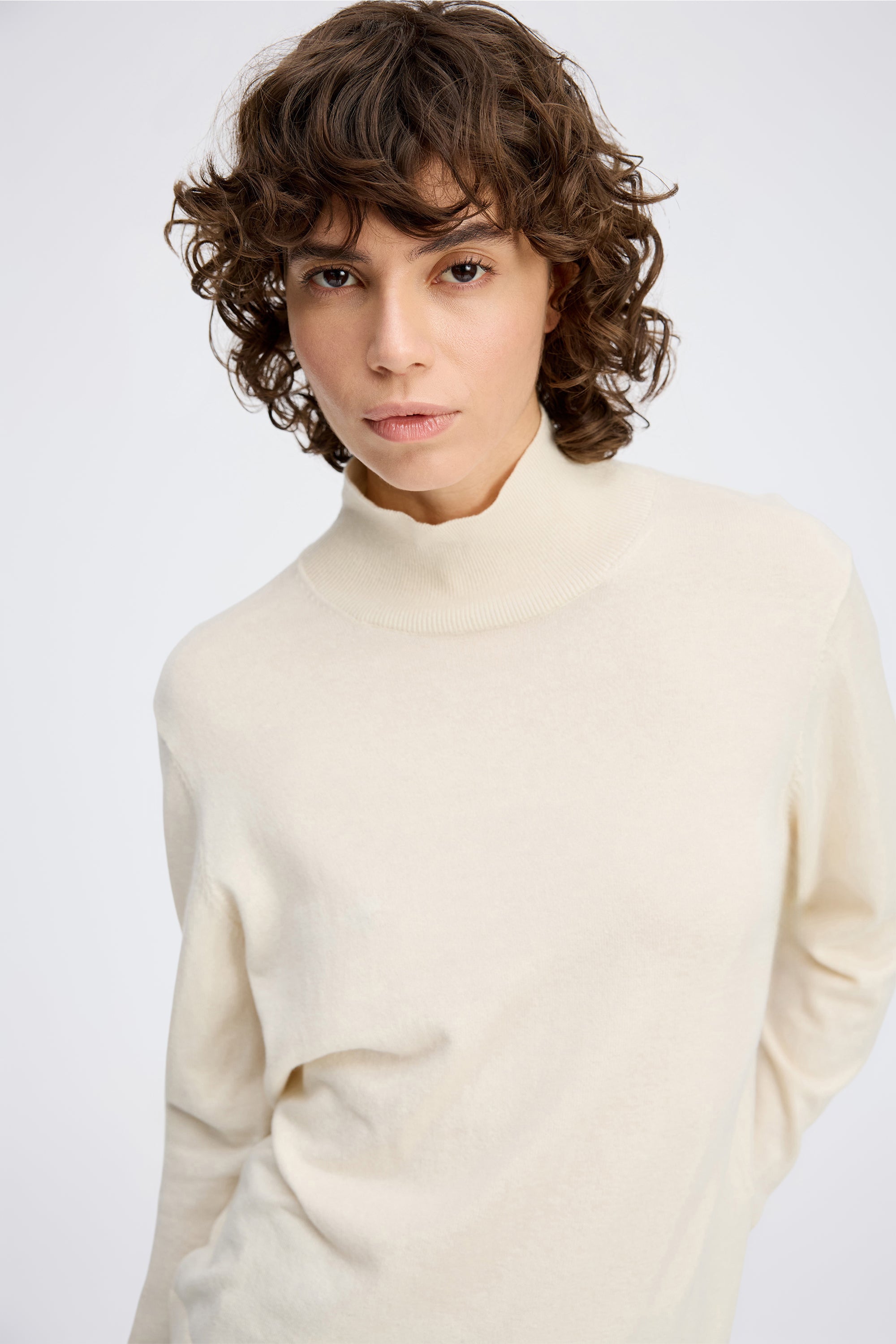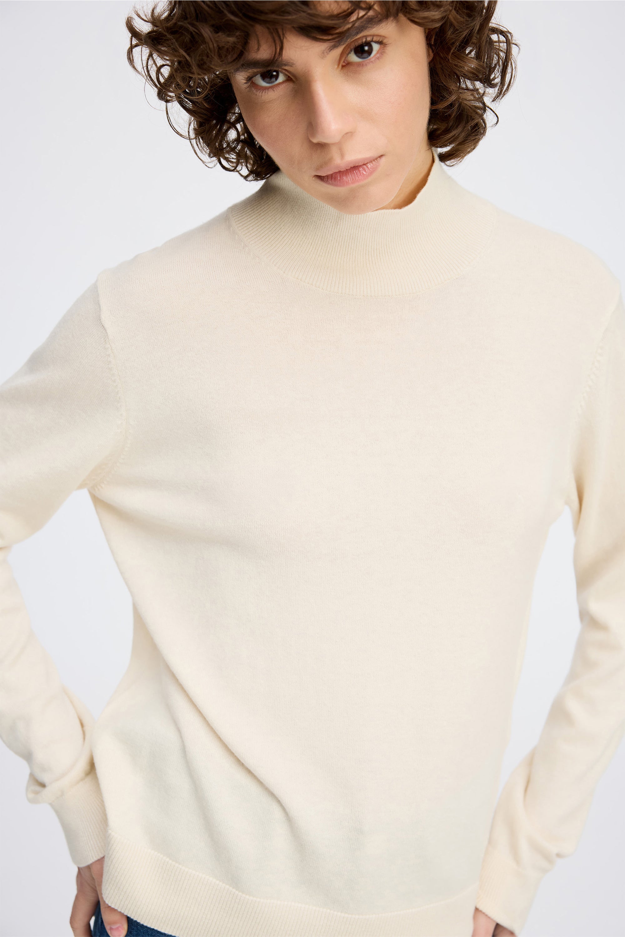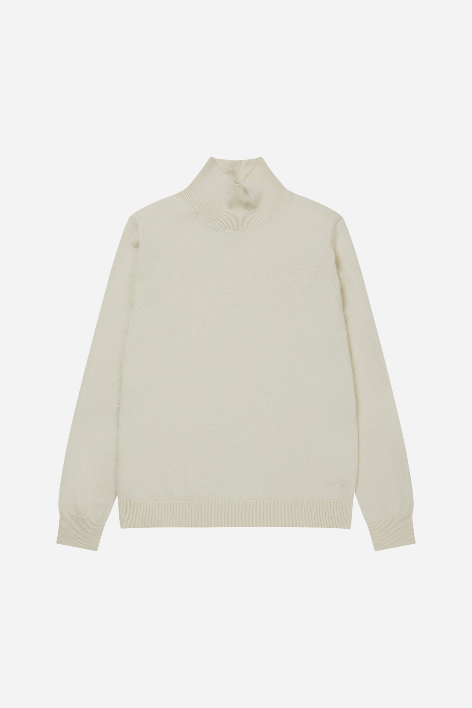 Classic light knit made from a soft merino wool blend. This knit has long sleeves, a t-neck, and an elegant rib along the edges.