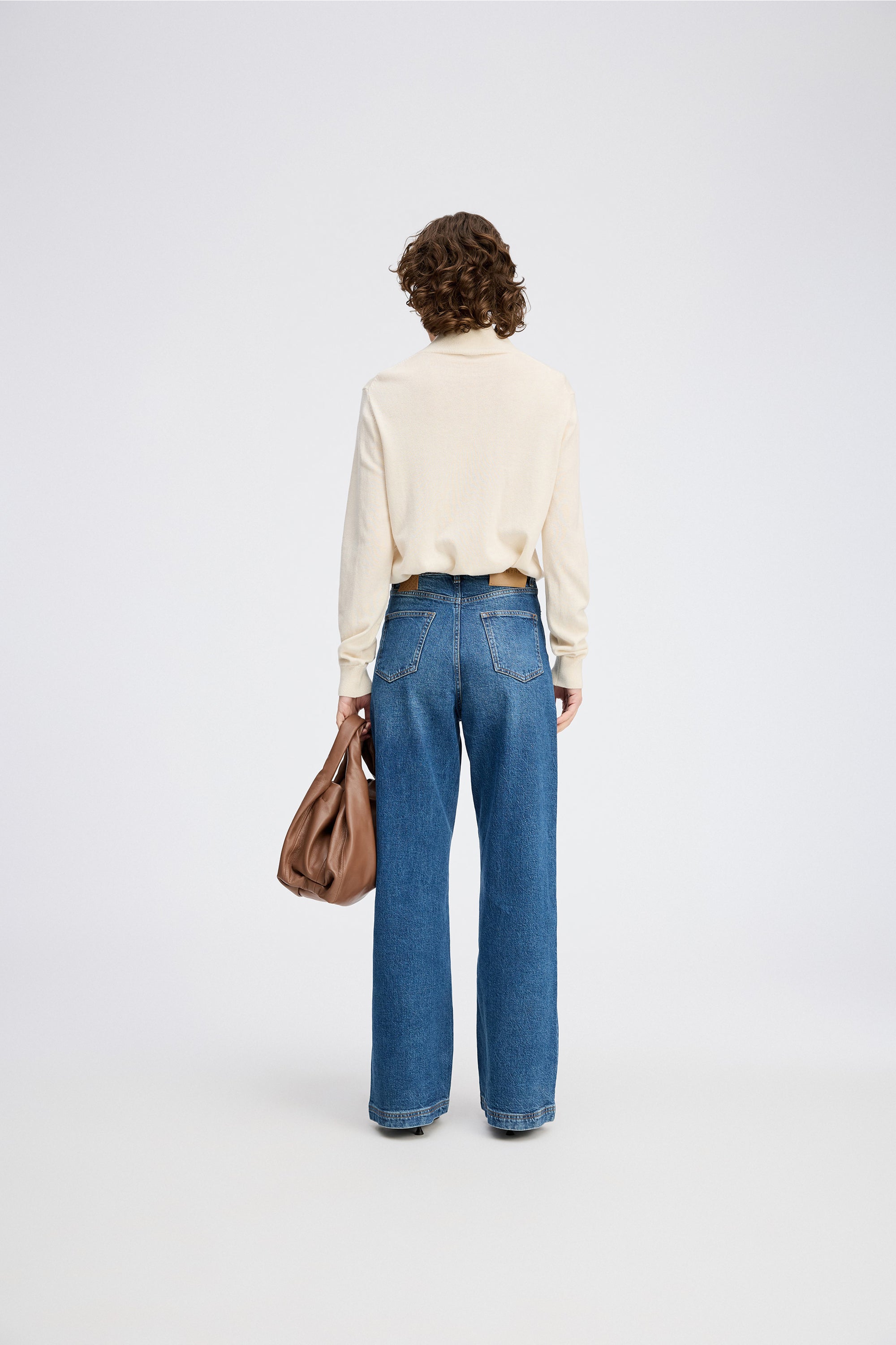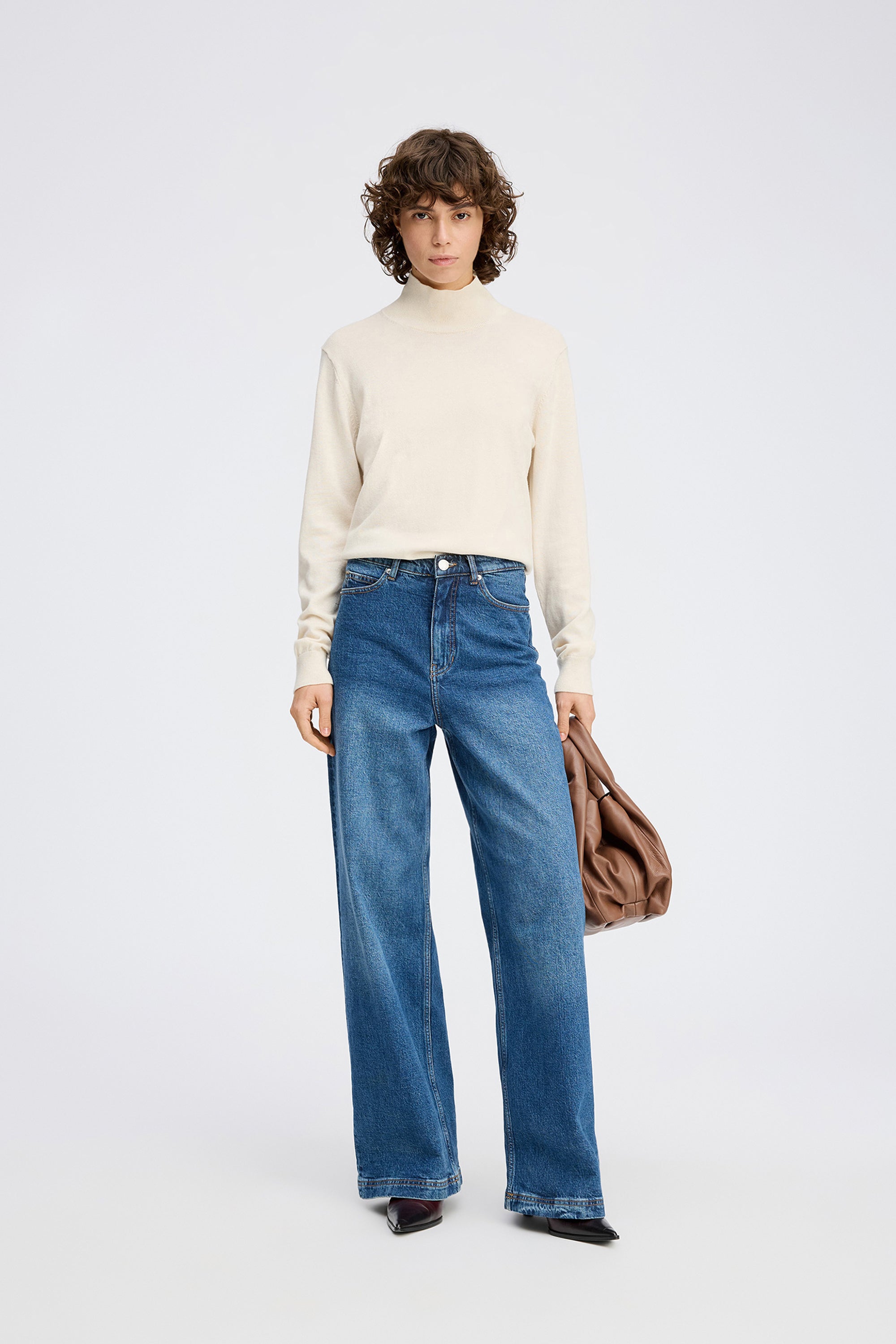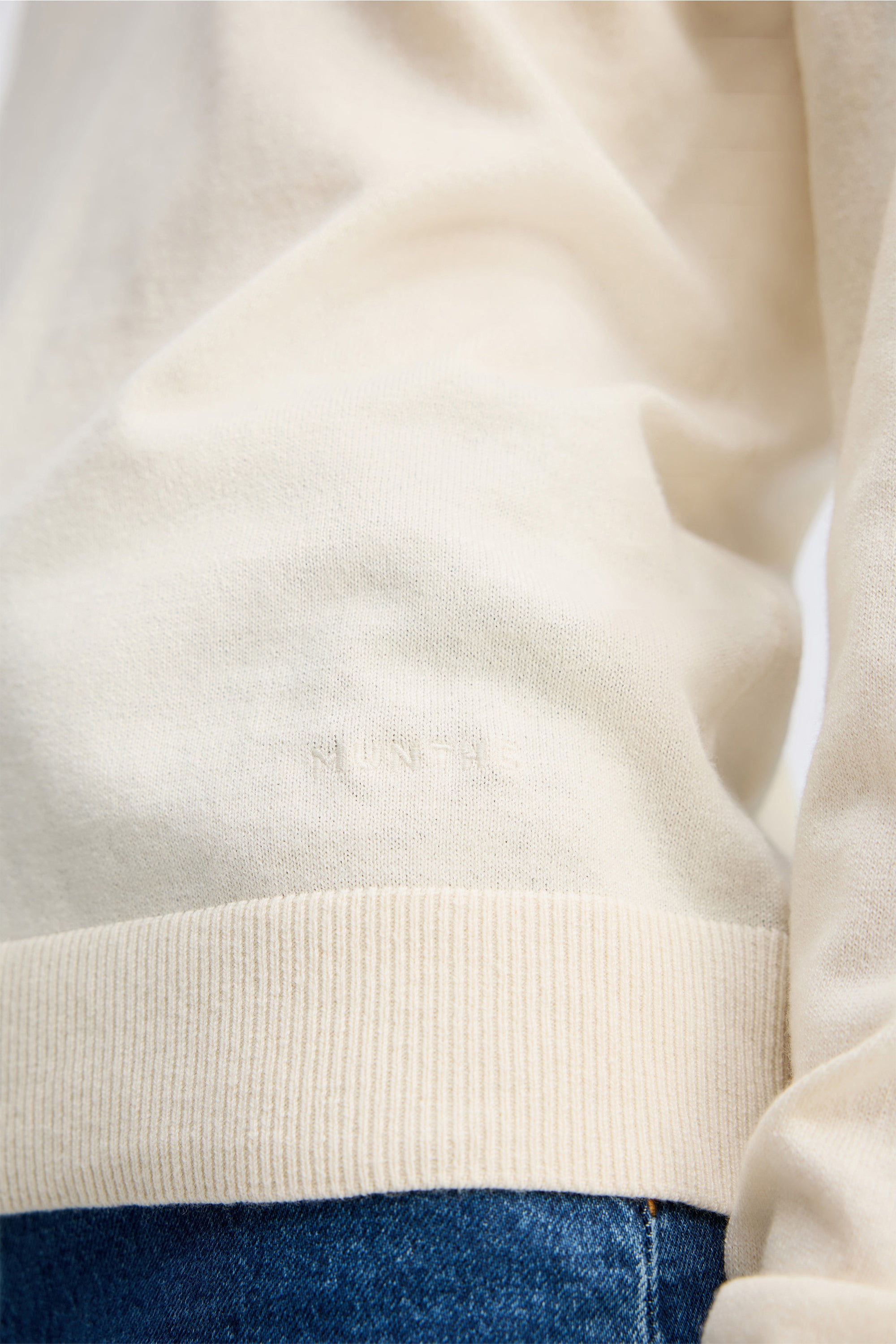 Classic light knit made from a soft merino wool blend. This knit has long sleeves, a t-neck, and an elegant rib along the edges.