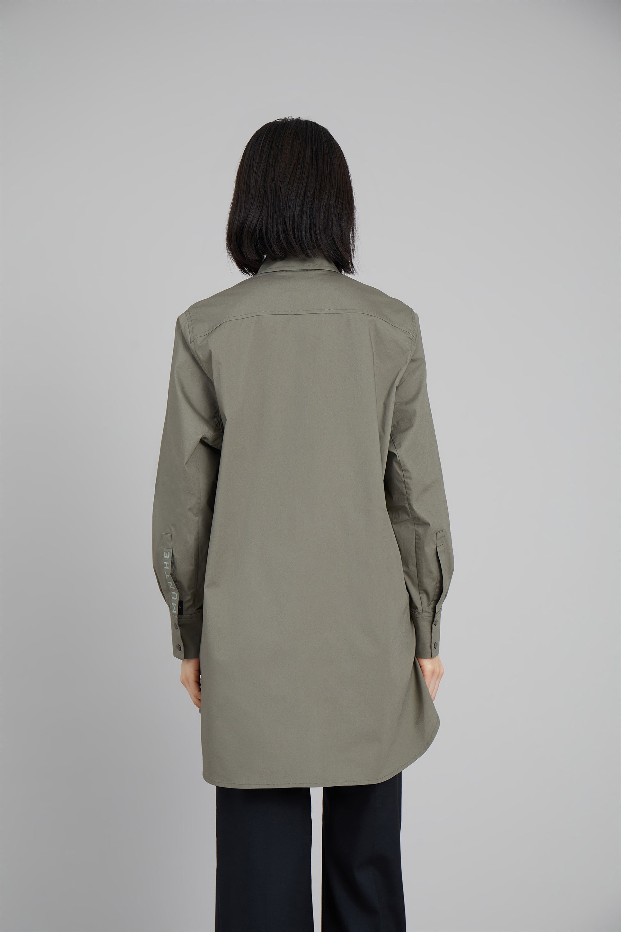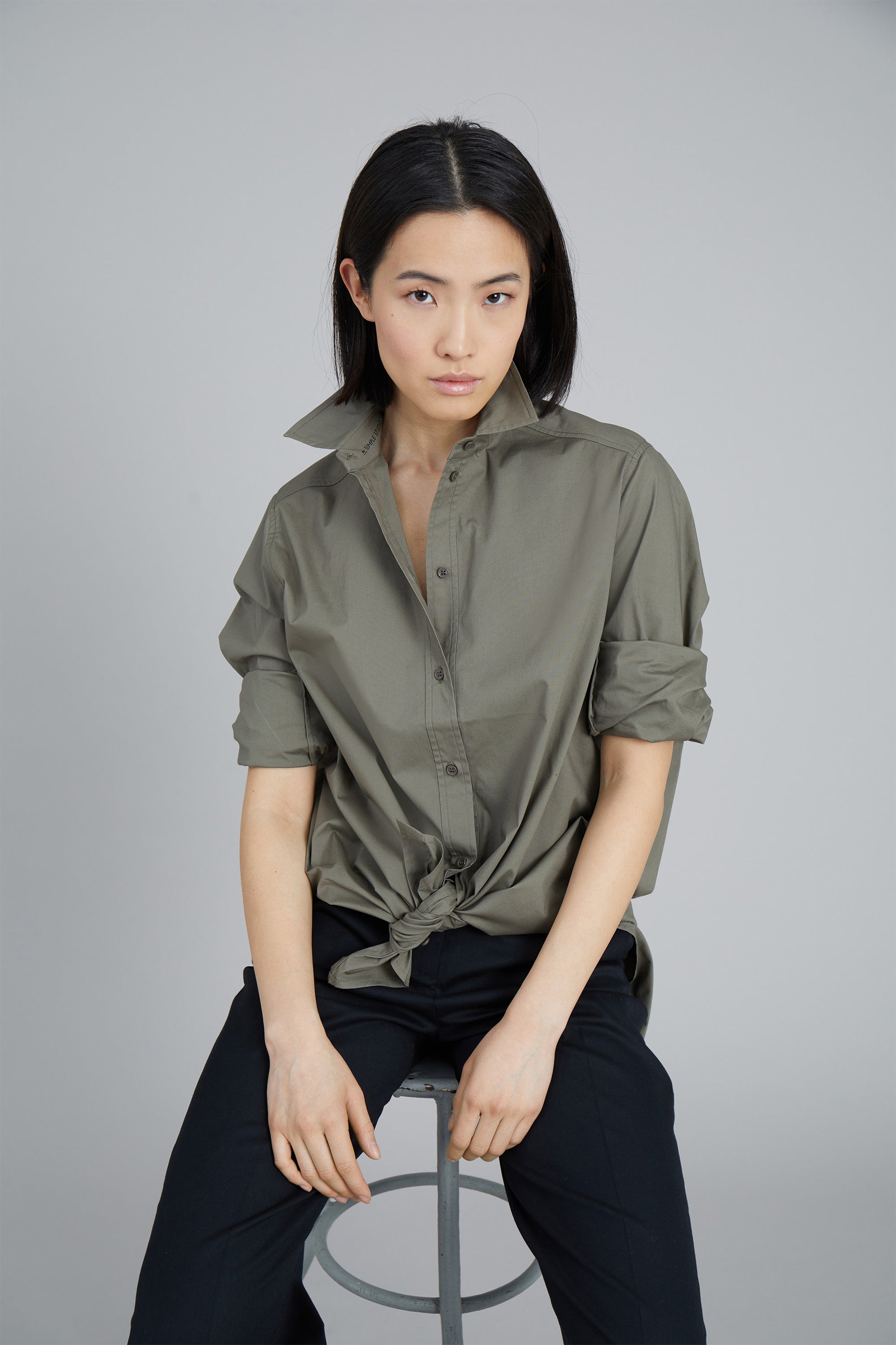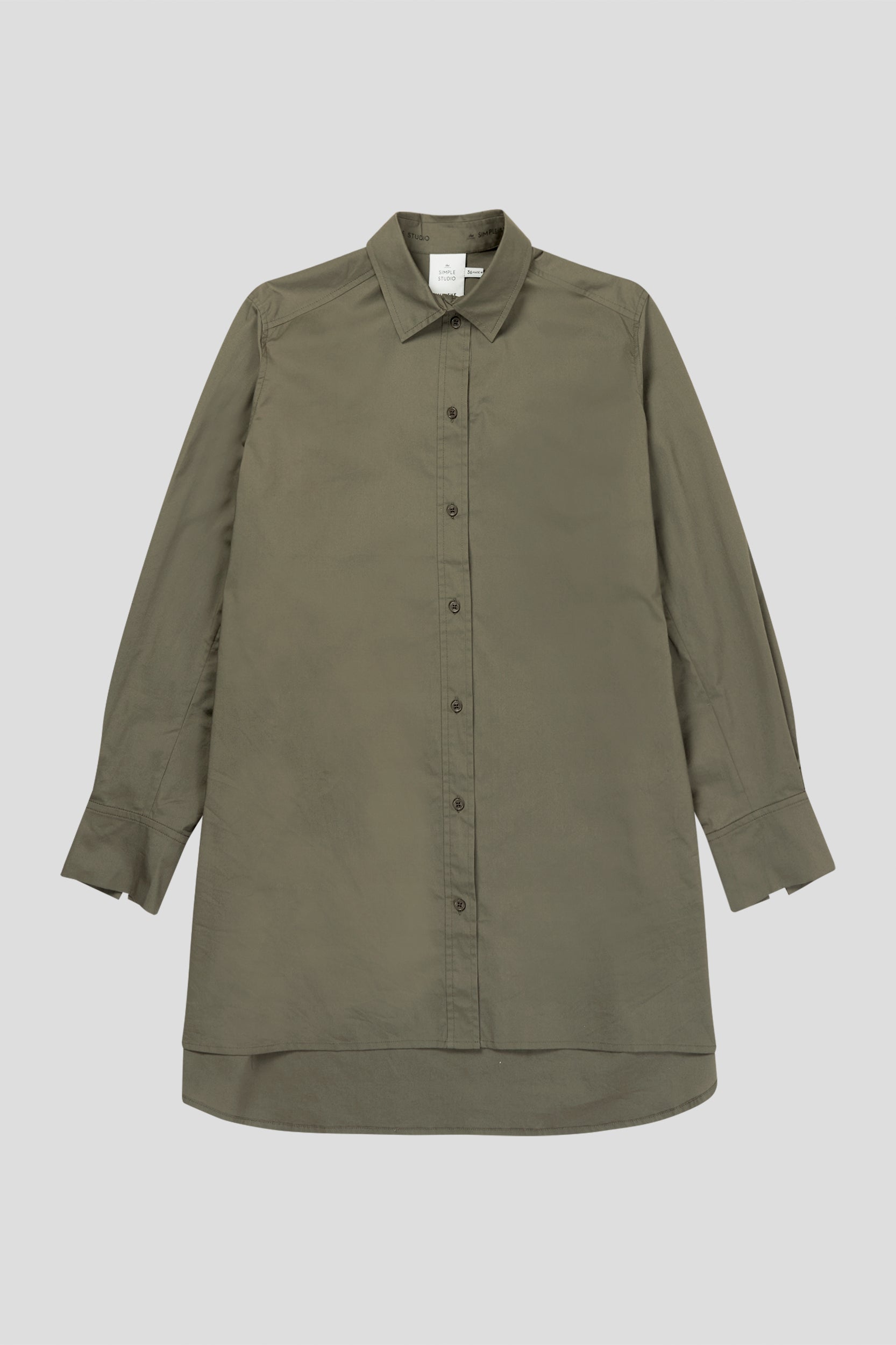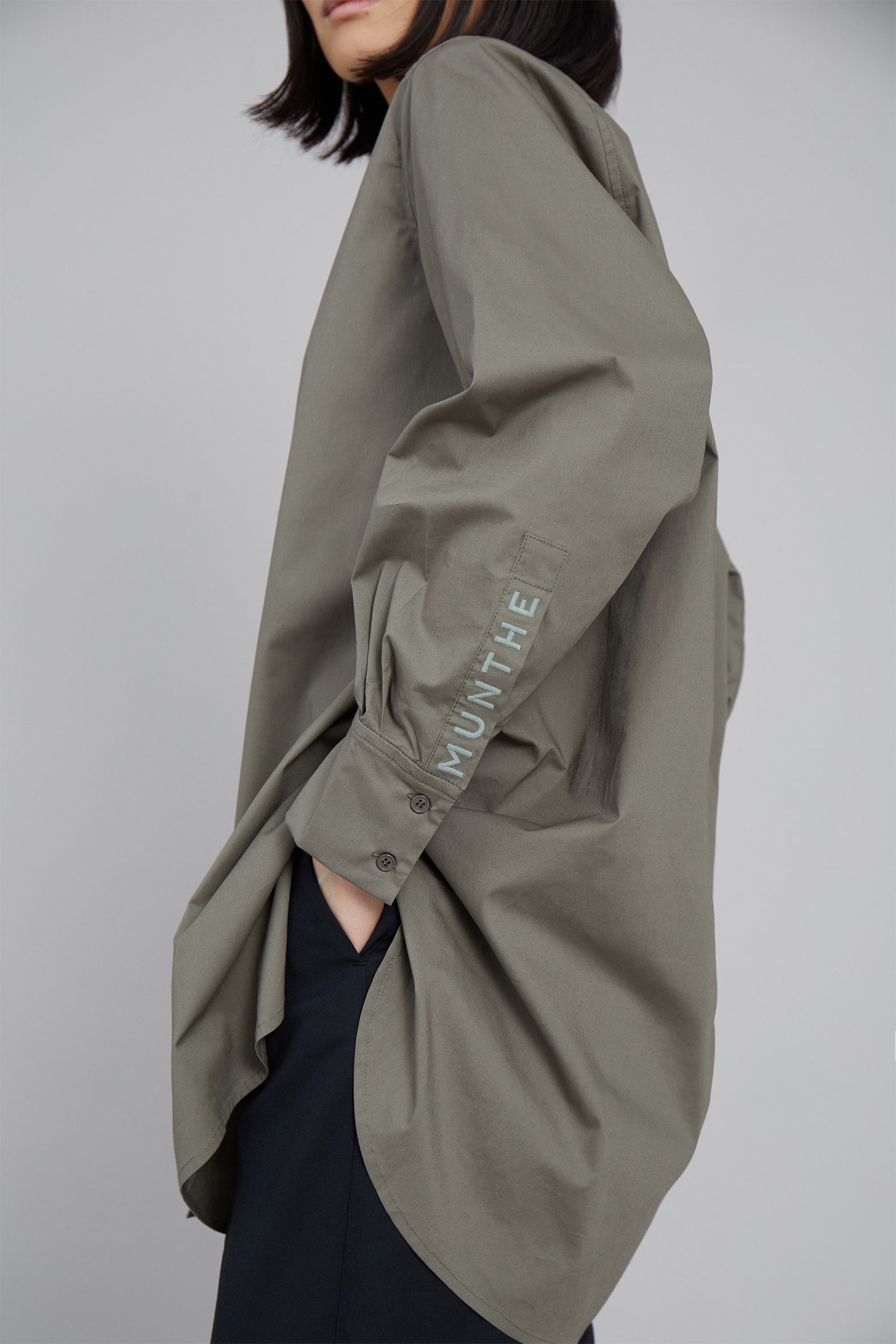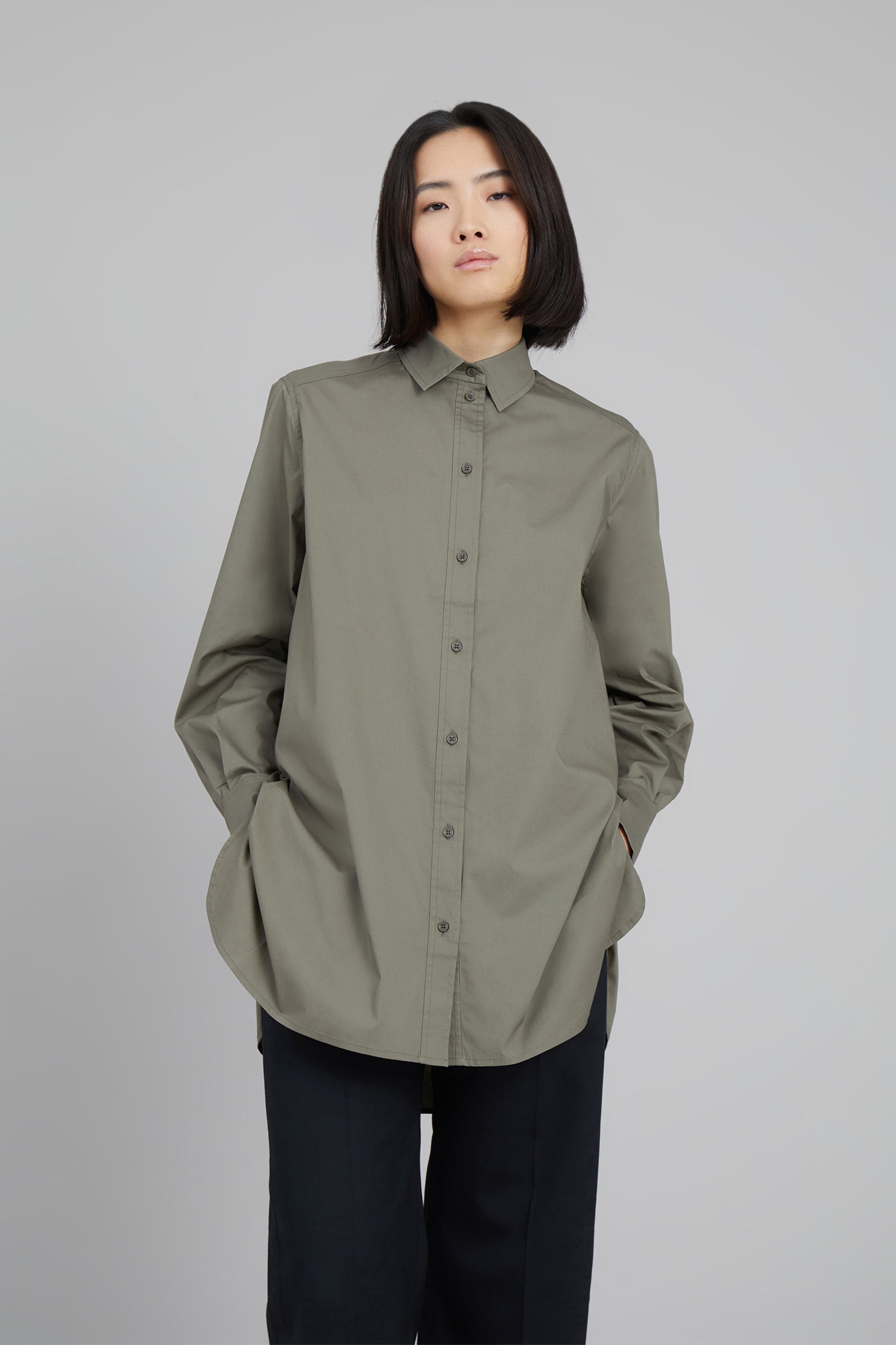 Oversize shirt in an organic cotton blend. The shirt has long sleeves with cuffs, a regular collar and placket. Slightly longer at the back. Available in the colors white, camel and army.