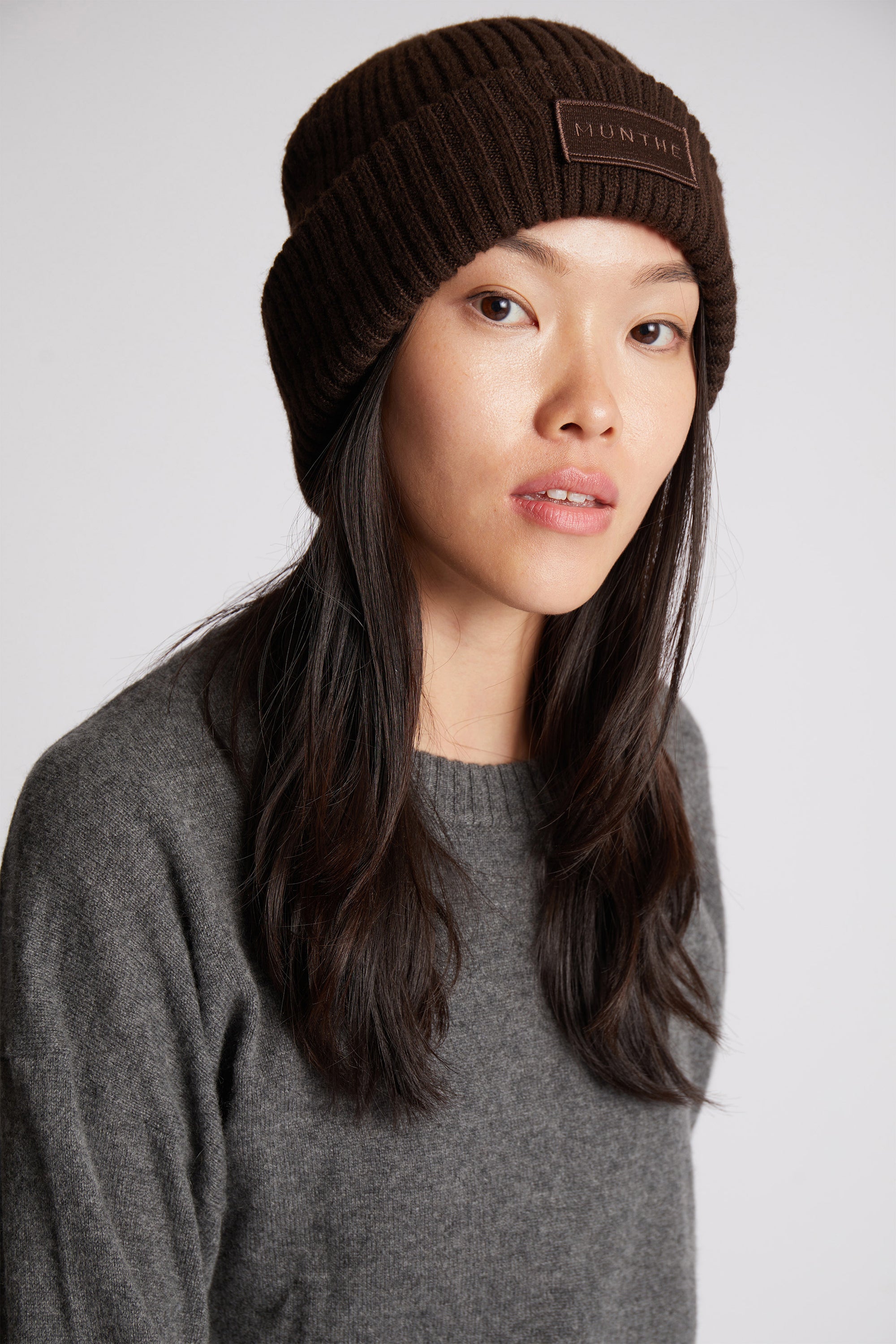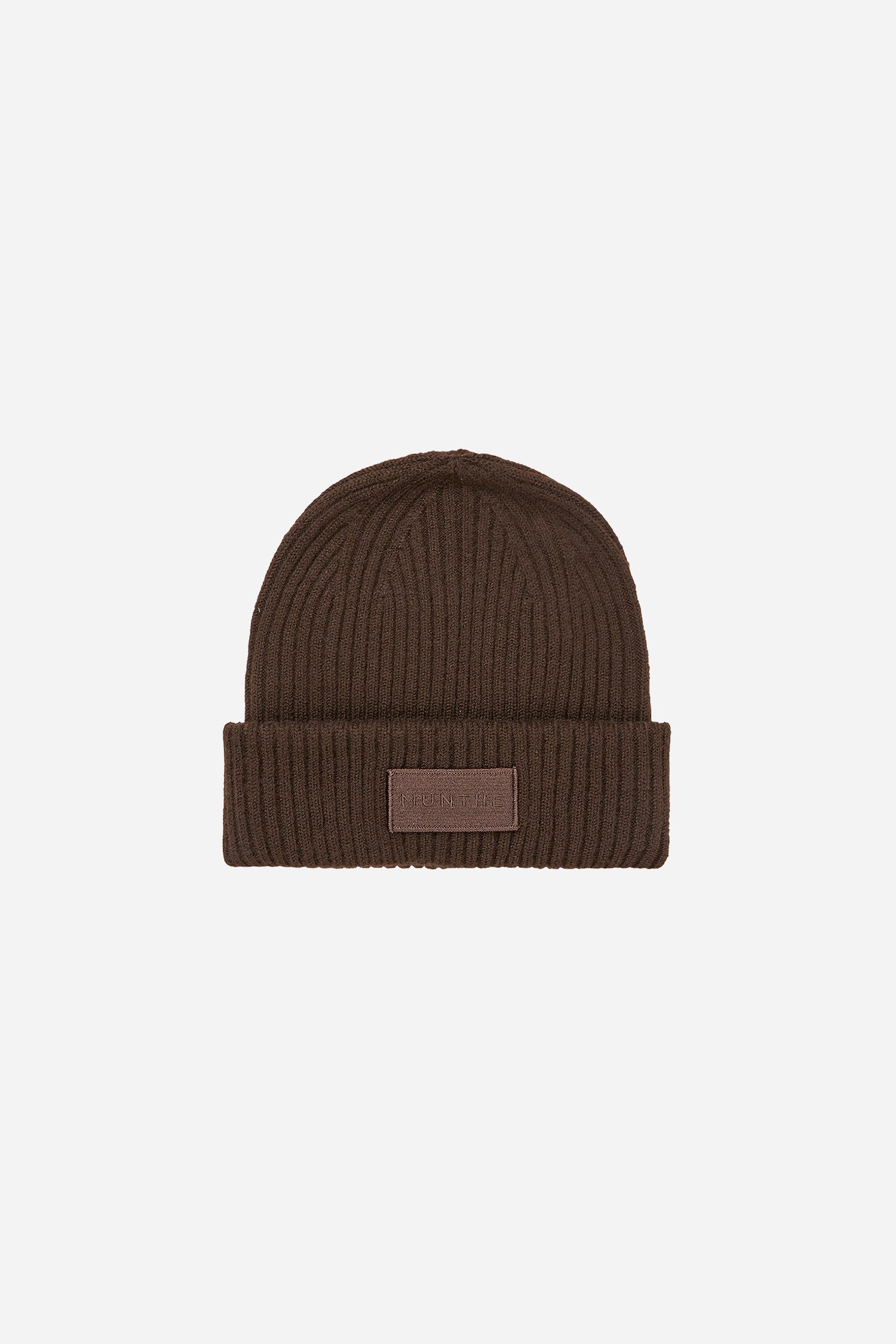 Ribbed knit beanie with a logo patch at the front. Made from a recycled polyester blend.