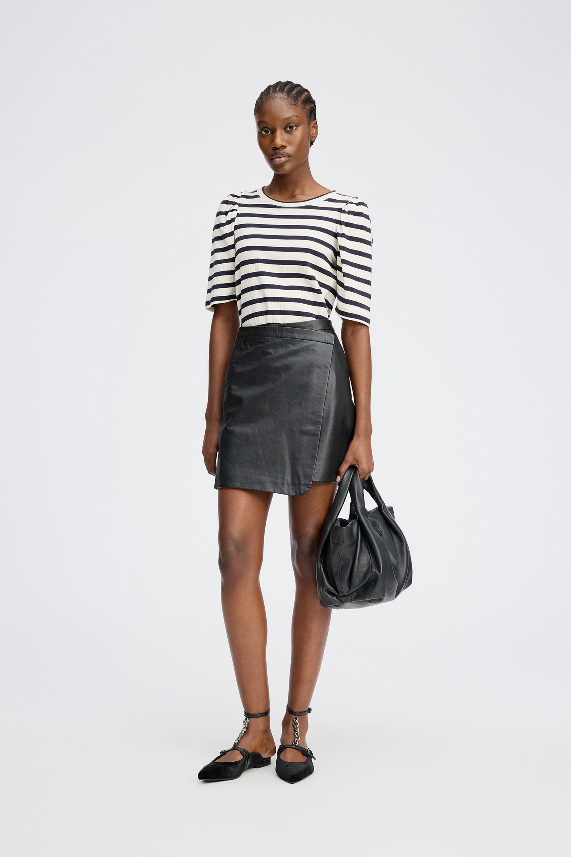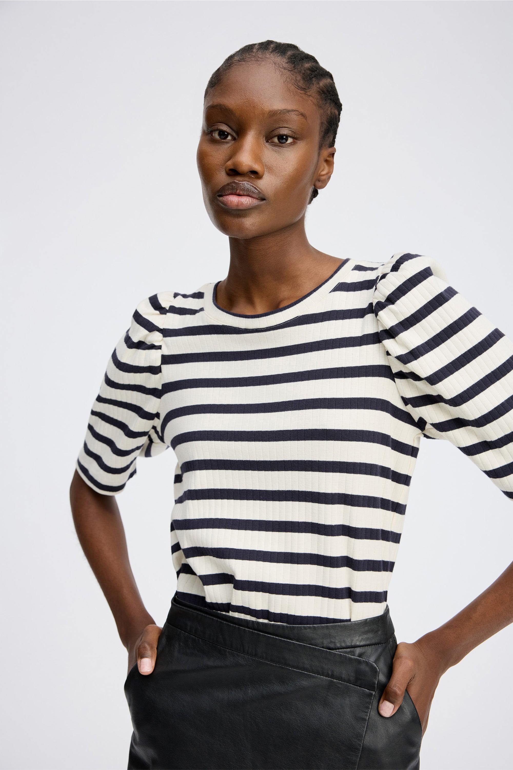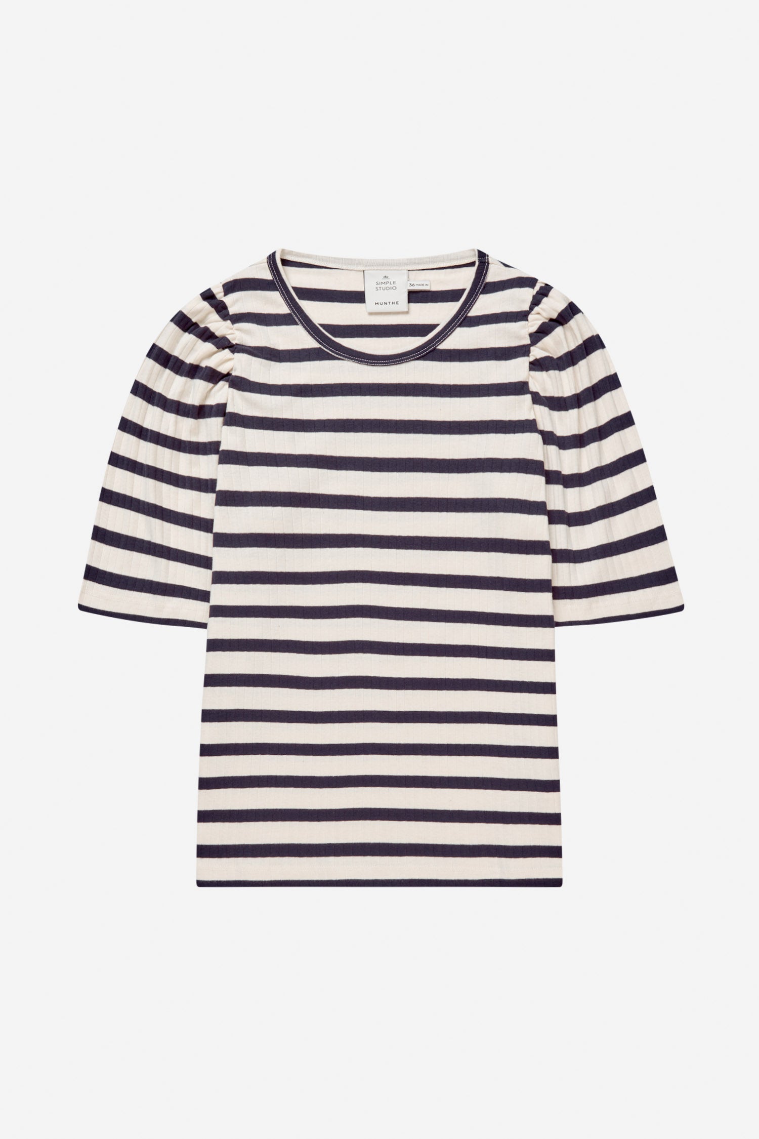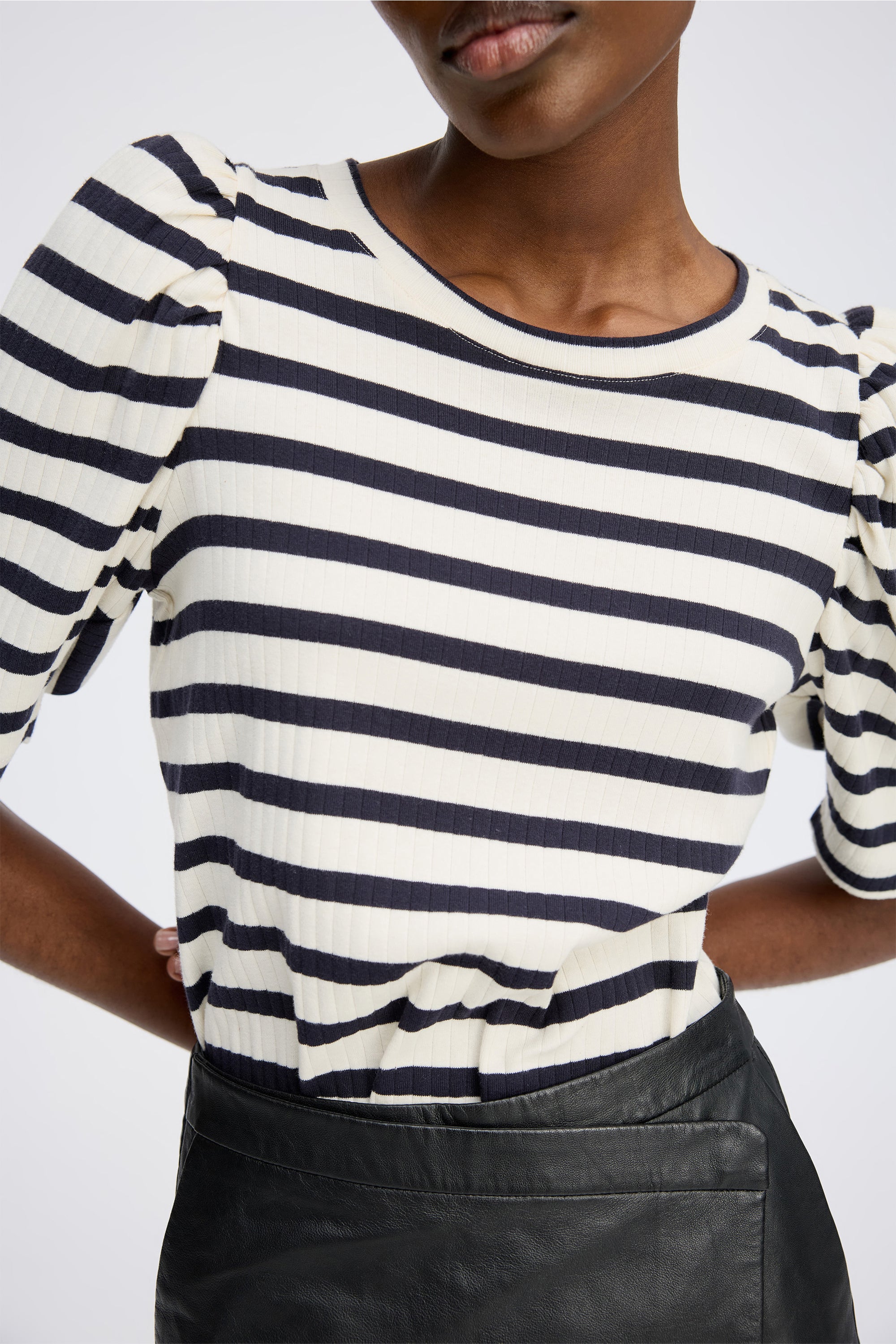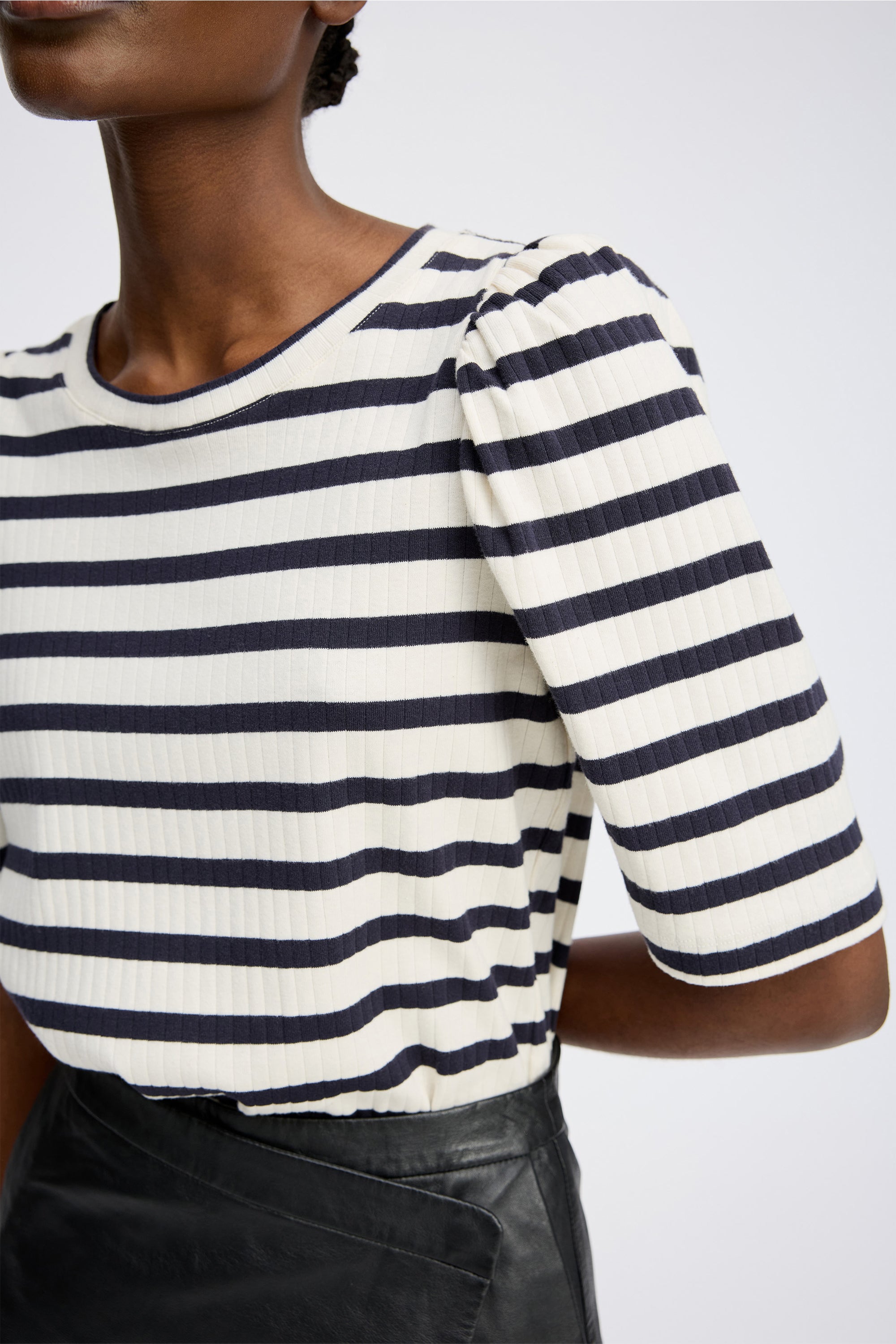 Striped fitted t-shirt with light, elegant puff sleeves. This t-shirt is made in 100% organic cotton and designed with a round neck and low shoulder seam.