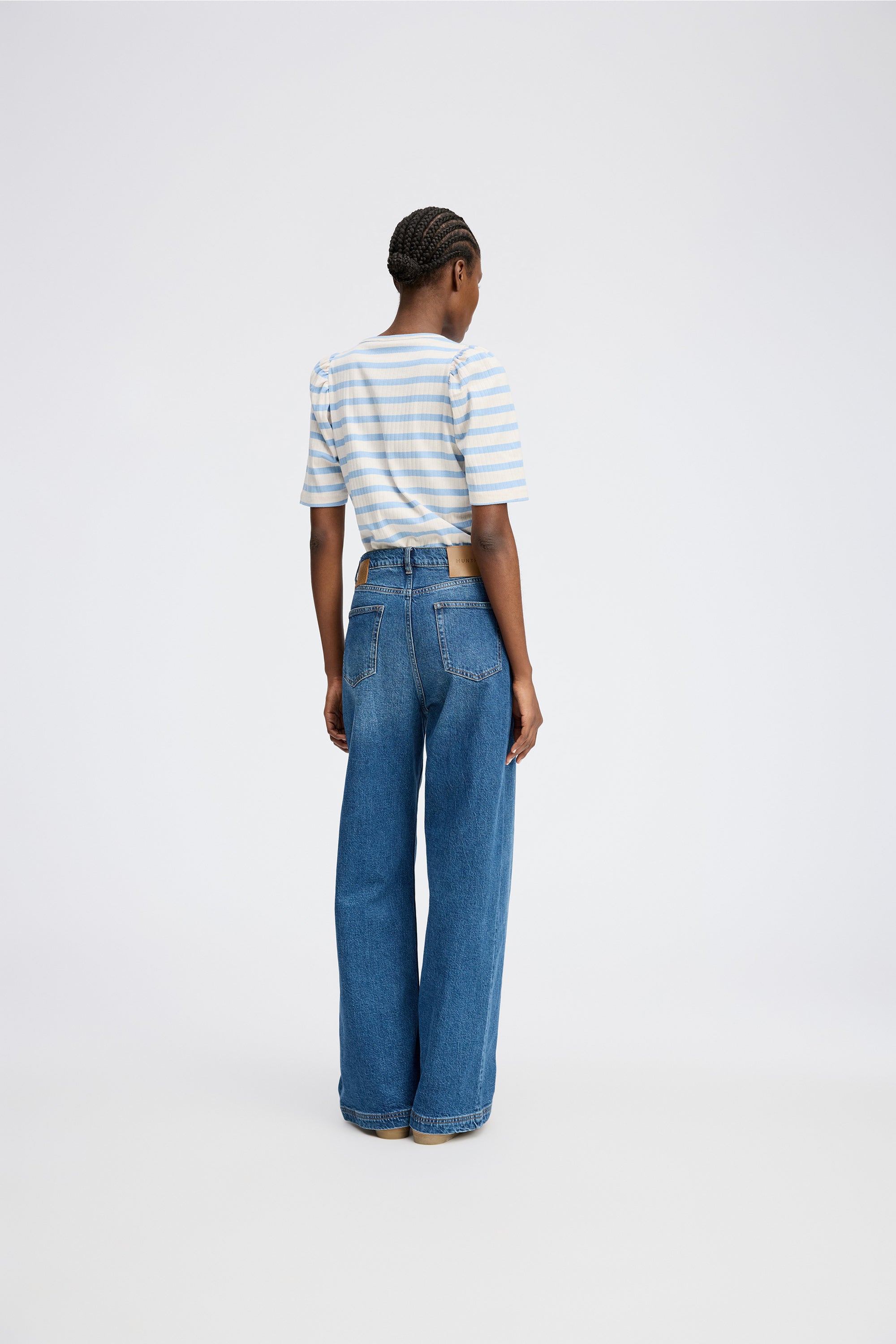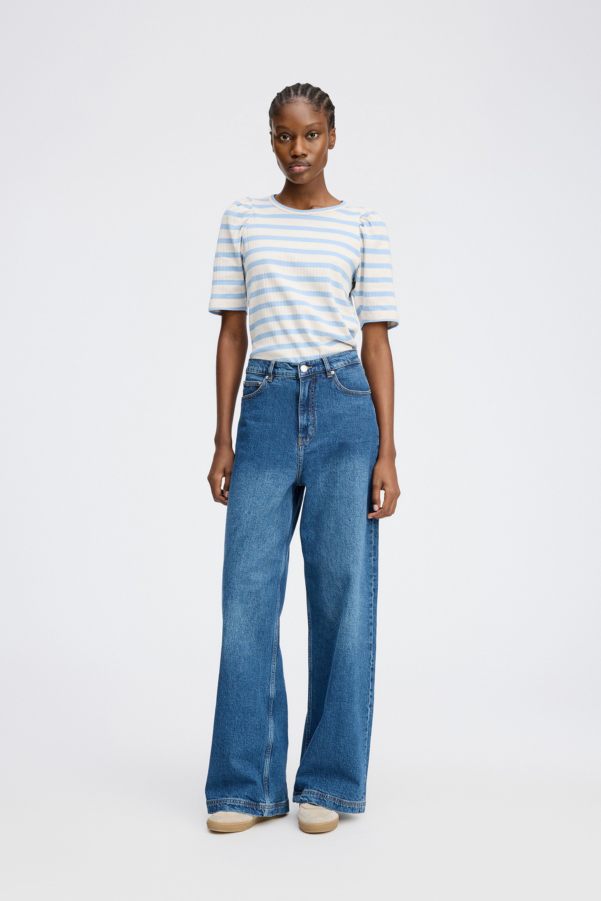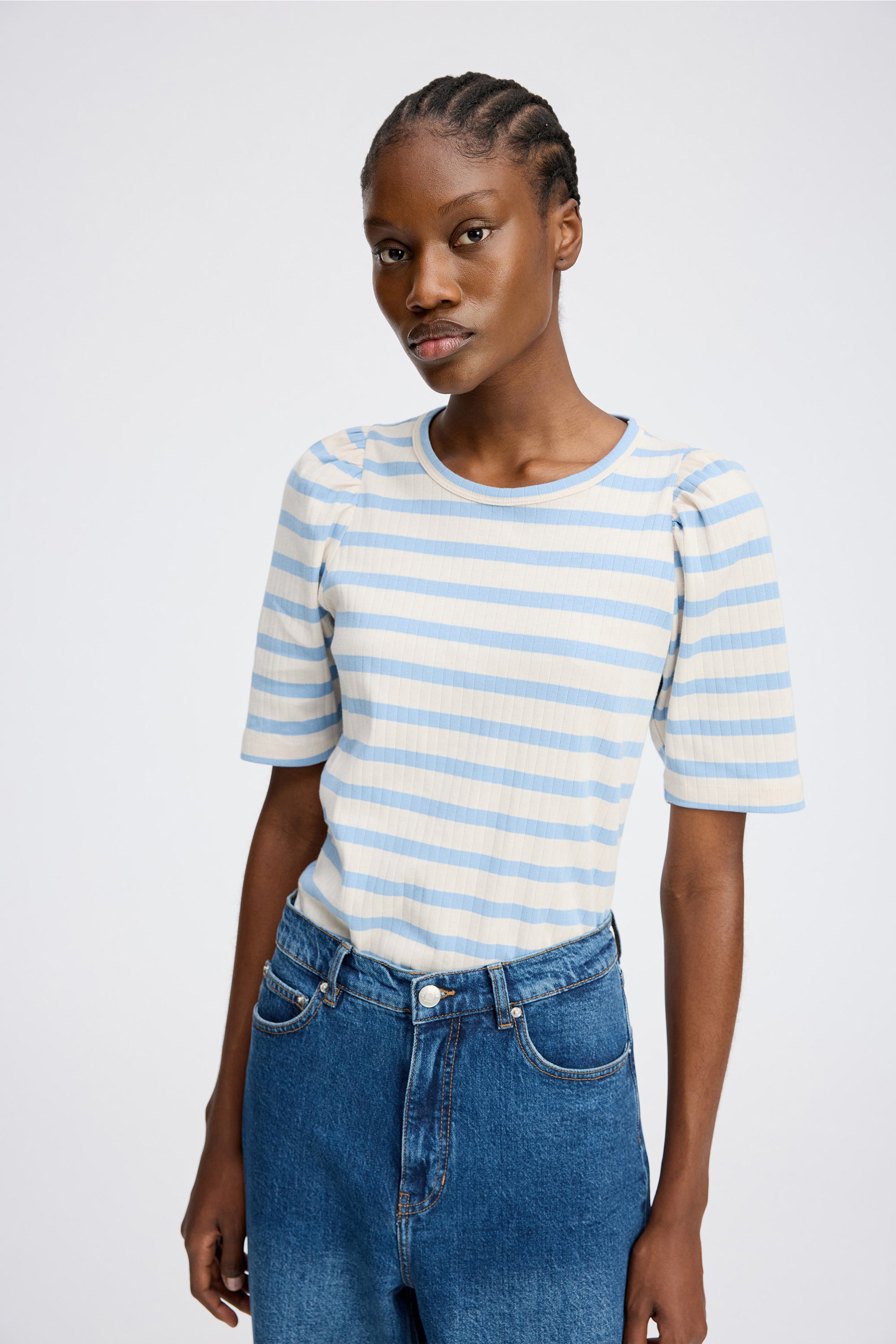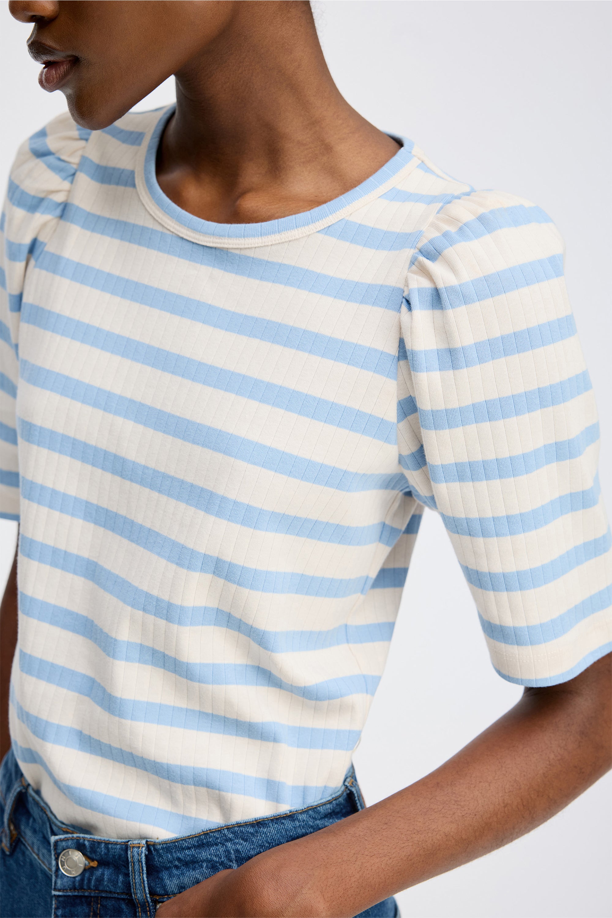 Striped fitted t-shirt with light, elegant puff sleeves. This t-shirt is made in 100% organic cotton and designed with a round neck and low shoulder seam.