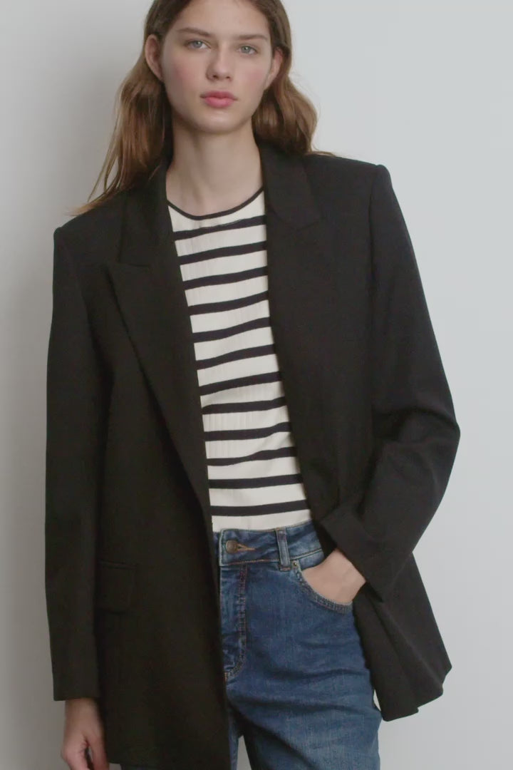 Striped blouse in 100% organic cotton with a round neck. The blouse is designed with a low shoulder seam and long sleeves.