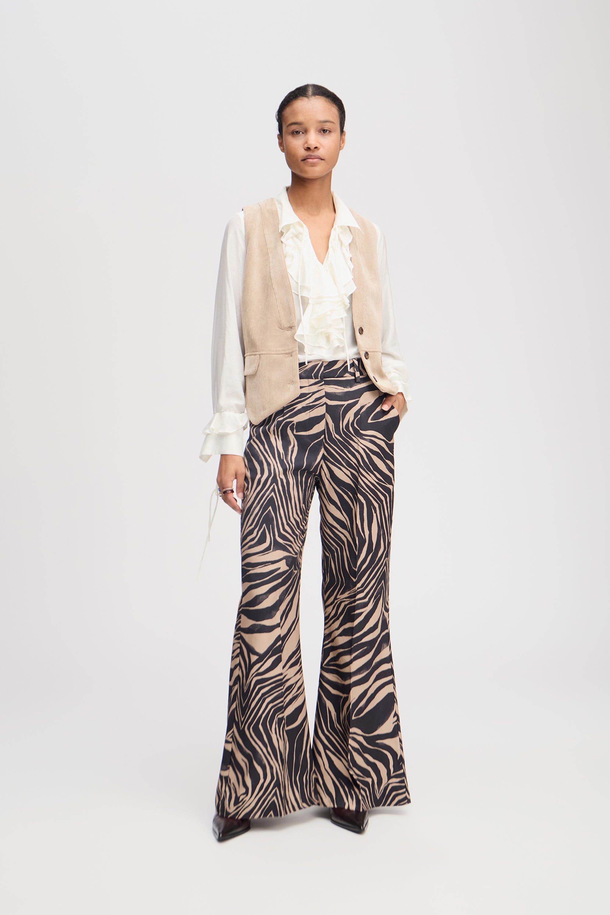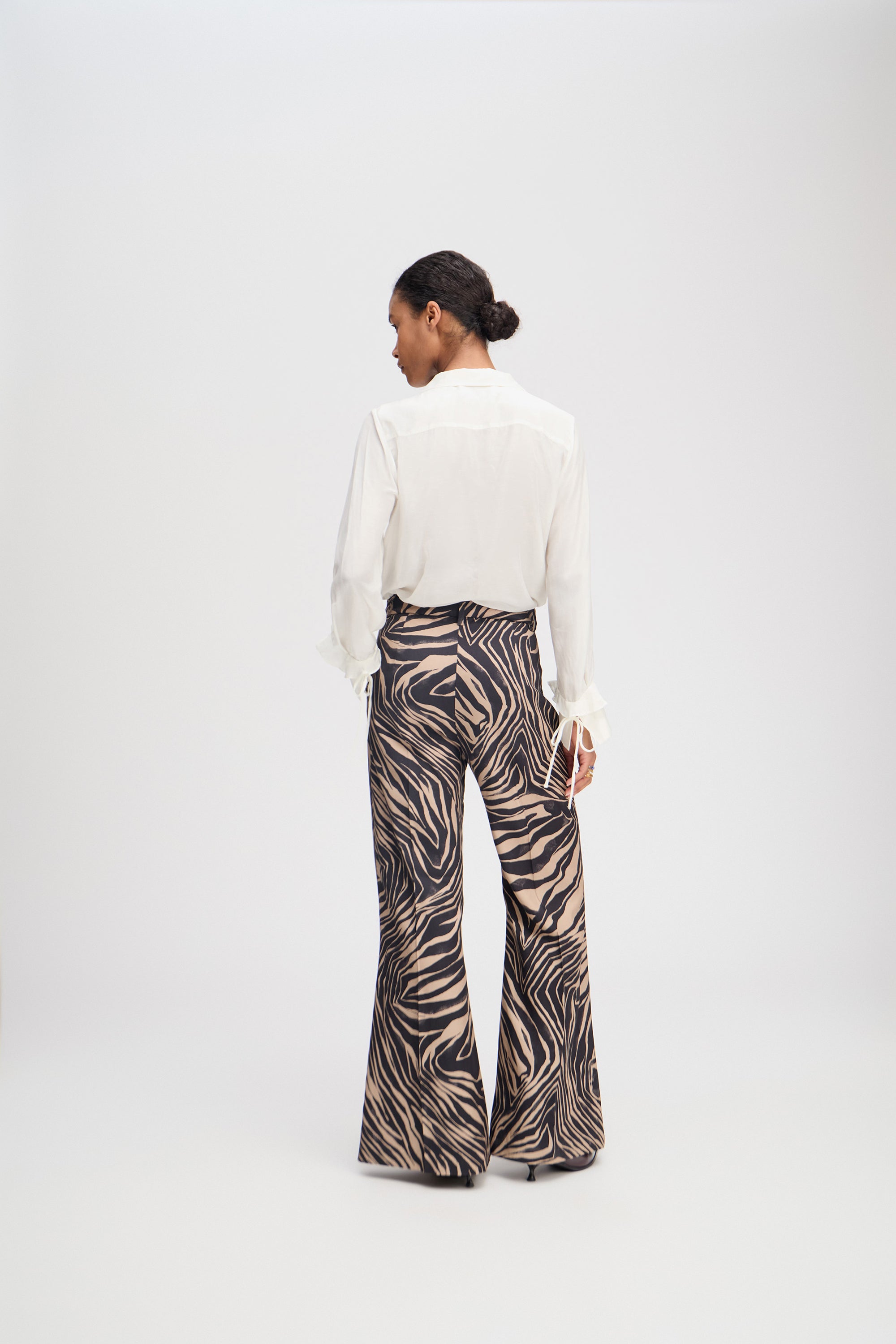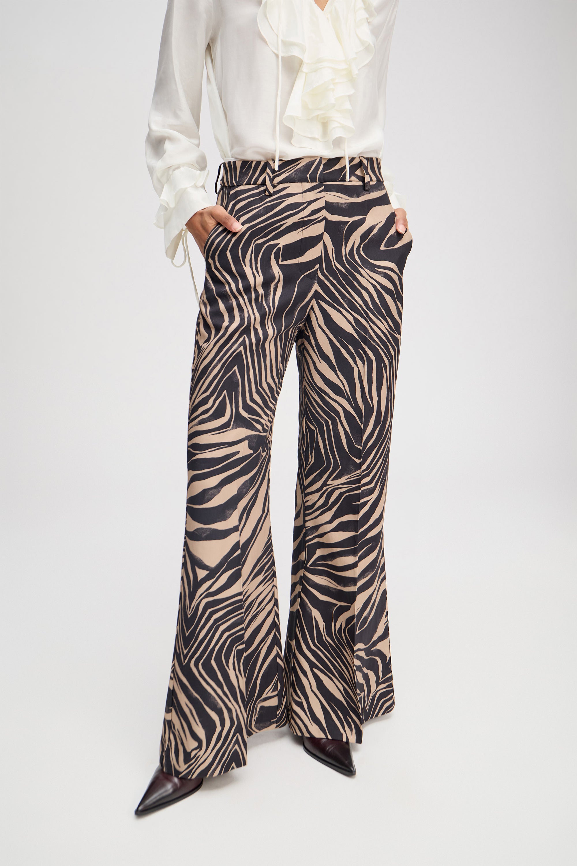 Pants with a beautiful all-over print. These pants are designed with elegant details such as wide legs, belt loops, and side pockets. The pants are fastened with a front zipper.