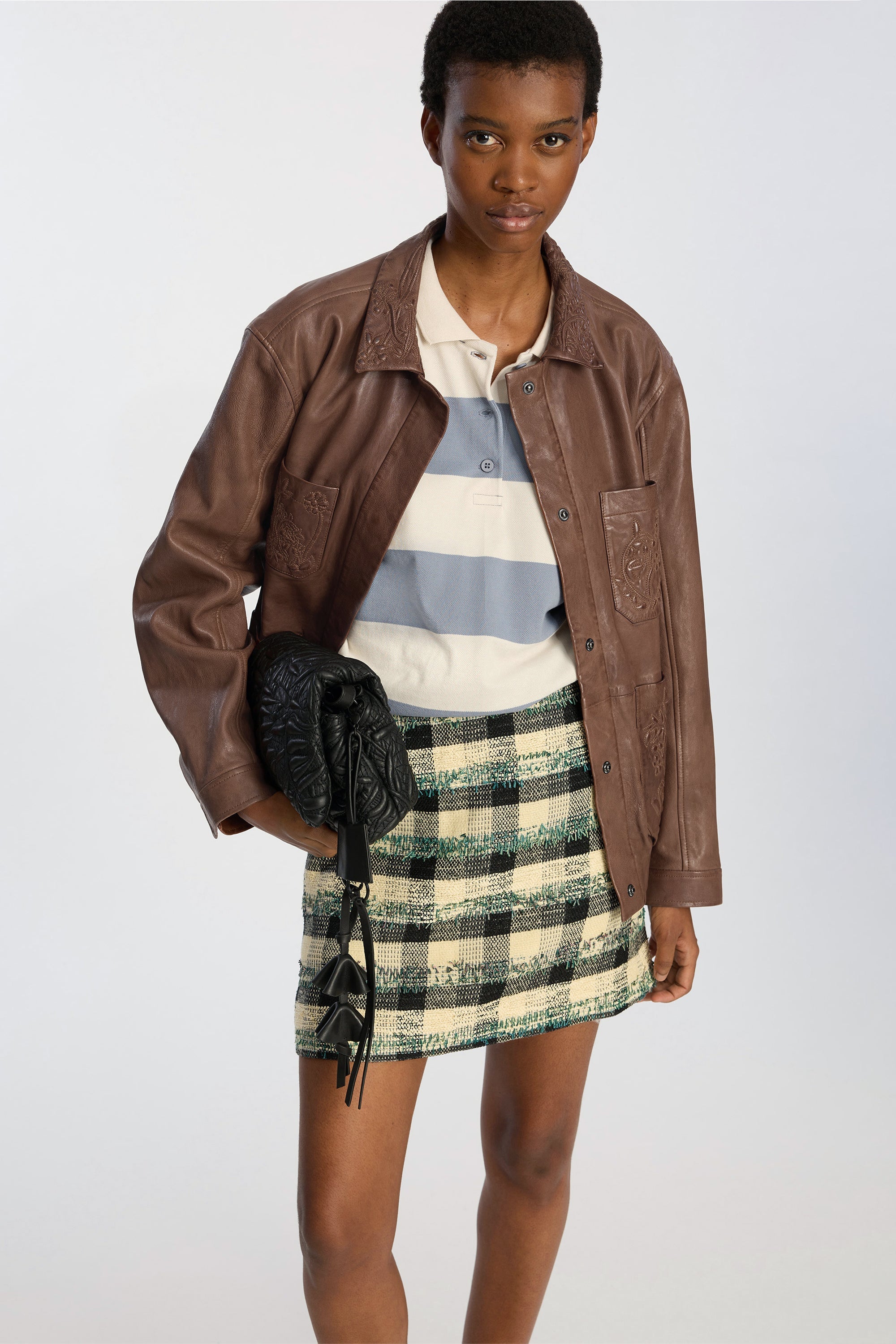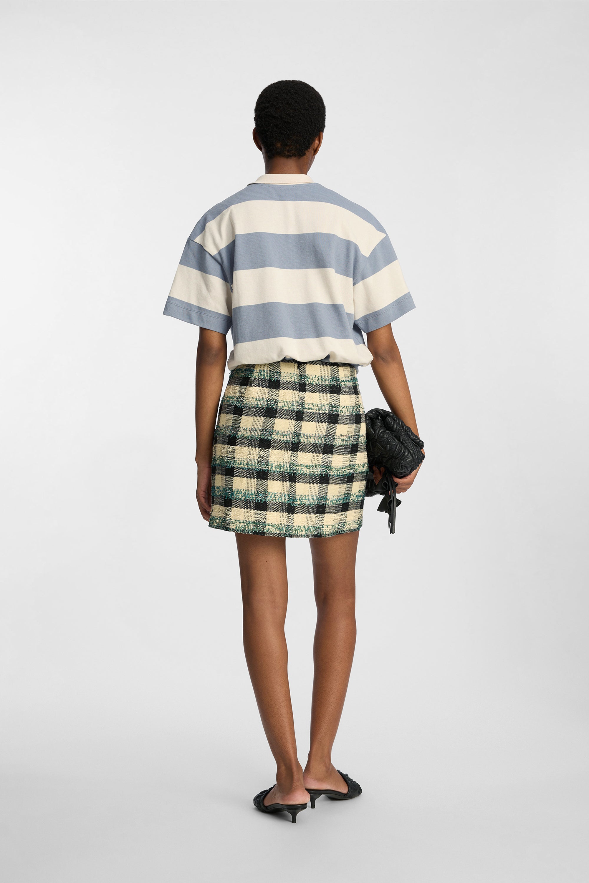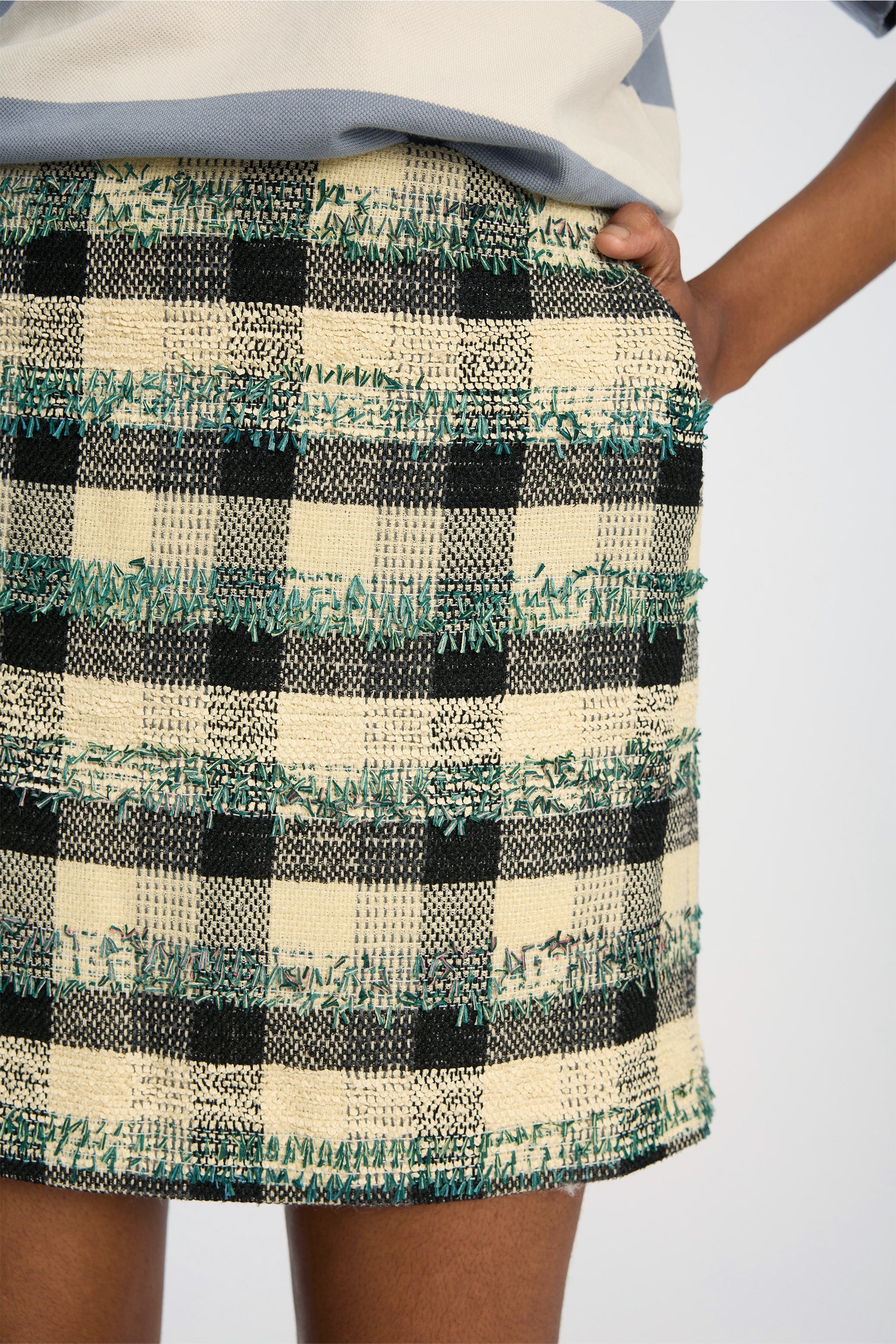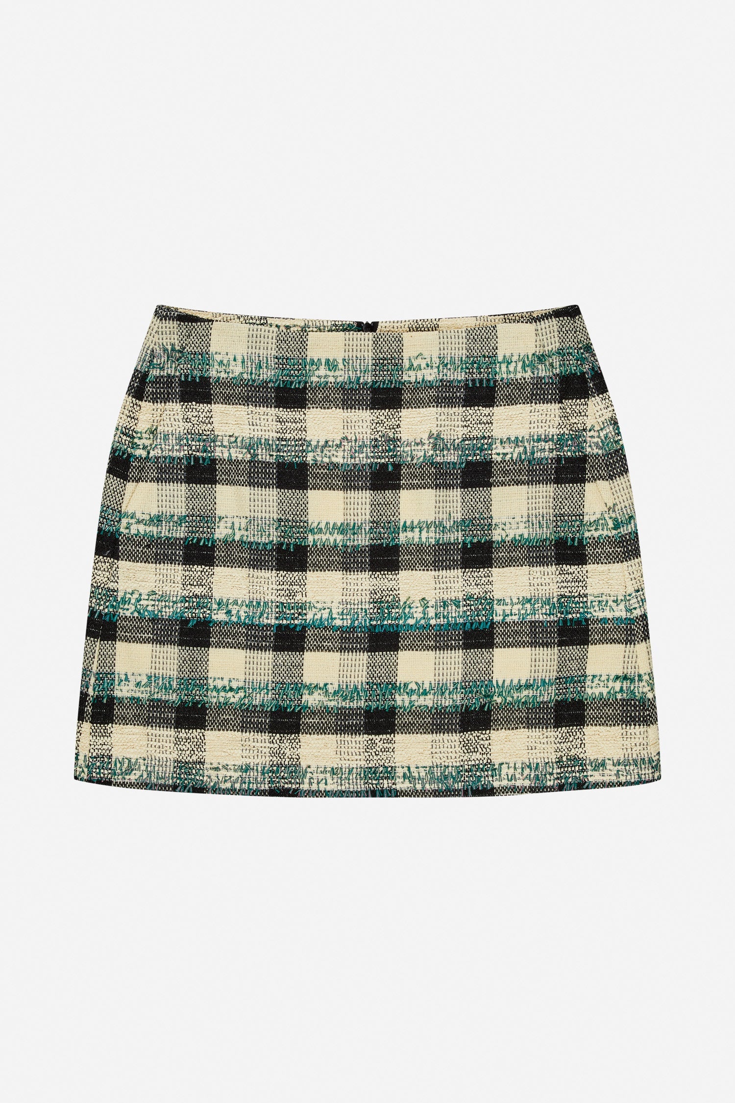 This skirt is crafted from a structured woven material featuring a multicoloured checked pattern. The design has a short, straight silhouette and a clean waistband for a sharp, modern look.