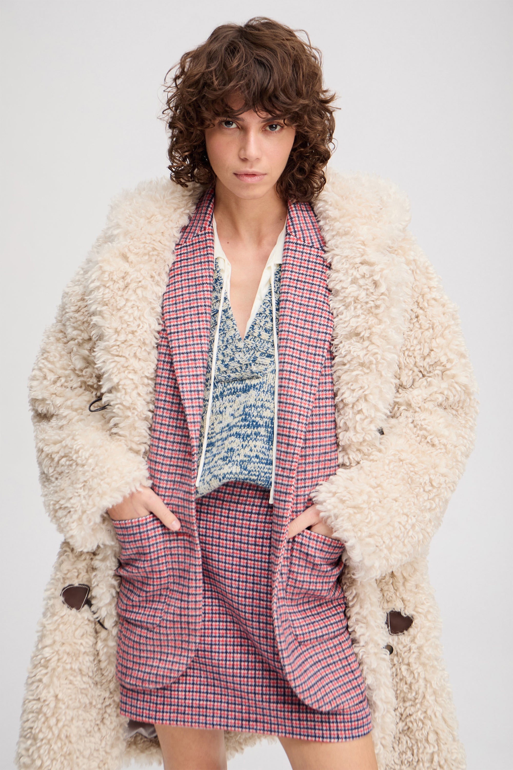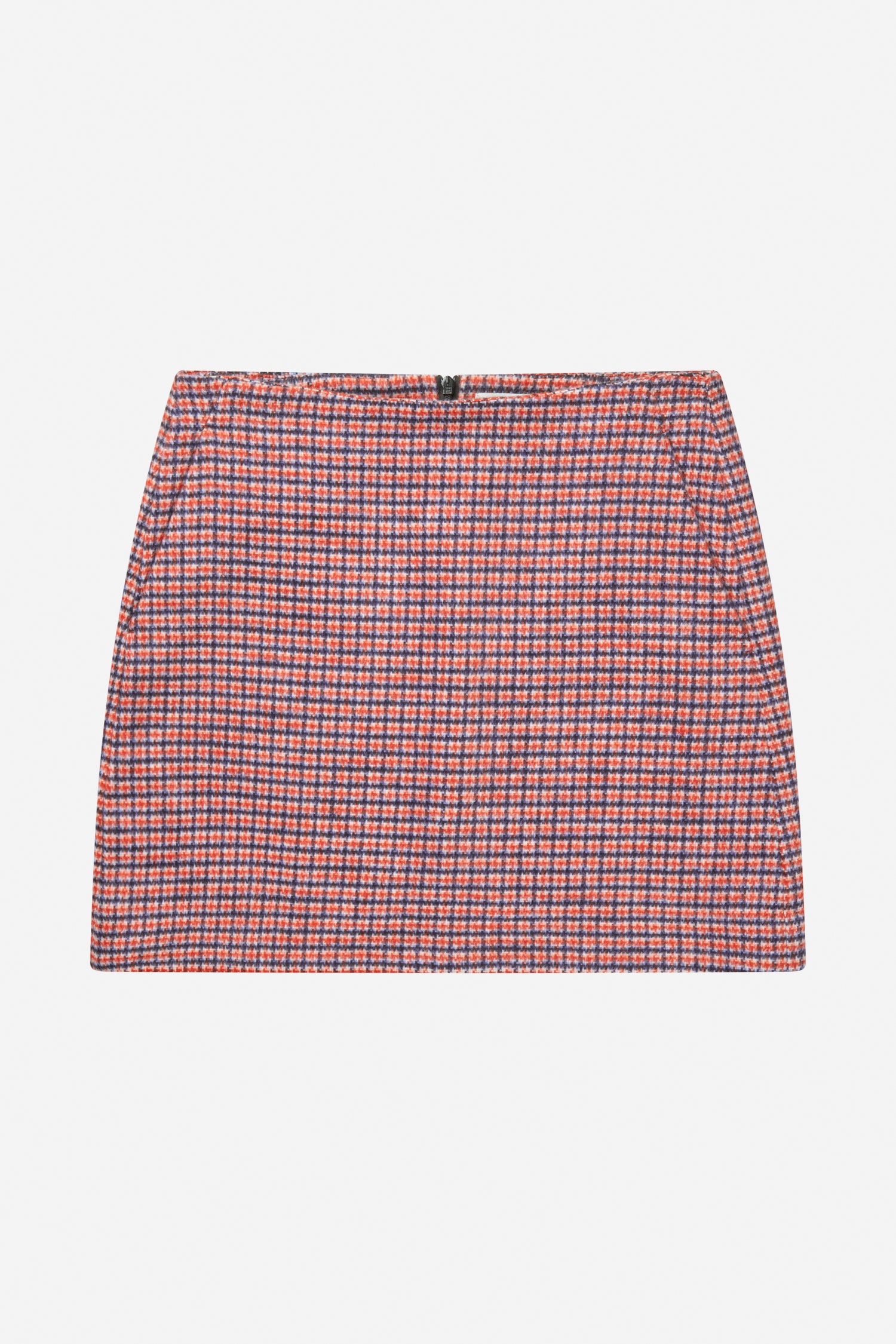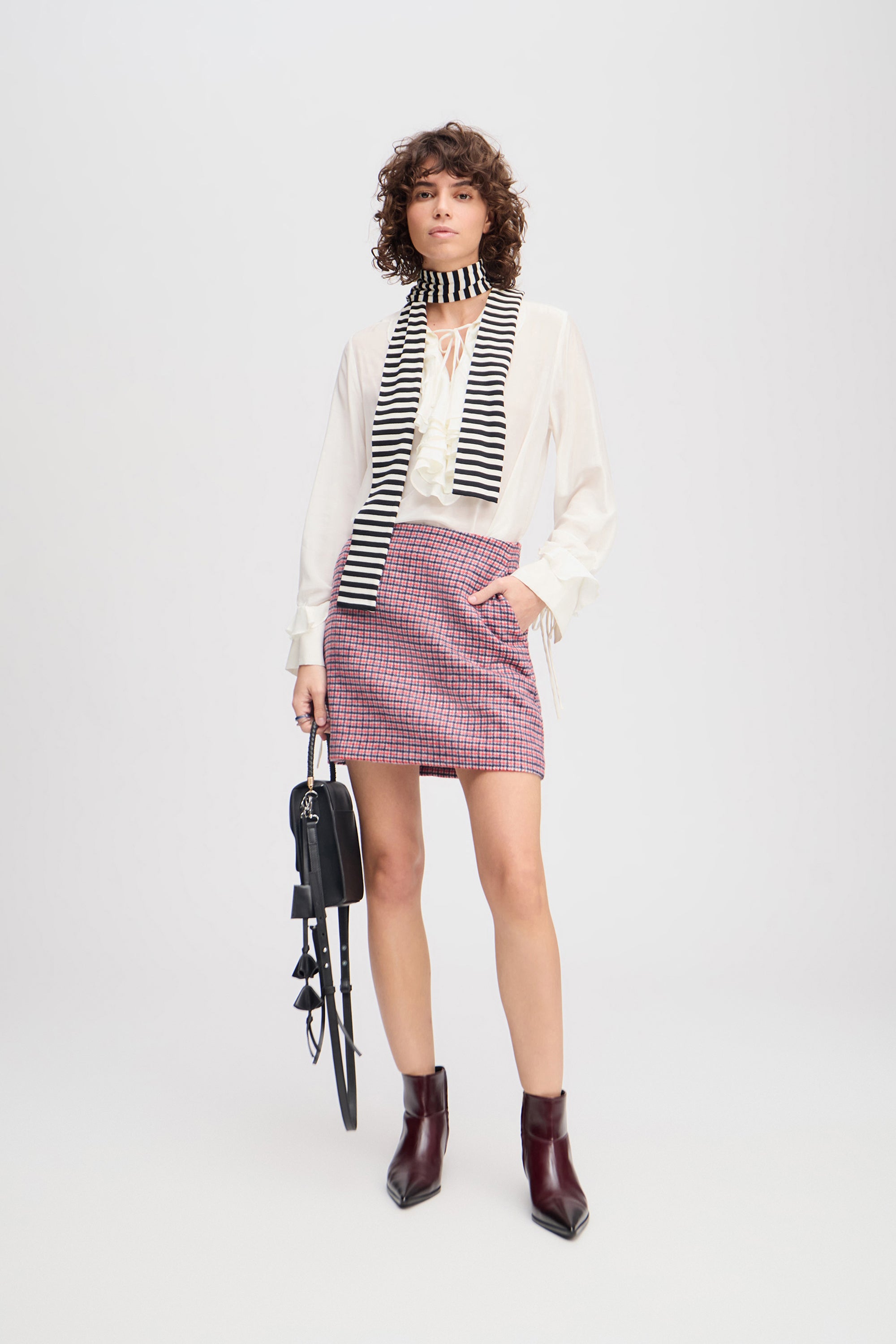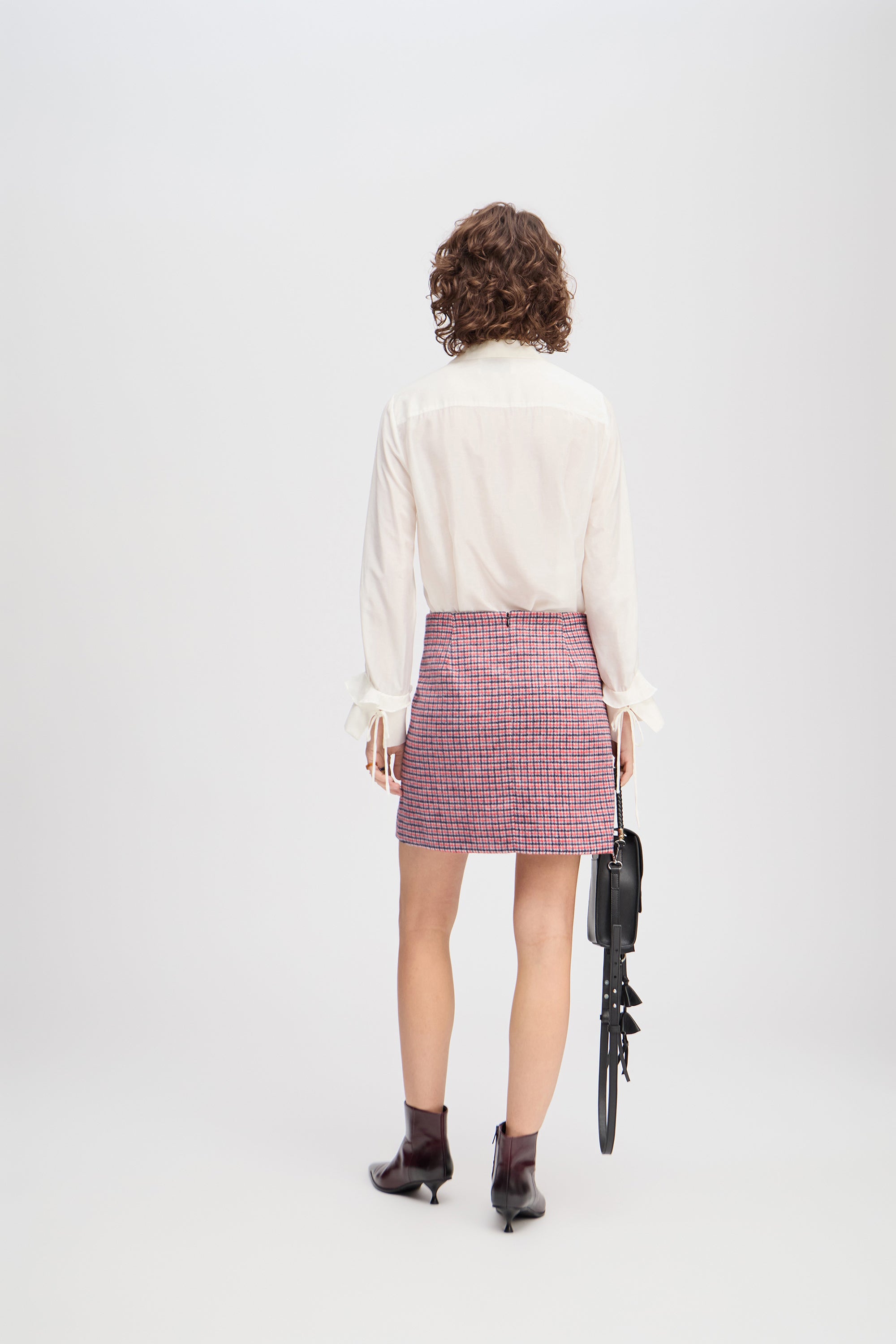 An elegant, short checkered skirt with fine diagonal pockets on the sides. This skirt is fastened with a zipper at the back and is designed to be form-fitting.