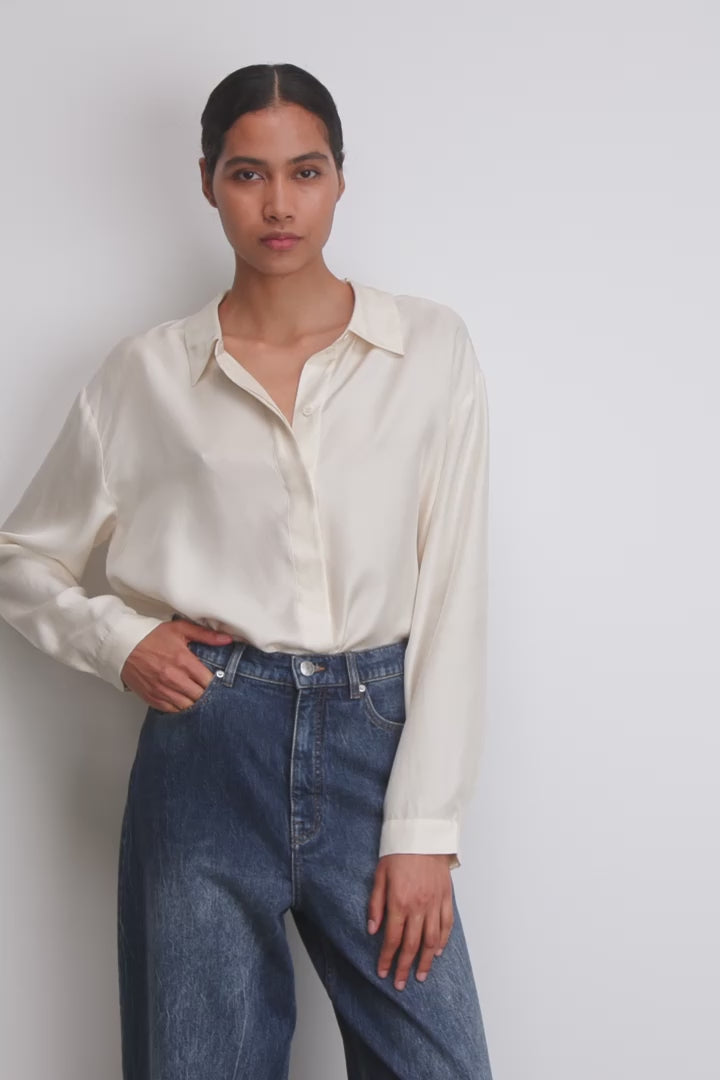 Elegant, classic shirt made in 100% silk. The shirt has long sleeves with short cuffs and a regular collar.