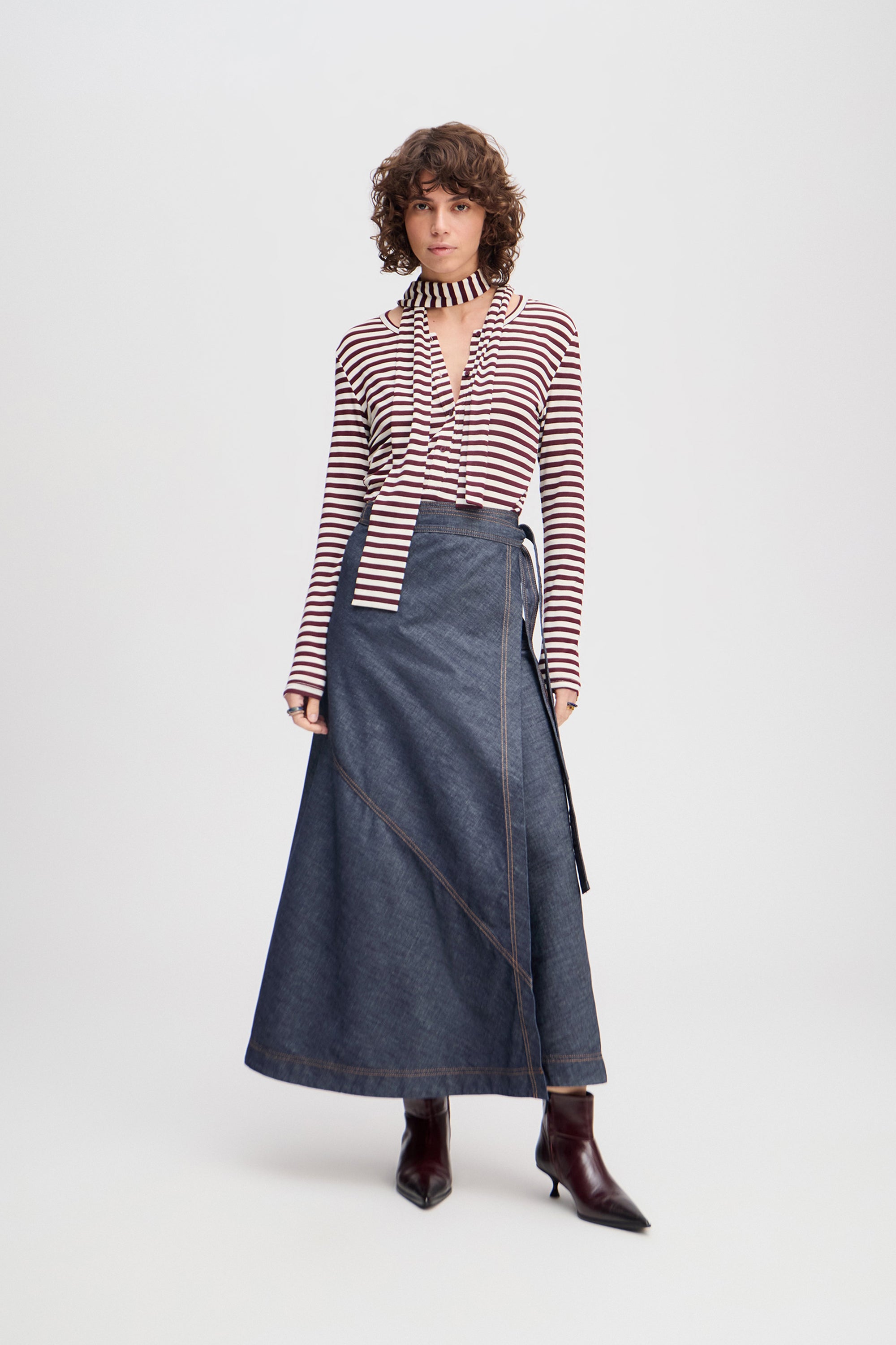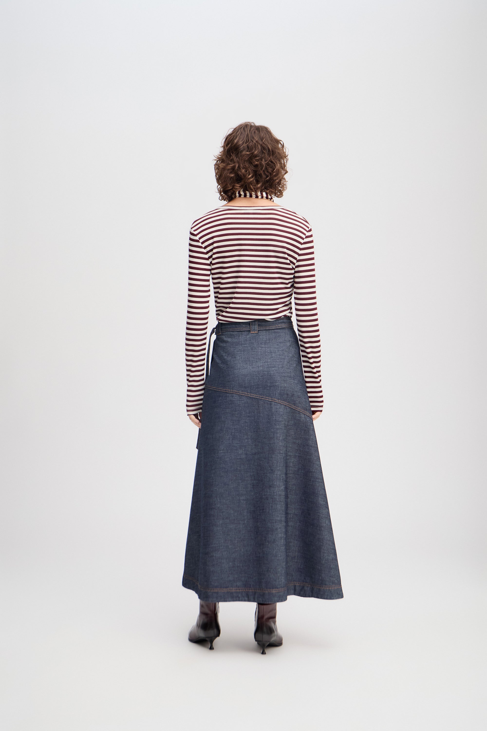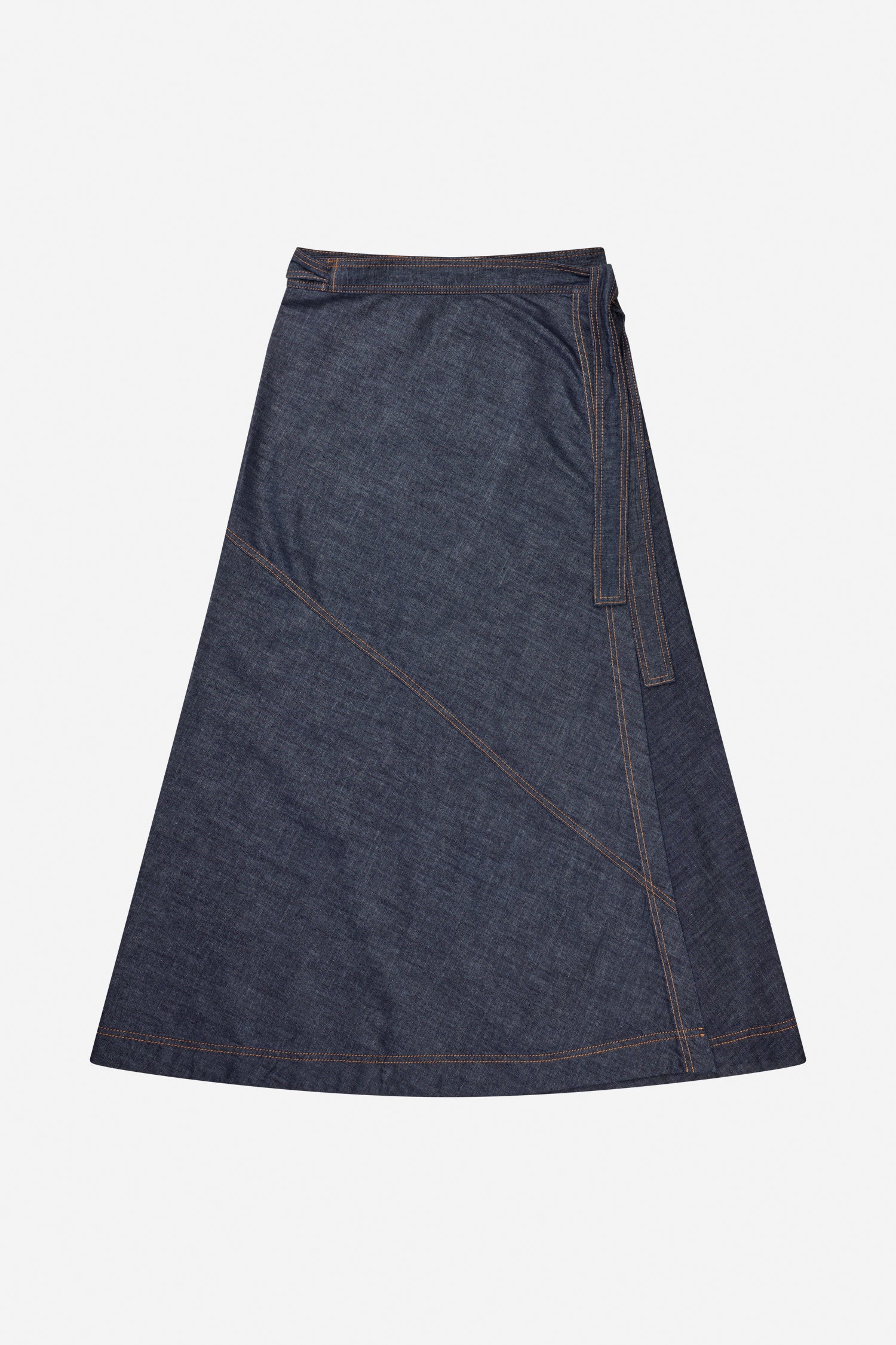 Denim wrap skirt with elegant, discreet diagonal stitching. The skirt has a regular fit and can be tied at the waist.