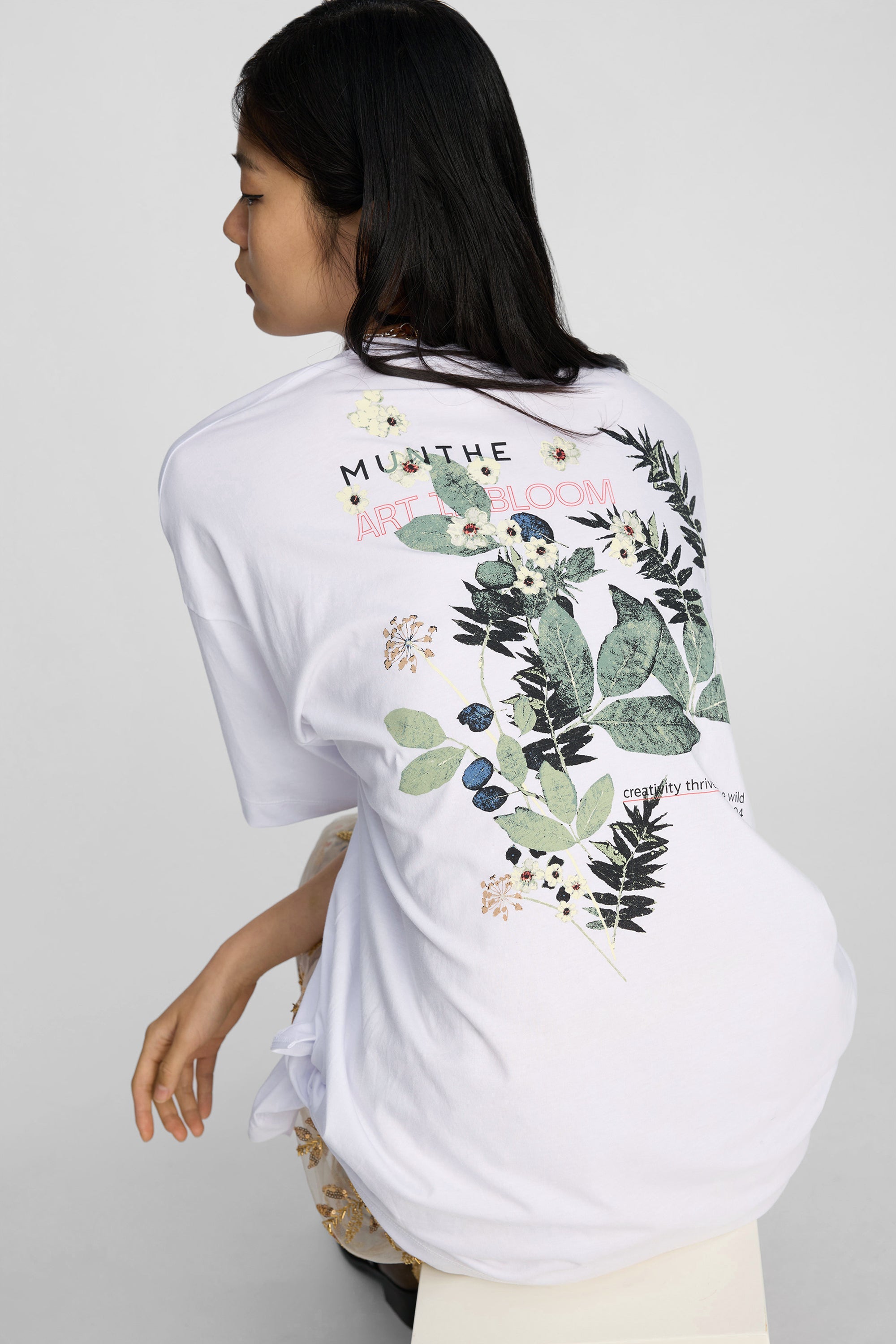 T-shirt with a nature print on the back and a subtle MUNTHE emblem on the chest. It features a relaxed fit, a round neckline, and short sleeves.