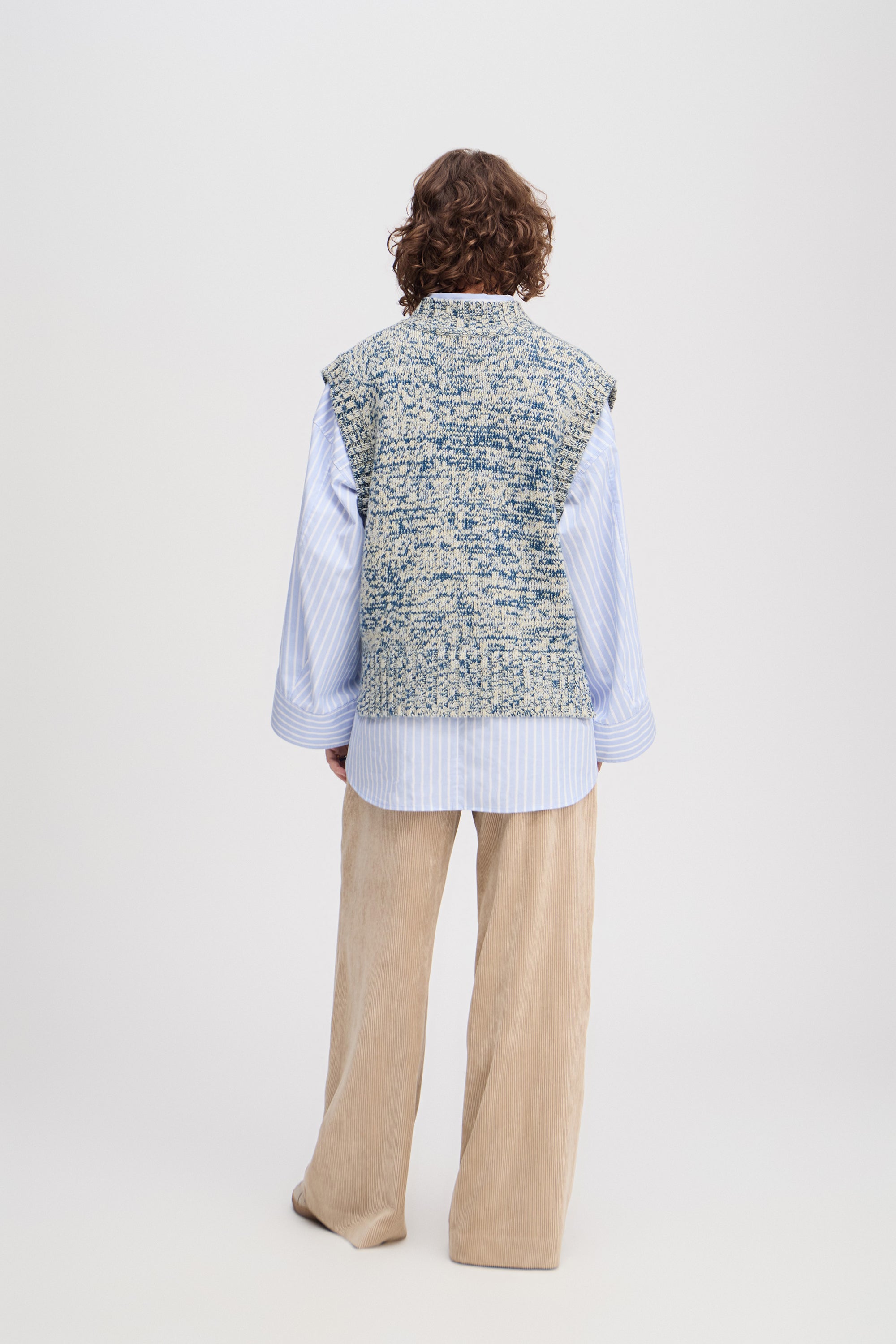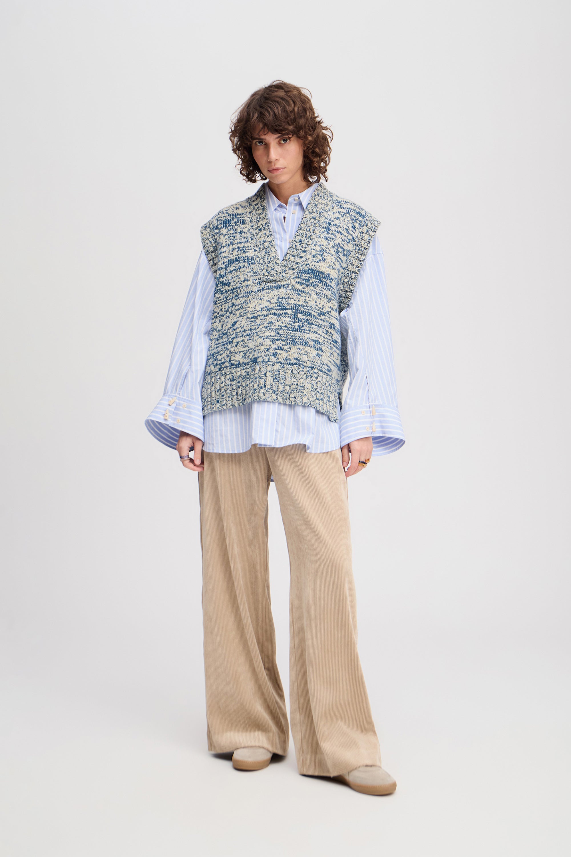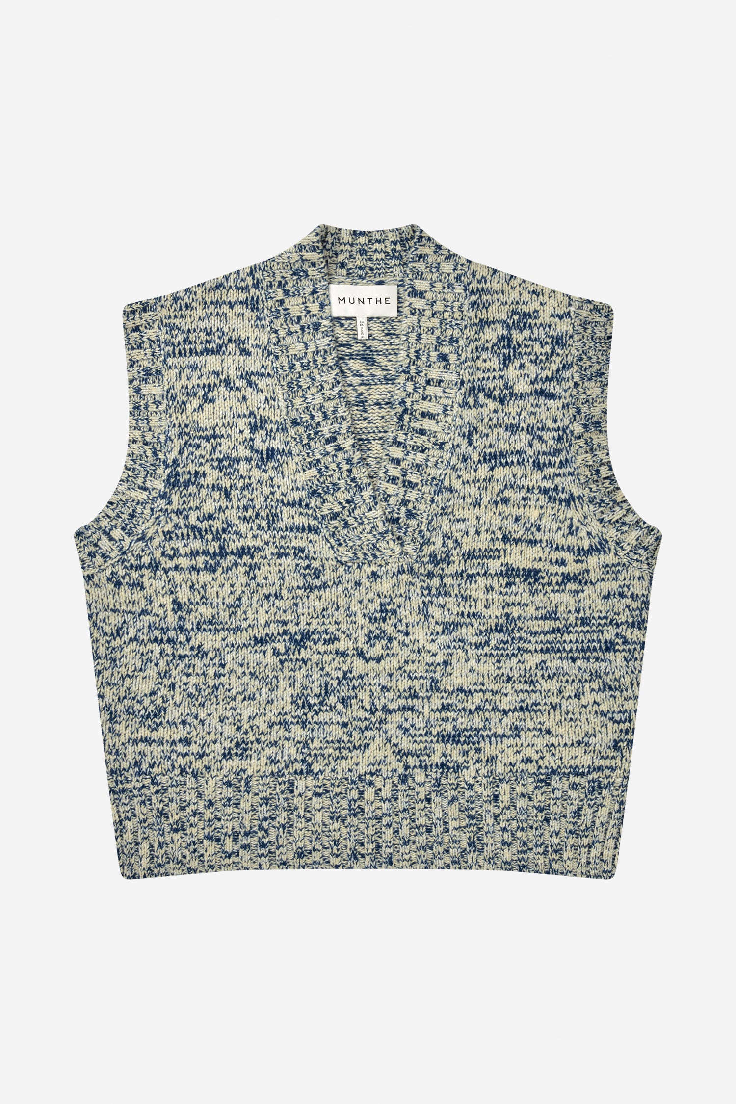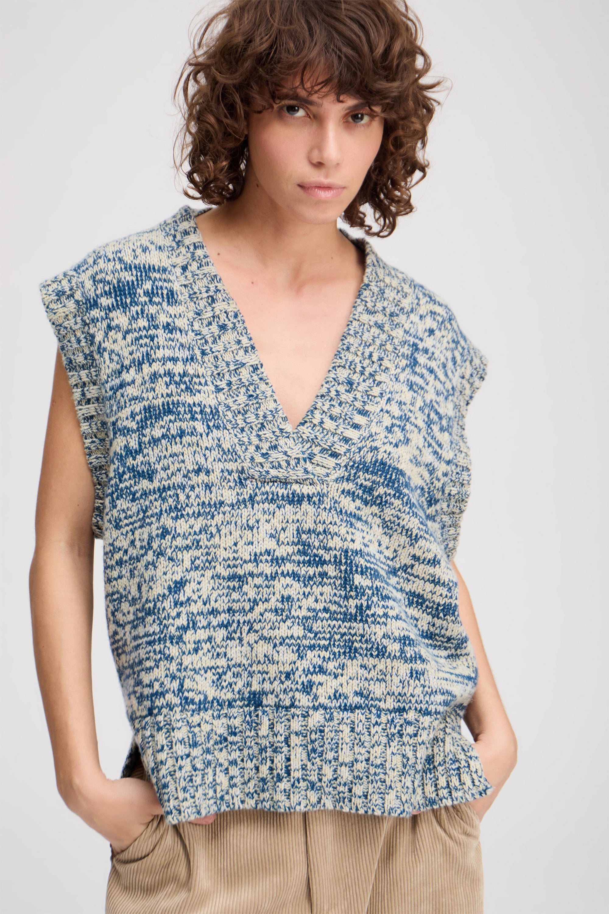 Knitted vest with a delicate pattern, designed with beautiful ribbed details and an elegant slit at the sides. This knit features a deep V-neckline.