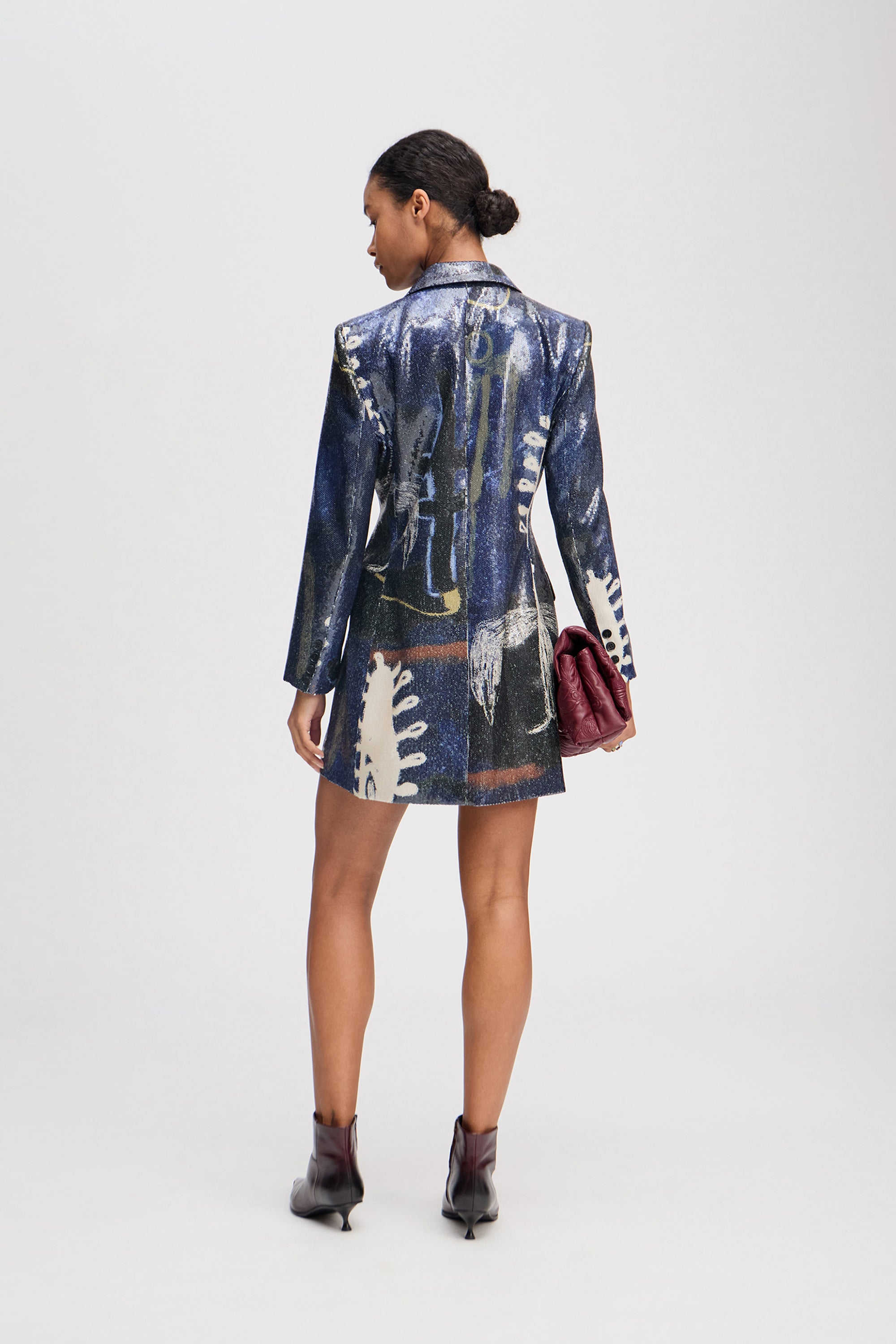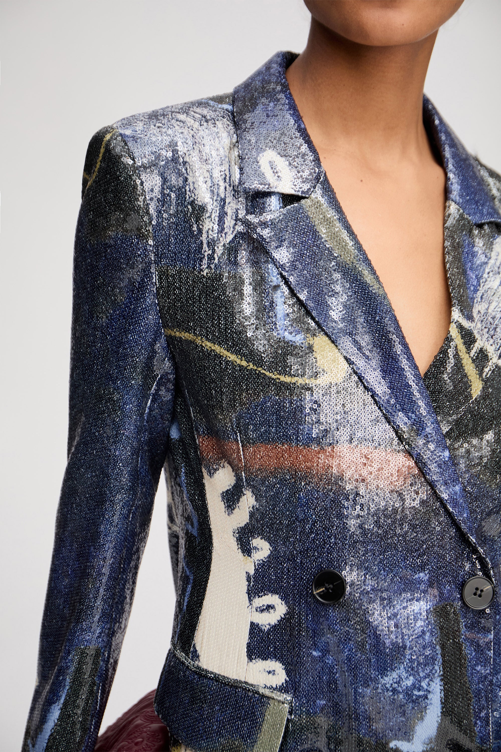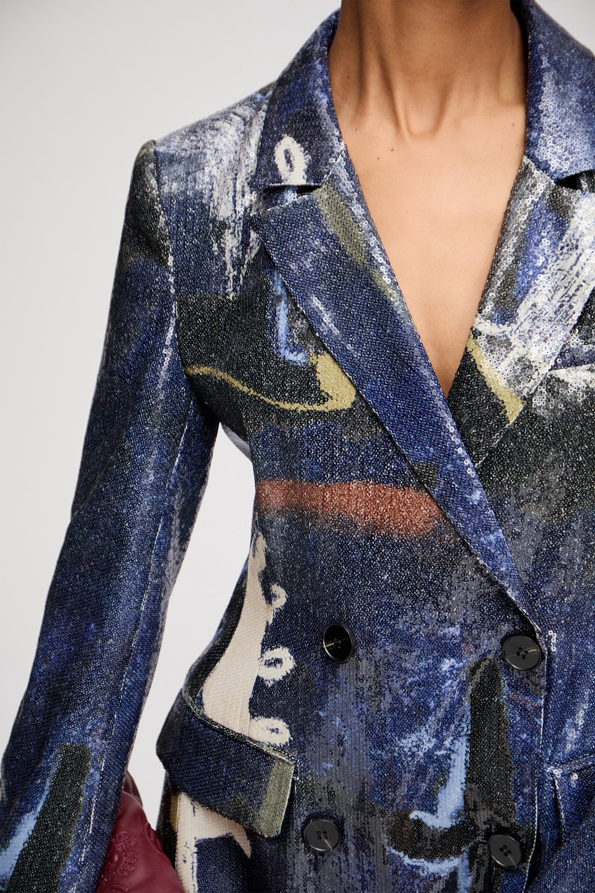 Long elegant blazer with a beautiful all-over sequin print. This blazer is designed with a slim fit, straight shoulders, long sleeves, and a double-breasted closure.
