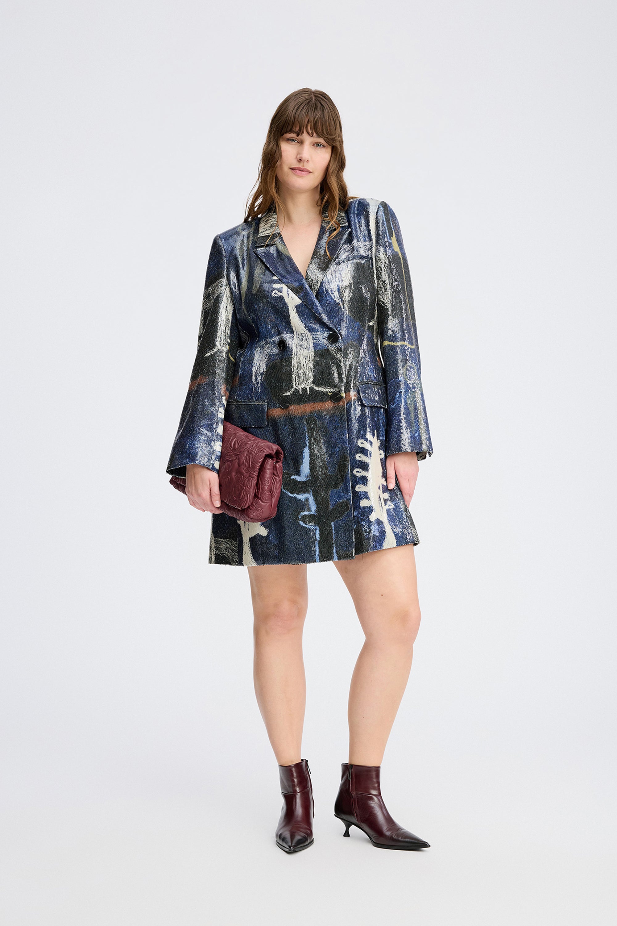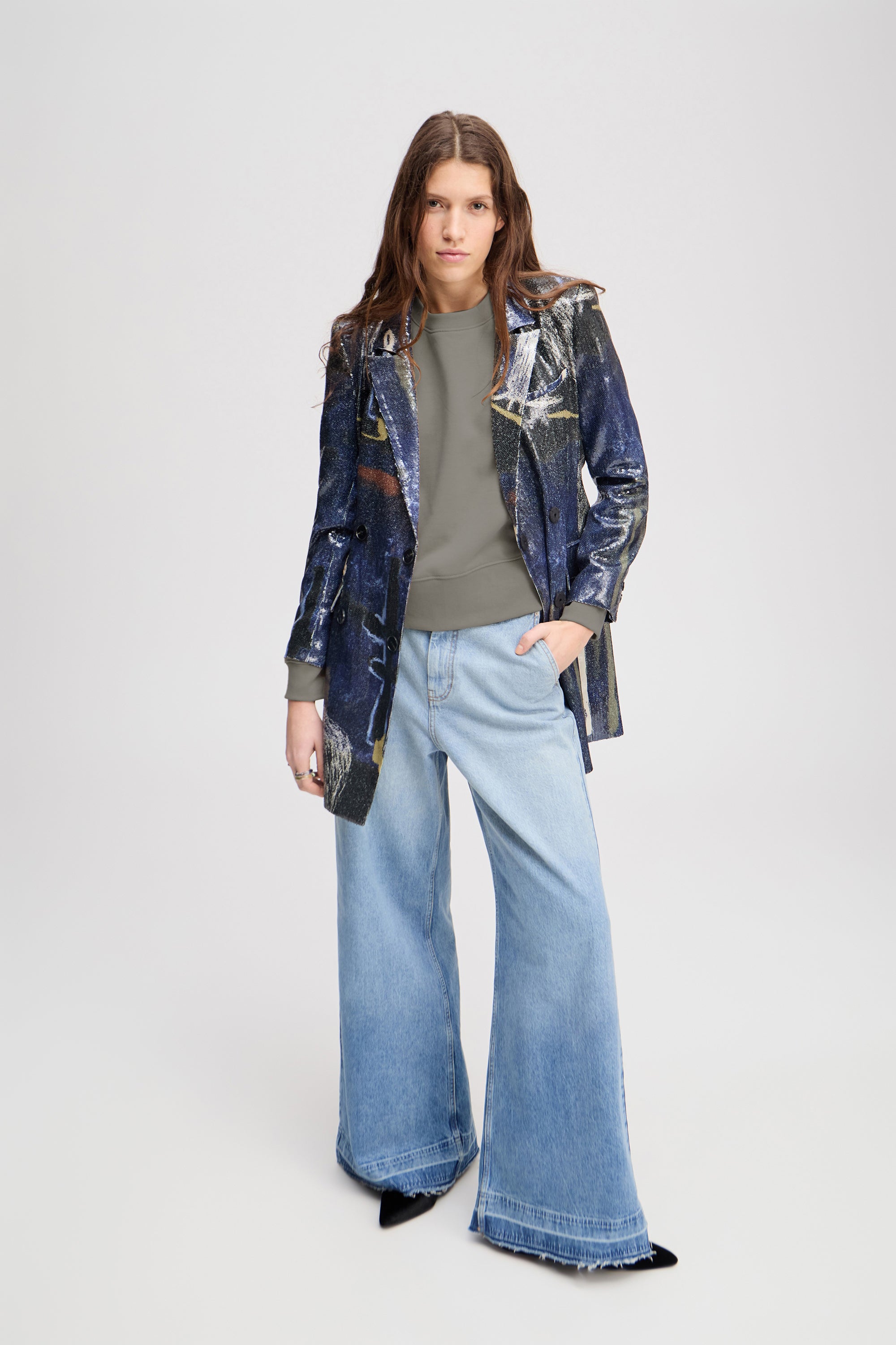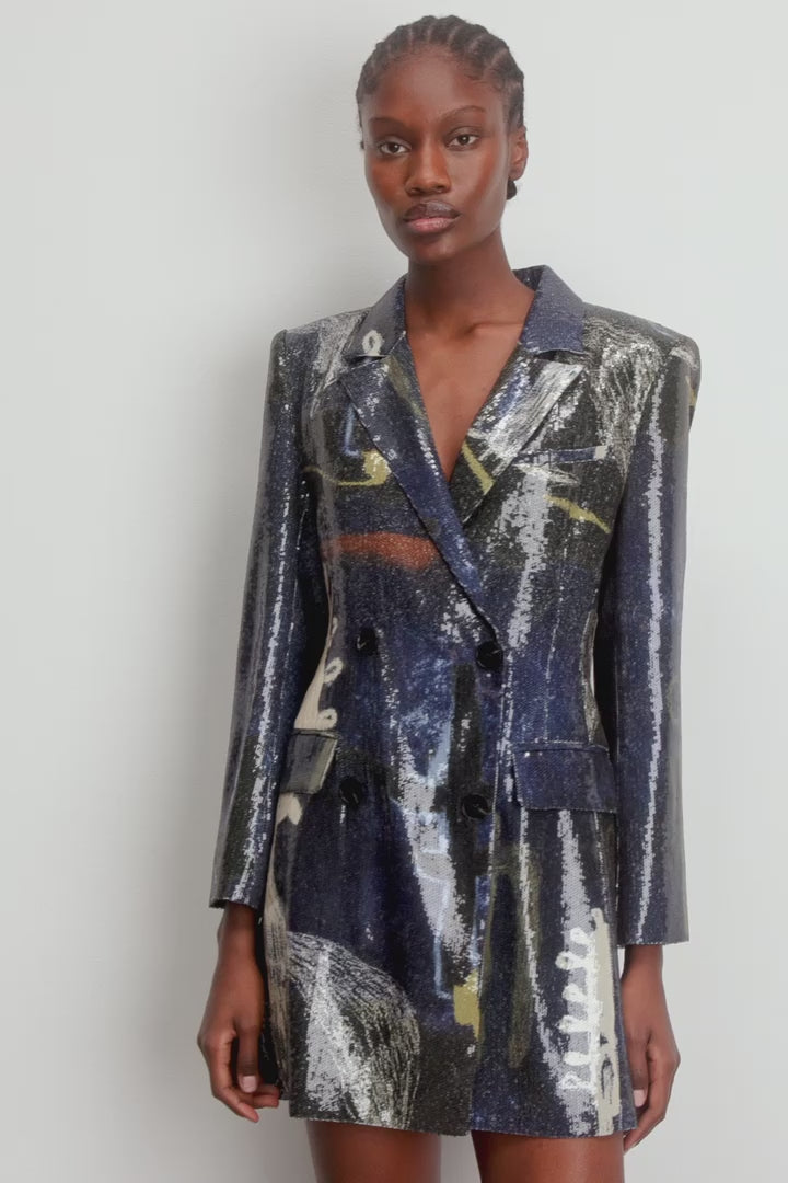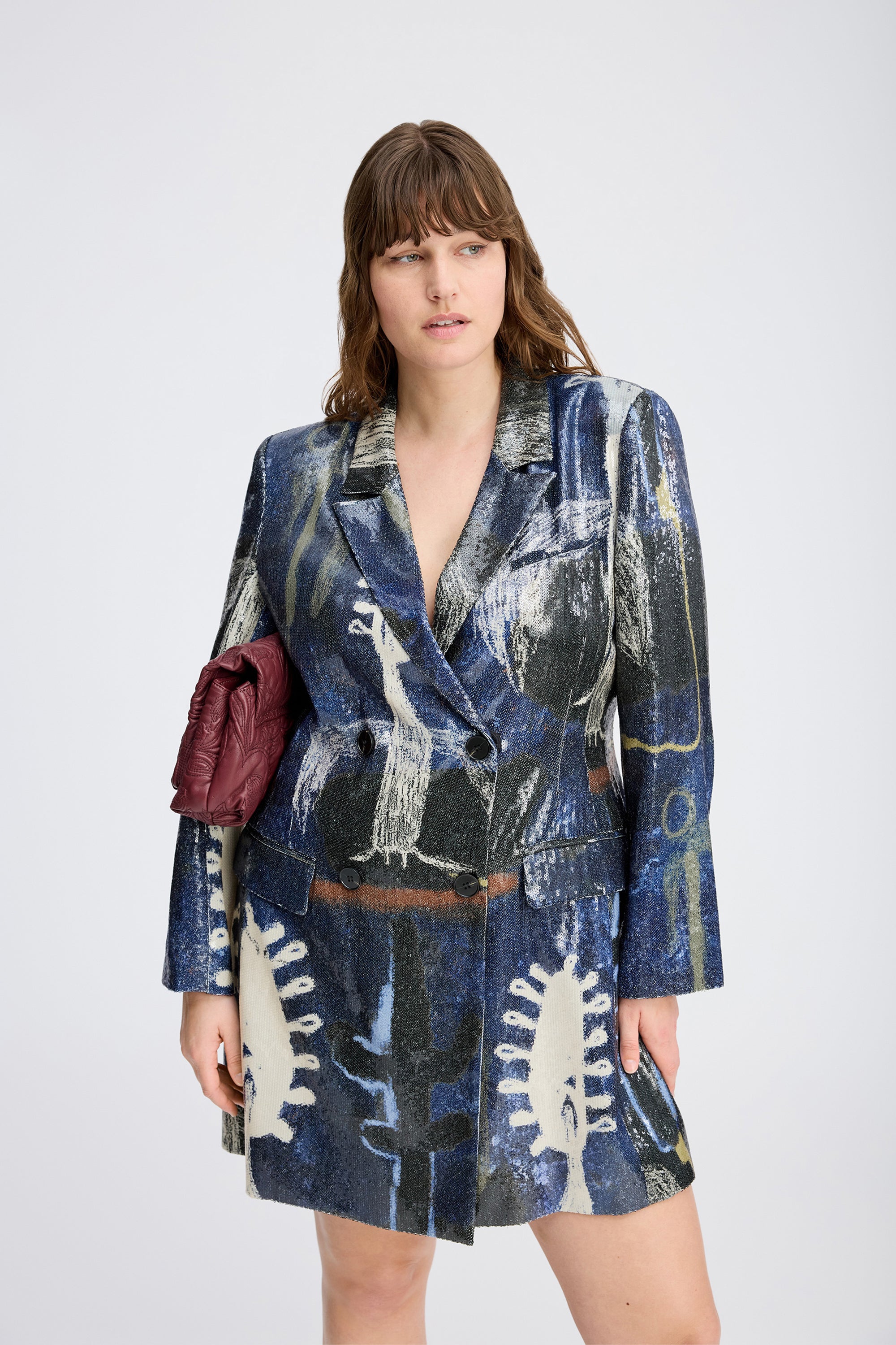 Long elegant blazer with a beautiful all-over sequin print. This blazer is designed with a slim fit, straight shoulders, long sleeves, and a double-breasted closure.