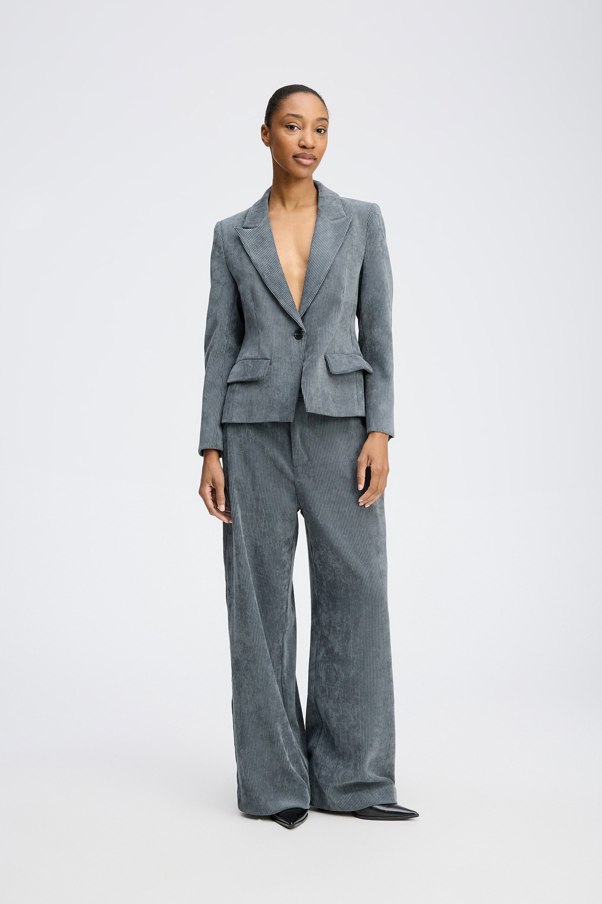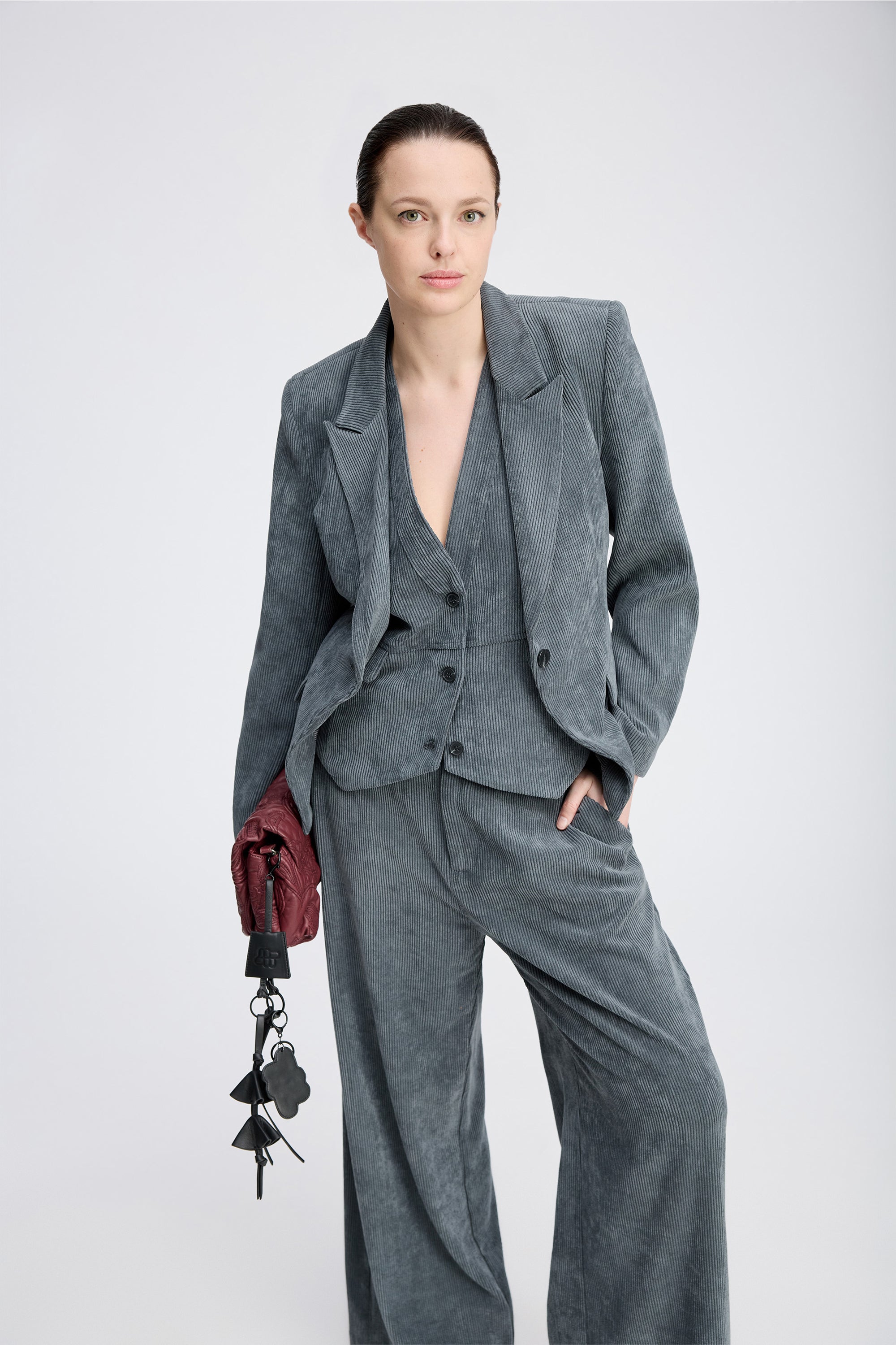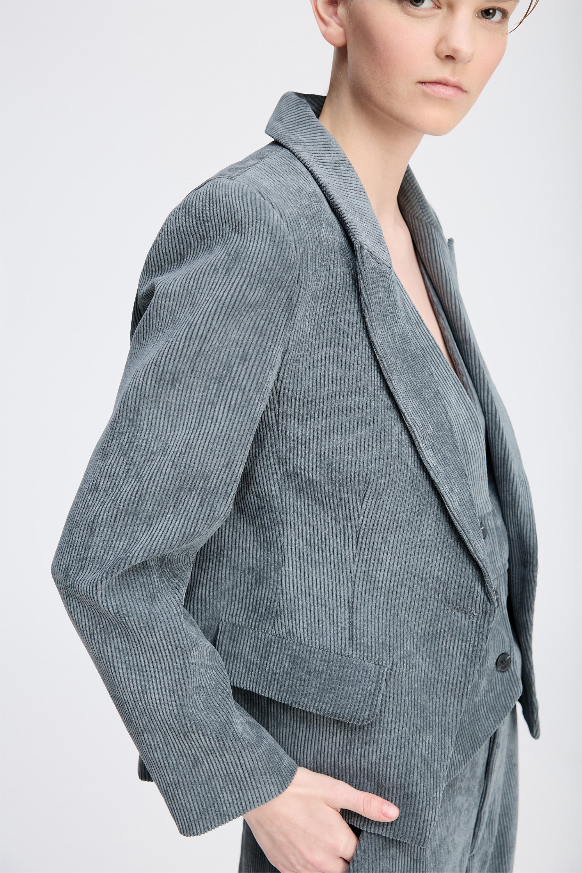 Beautiful, short velvet blazer with elegant flap pockets at the front. This blazer is designed for a slim fit and features straight shoulders, long sleeves, and a button closure.