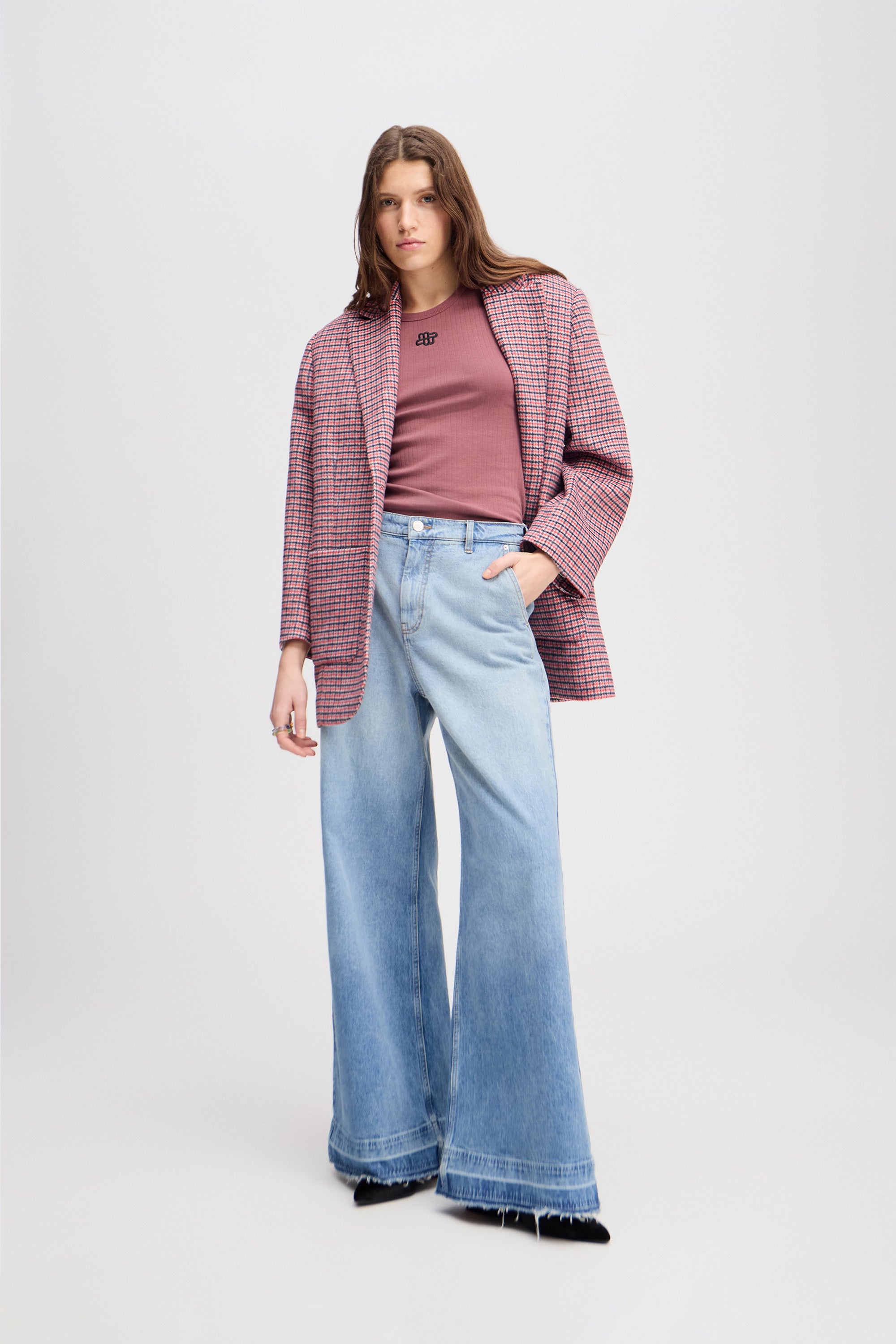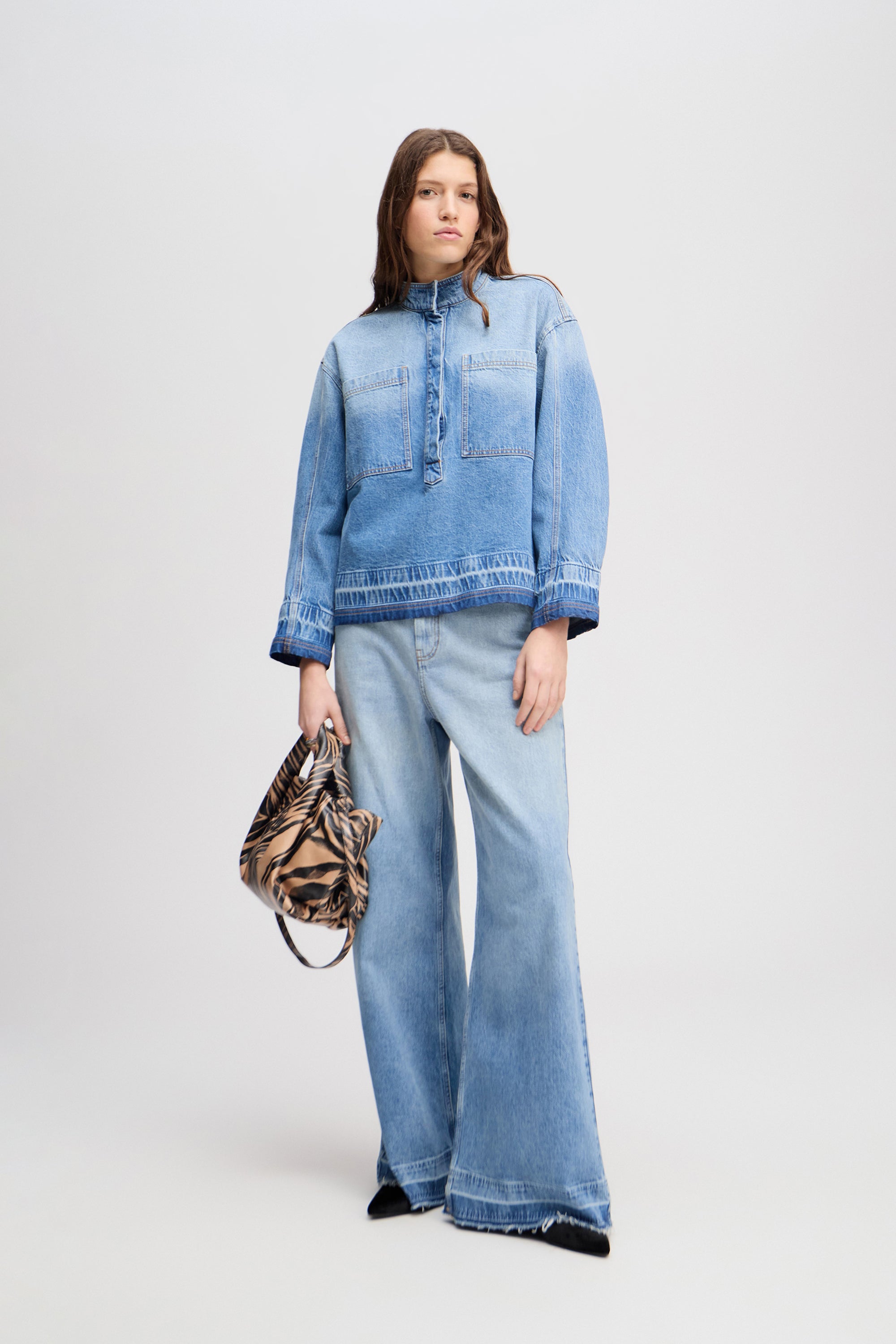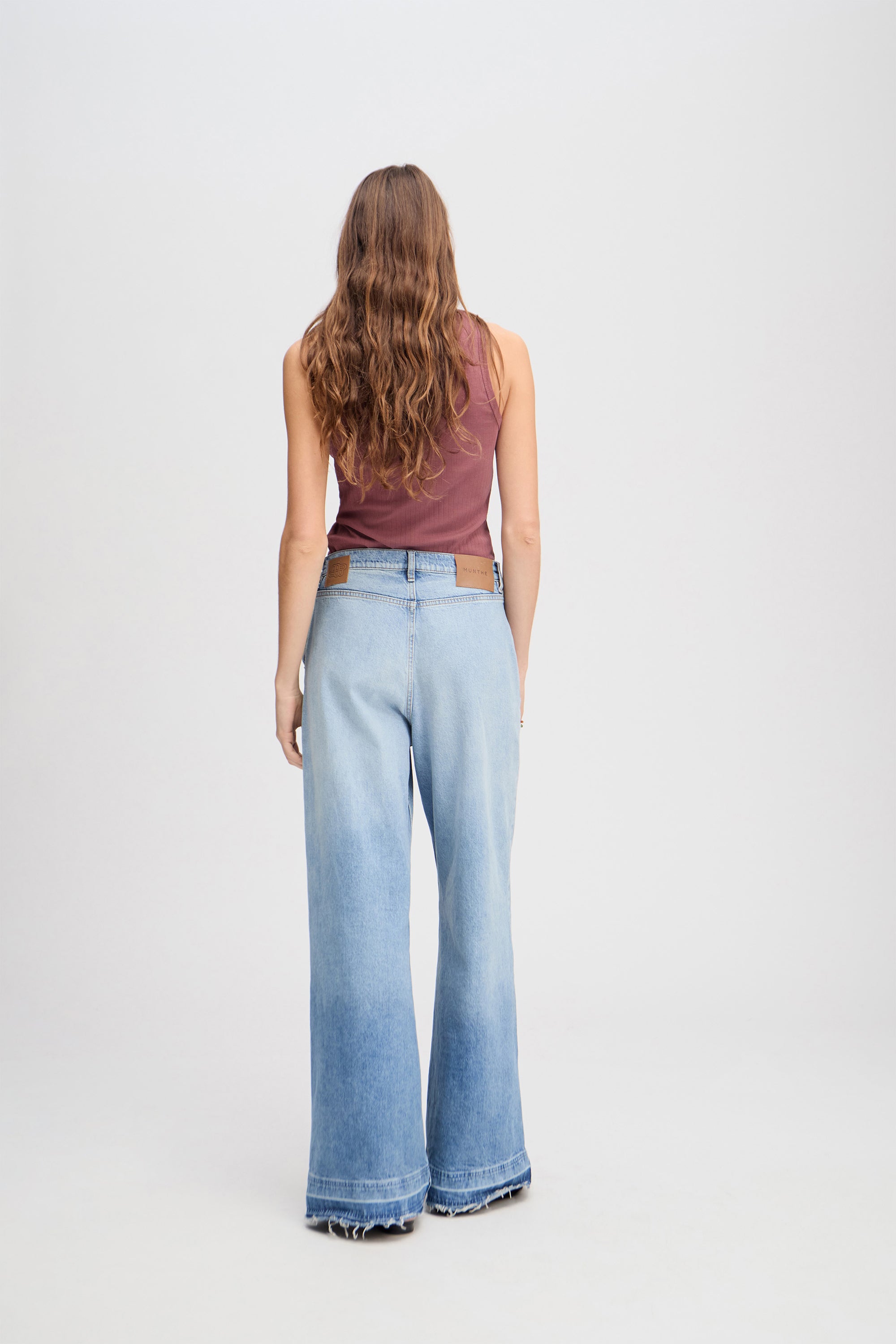 Denim pants with beautiful details at the bottom of each leg and a MUNTHE leather patch on the back. These denim pants are designed with slanted side pockets and are fastened with a zipper and a single button.