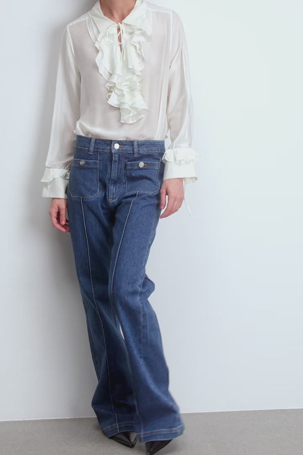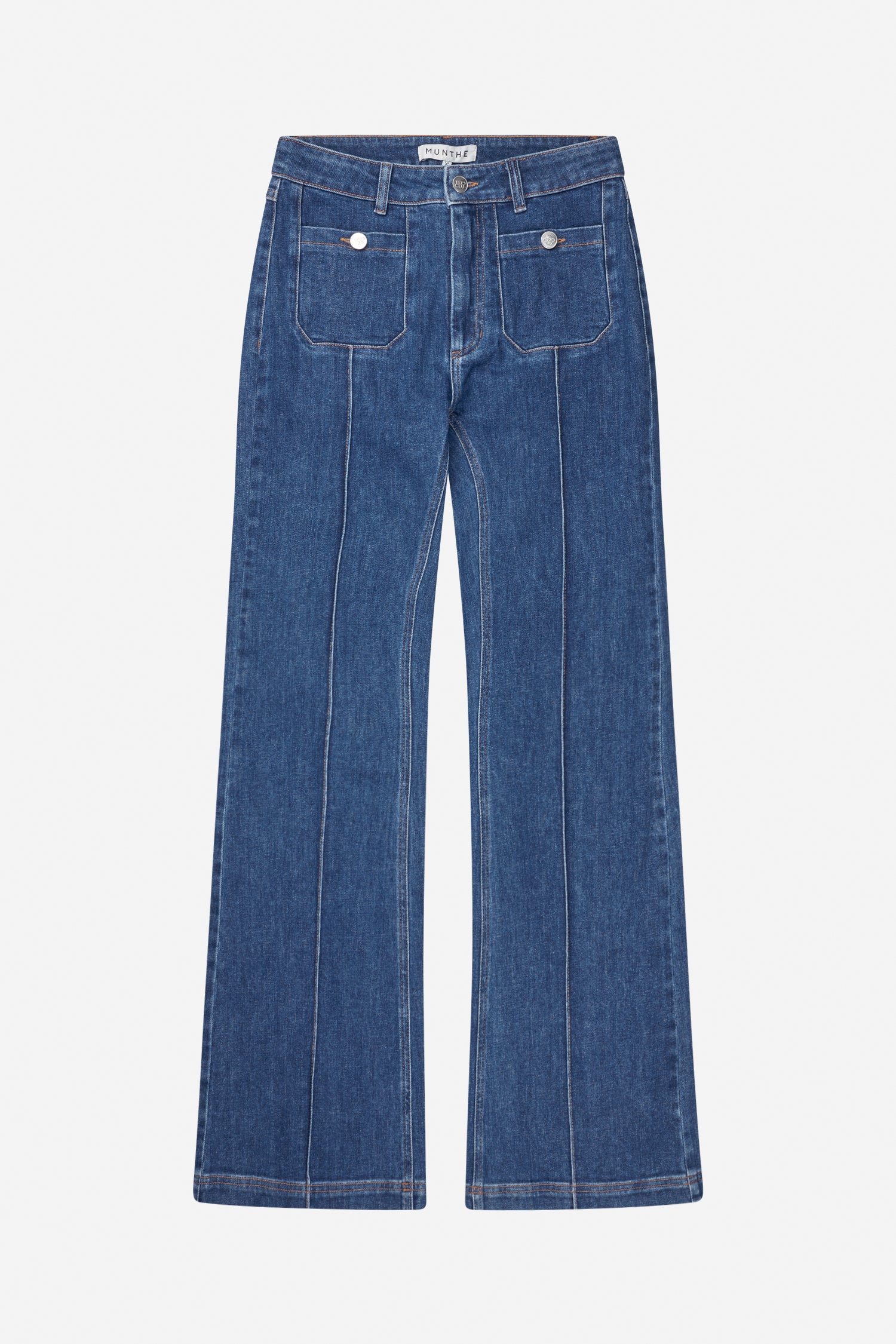 Denim trousers with pressed creases, two fine front pockets that can be closed with a button, as well as two back pockets. These denim trousers feature an elegant MUNTHE leather patch on the back and are fastened with a zipper and a single button.