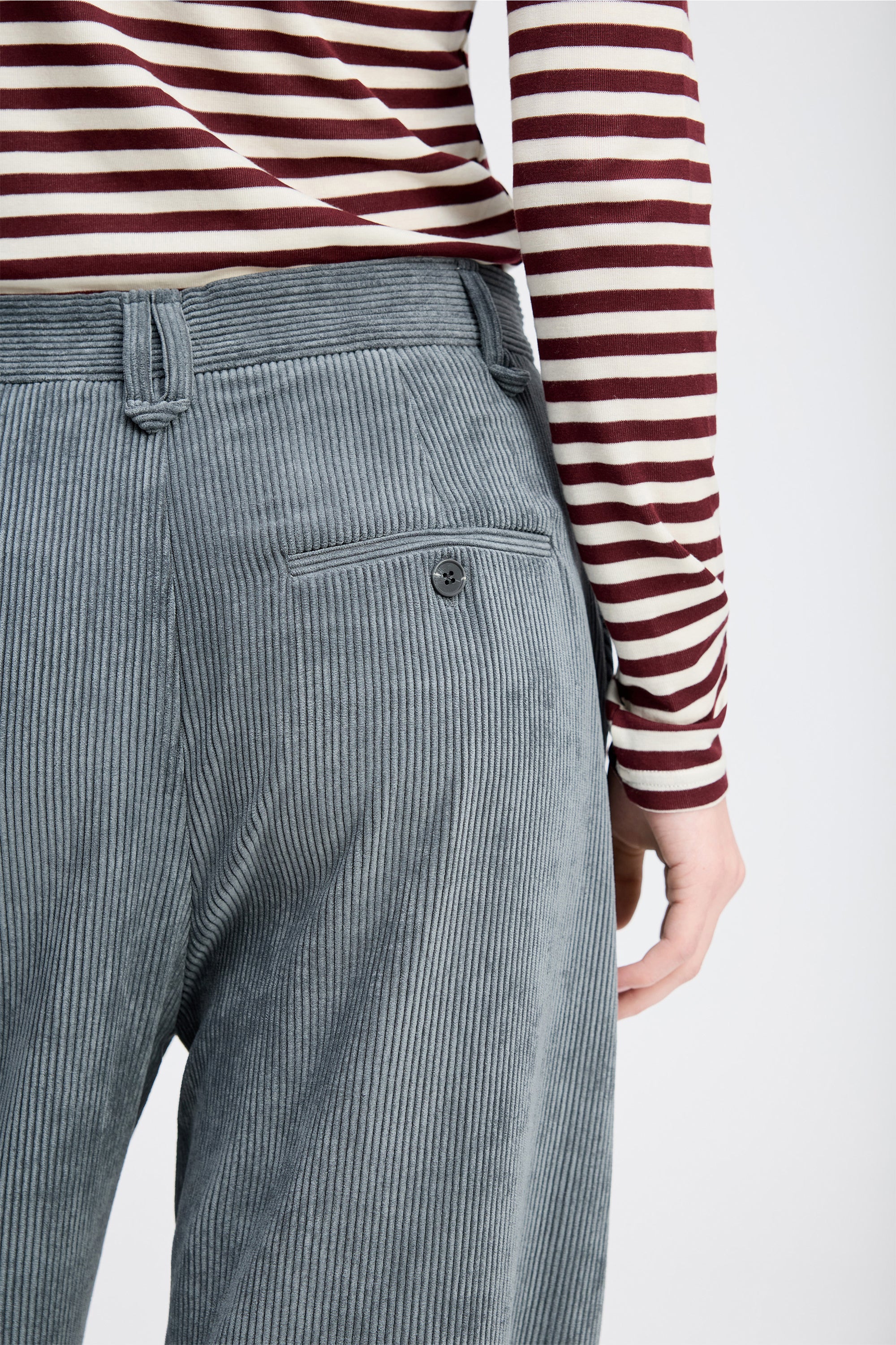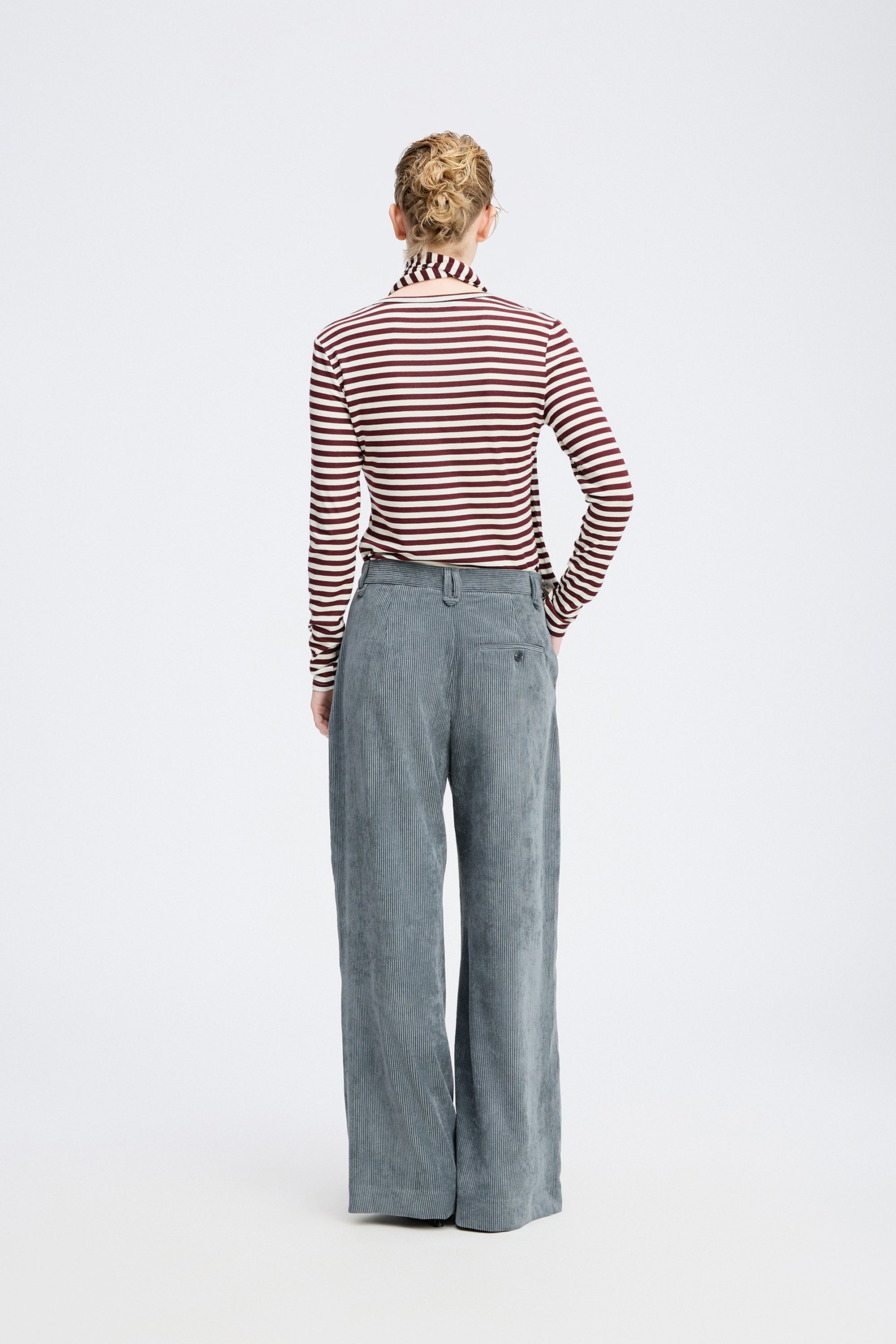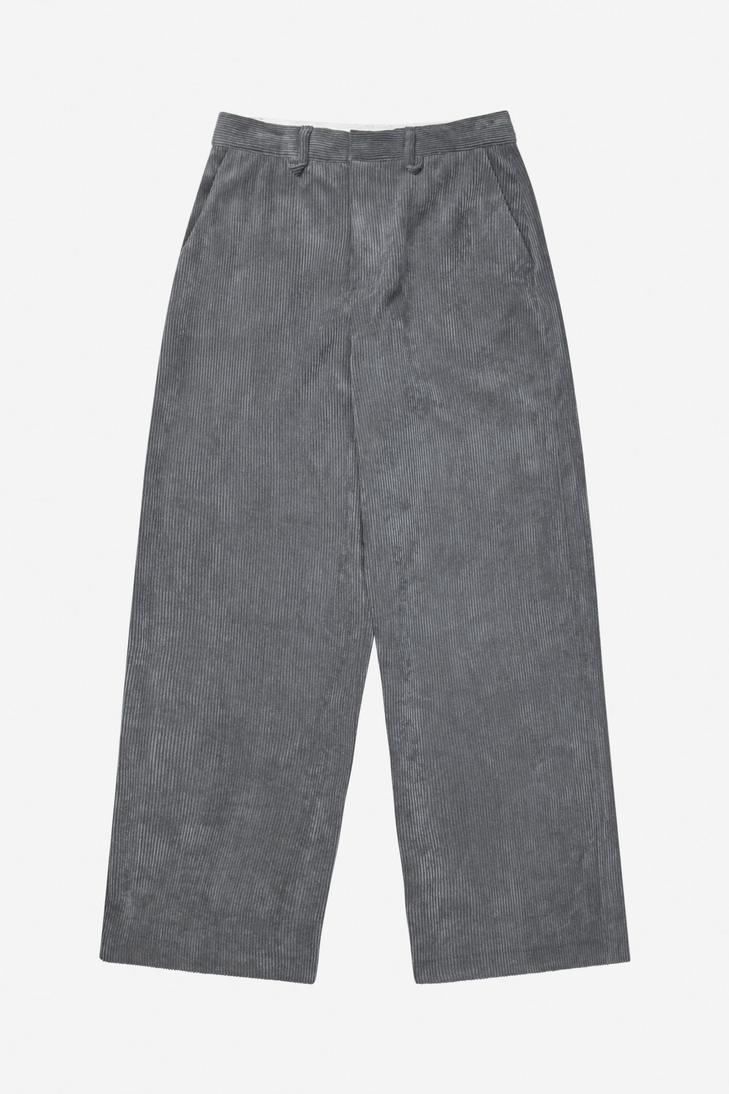 Beautiful corduroy trousers designed with elegant details such as wide legs, belt loops, and side pockets. The trousers fasten with a front zipper.