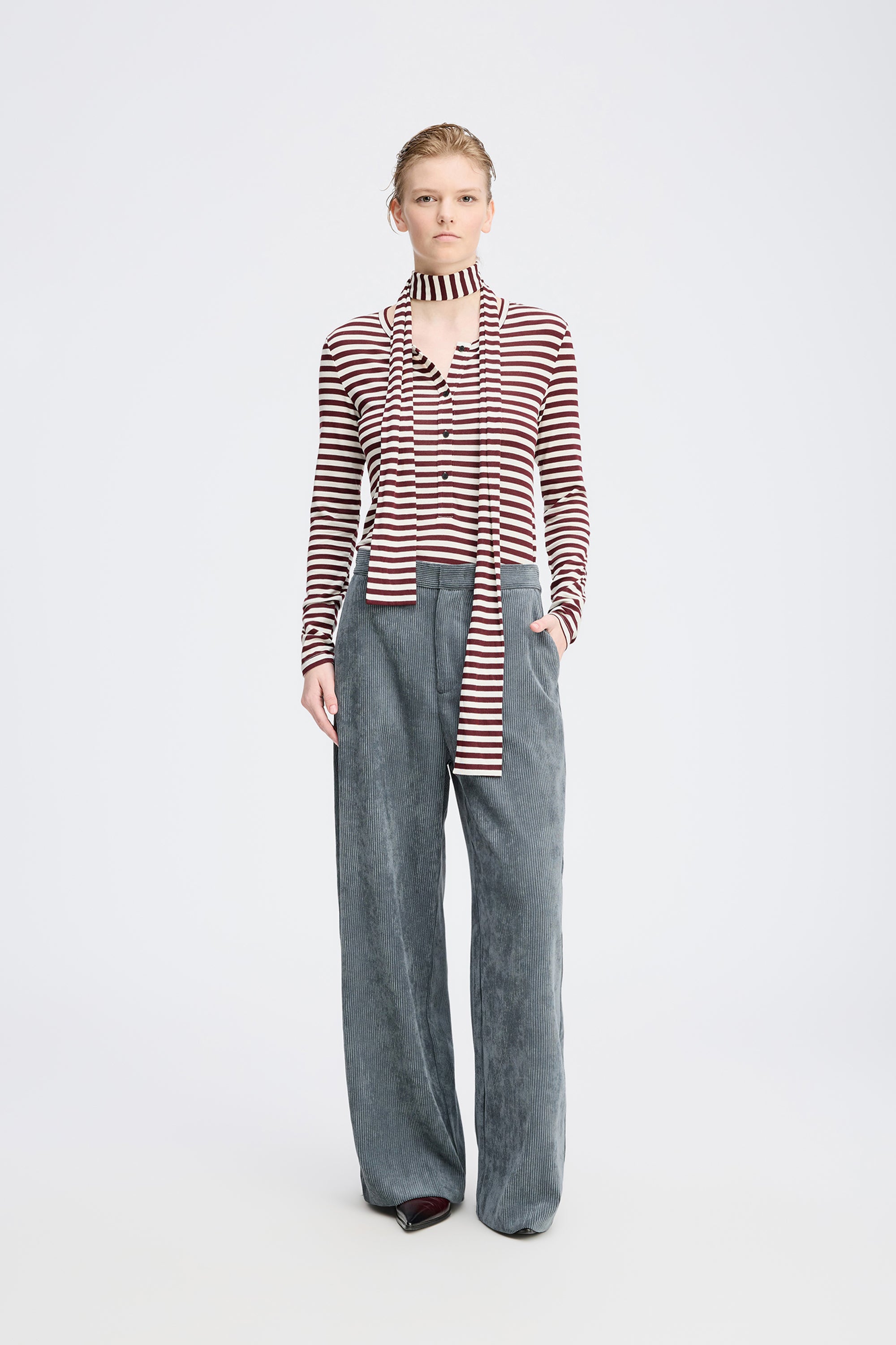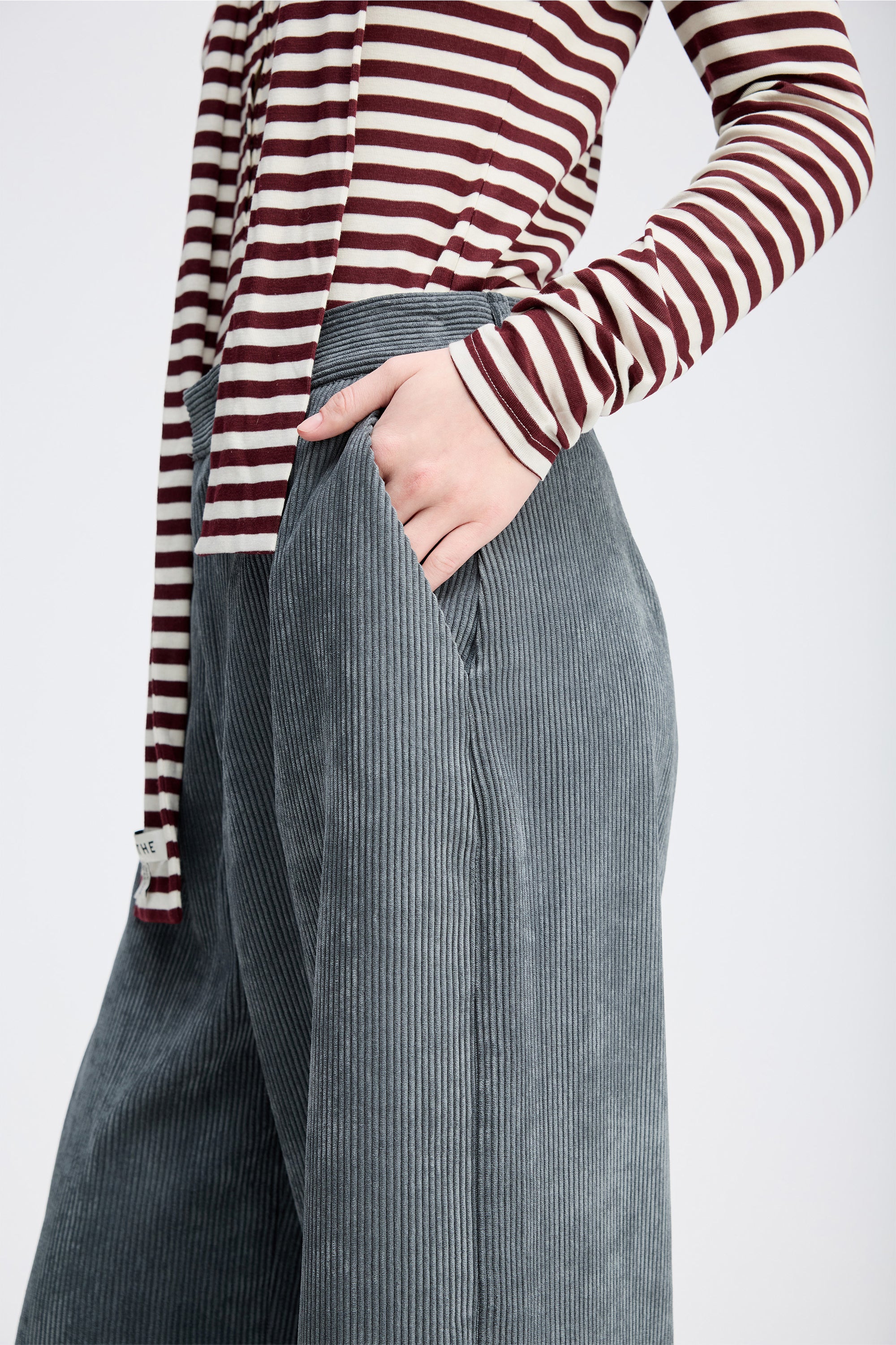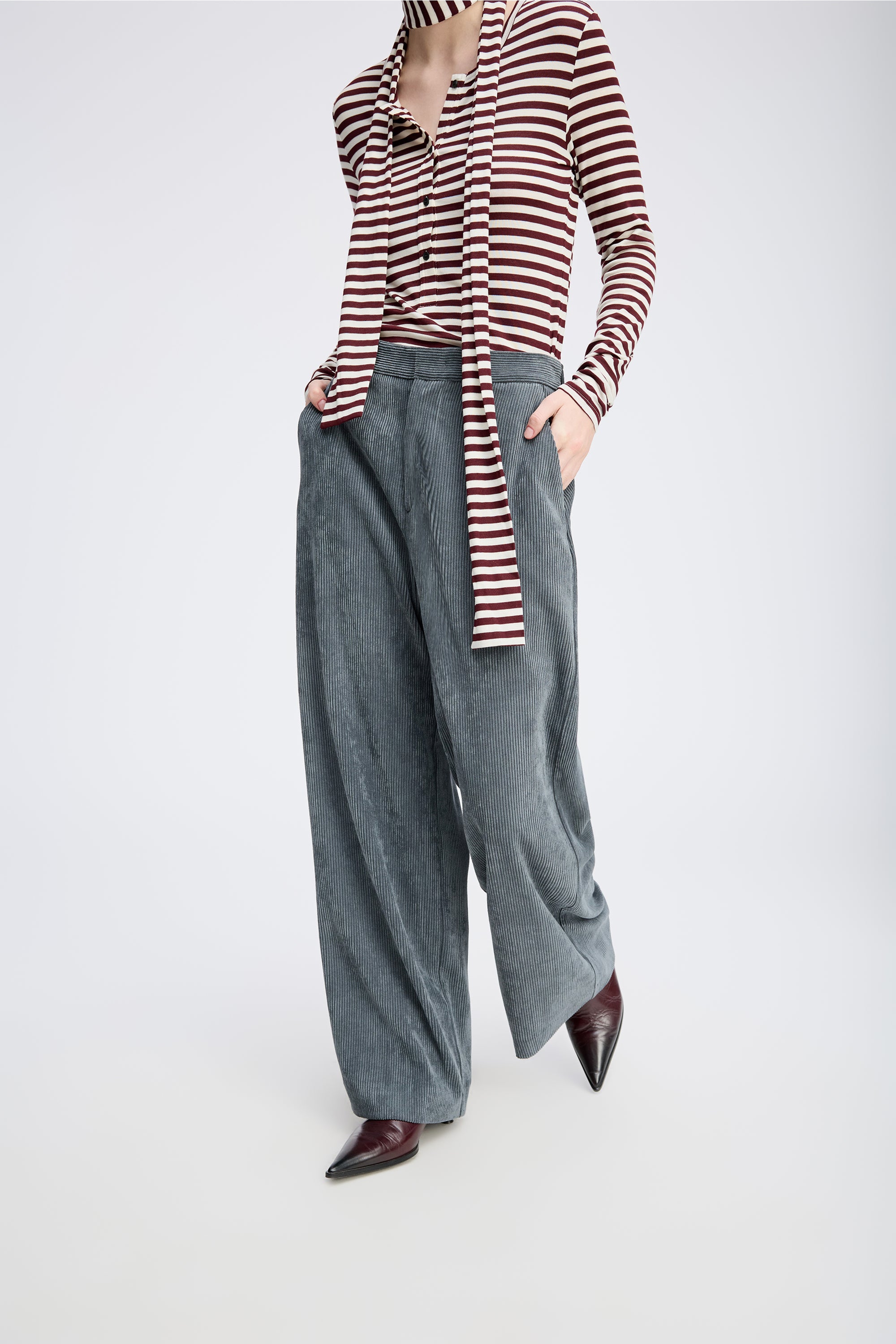 Beautiful corduroy trousers designed with elegant details such as wide legs, belt loops, and side pockets. The trousers fasten with a front zipper.