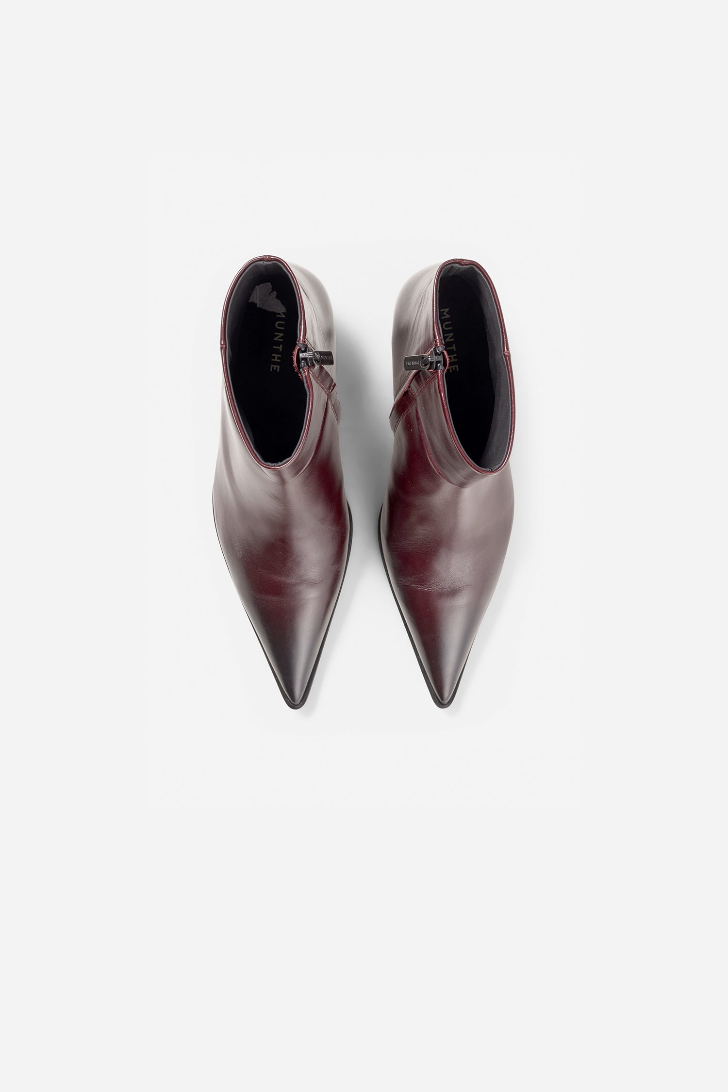 A beautiful leather boot with a pointed toe and low heel. It has a lovely burgundy tone that transitions into a darker shade at the toe and heel of the shoe. The shoe is closed with a zipper on the side.