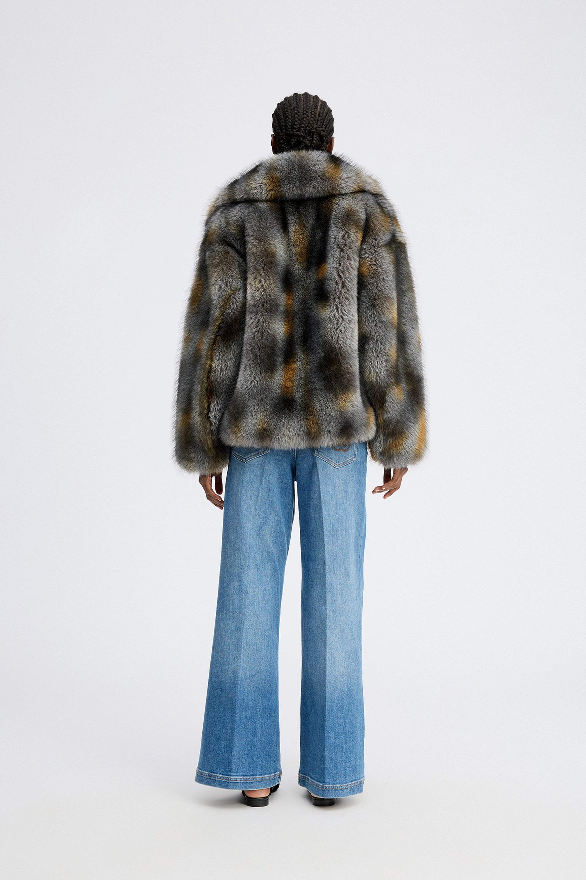 A beautiful short faux fur jacket in elegant shades of grey, black, and brown. Designed with a voluminous silhouette and a wide collar. The jacket features side pockets and fastens with an elegant button closure.