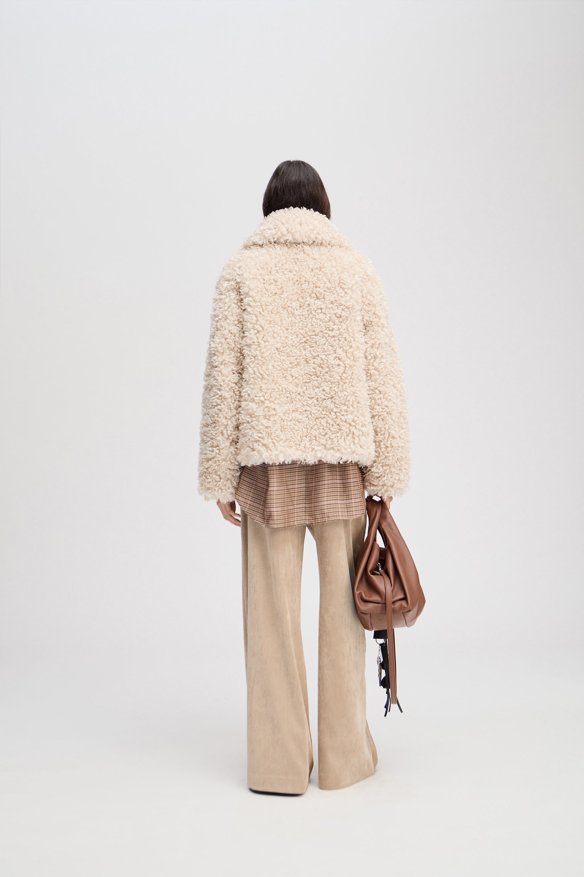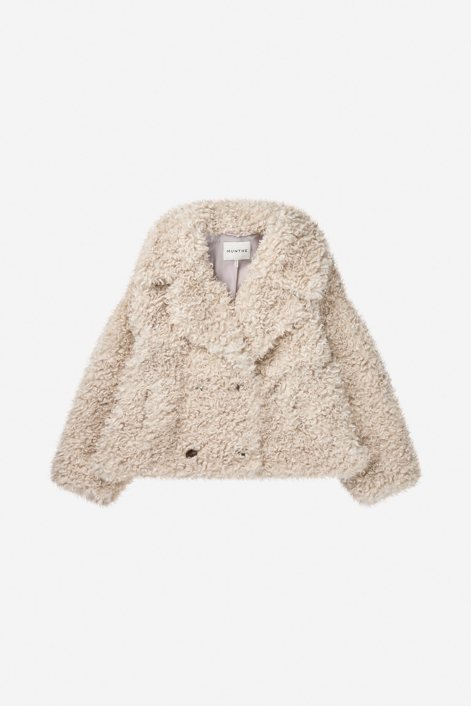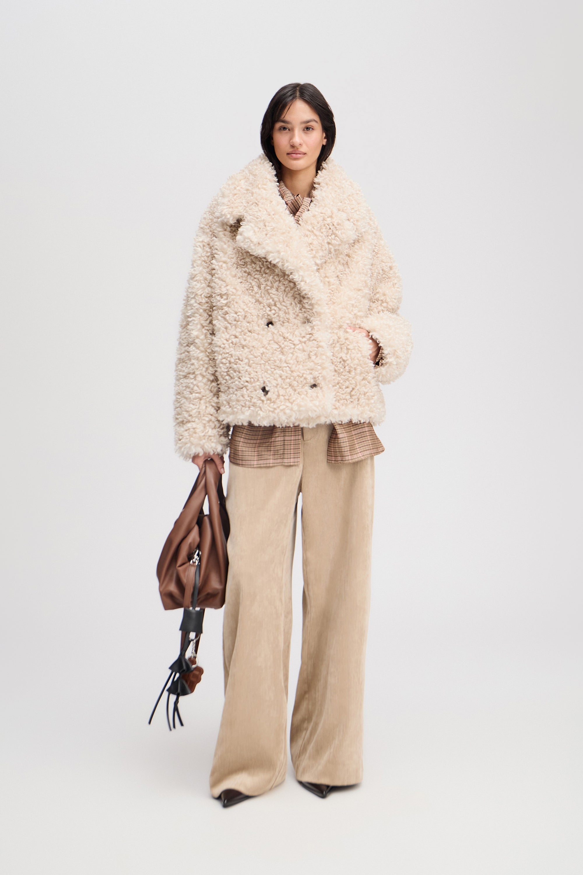 A beautiful, short teddy jacket with double-breasted button fastening and an elegant wide collar. The jacket is designed with side pockets.