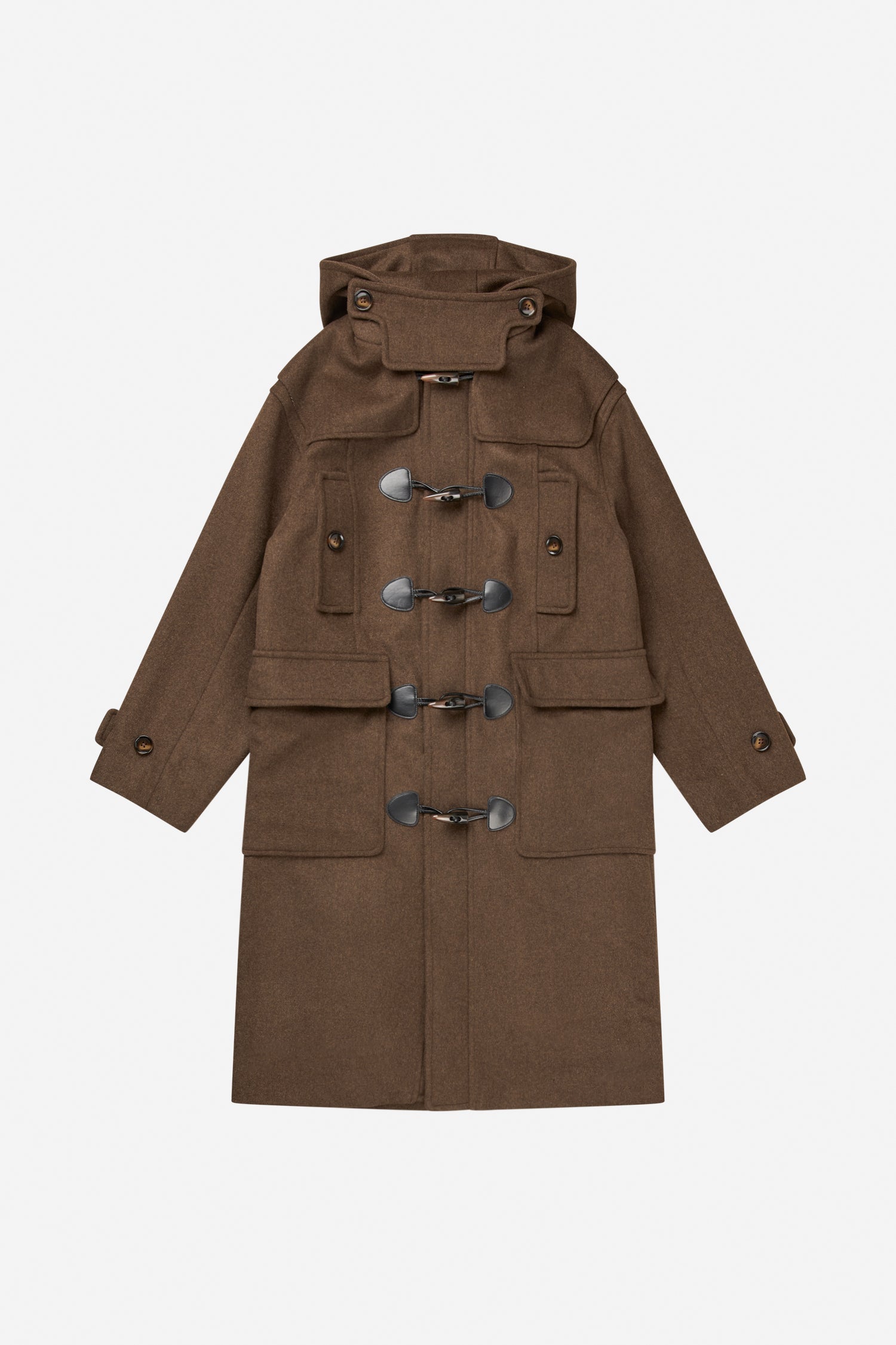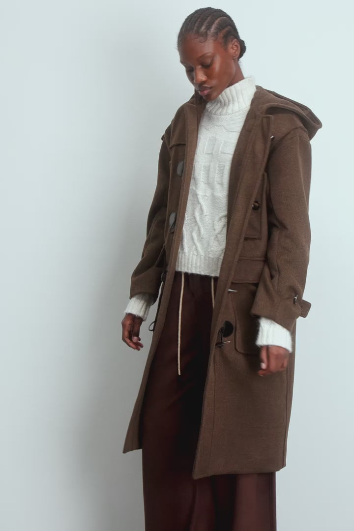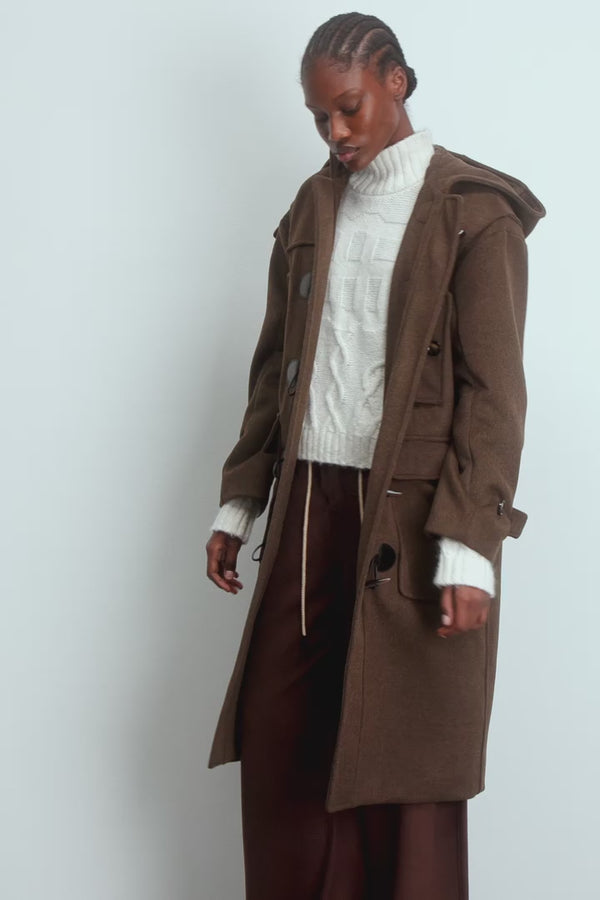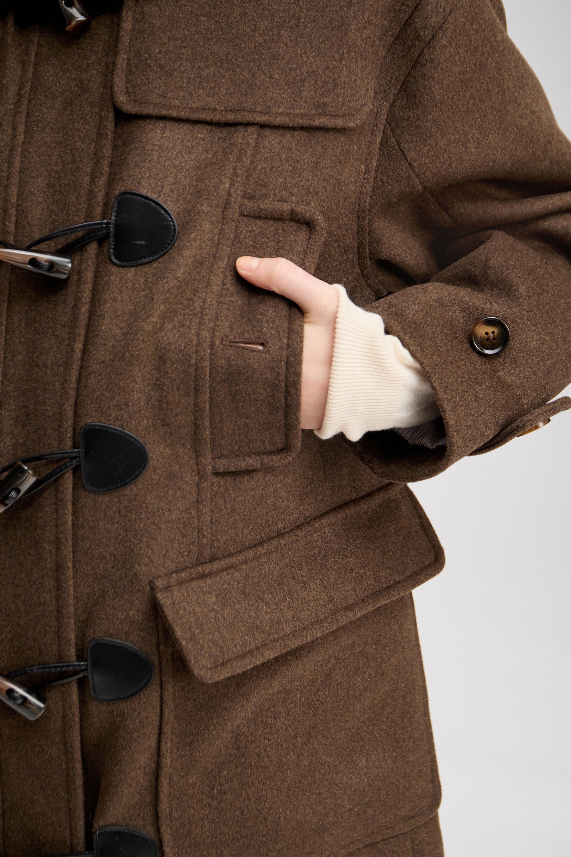 A beautiful coat with toggle closures and faux horn buttons, complemented by an elegant hood. The coat is designed with oversized flap pockets and smaller side pockets near the chest. The neckline can be adjusted as needed depending on the weather, and the sleeve width at the wrists can be adjusted using buttons.