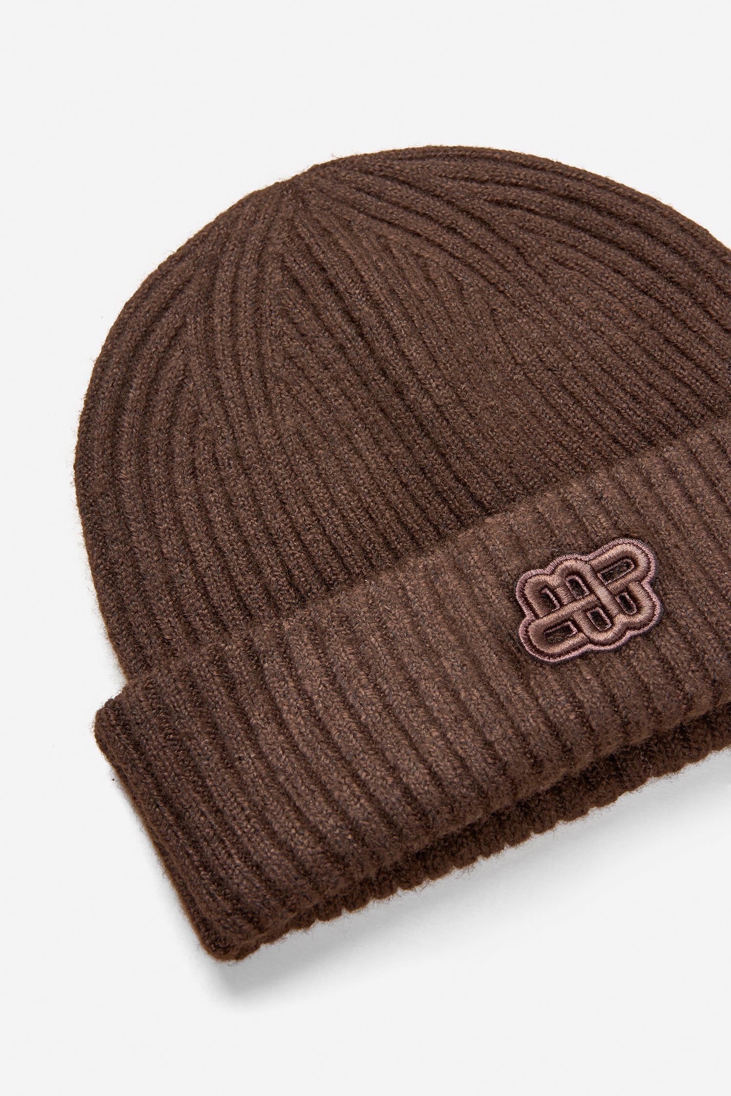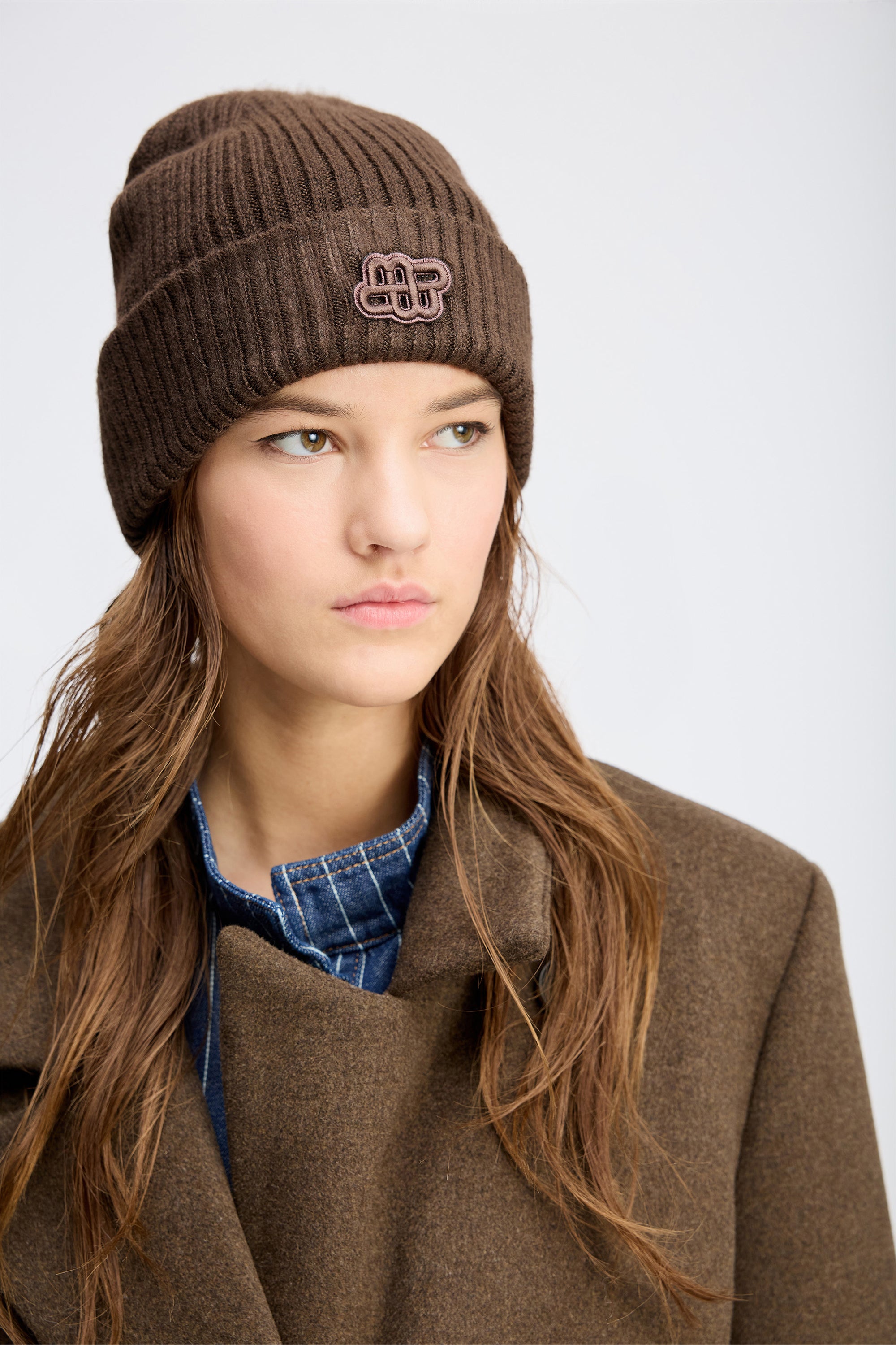 A beautiful ribbed knit hat with an elegant MUNTHE emblem on the front. Made from a soft recycled polyester blend.
