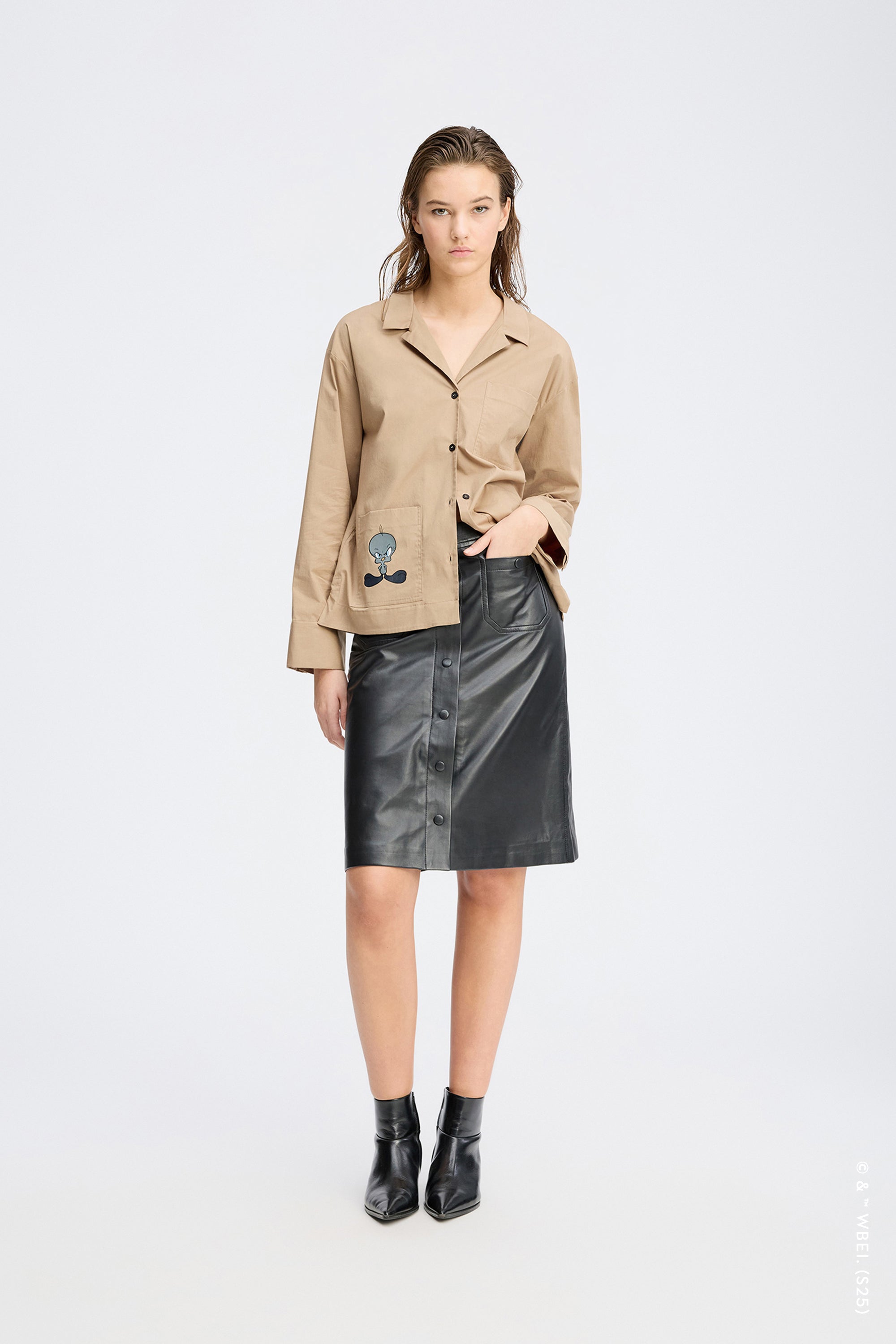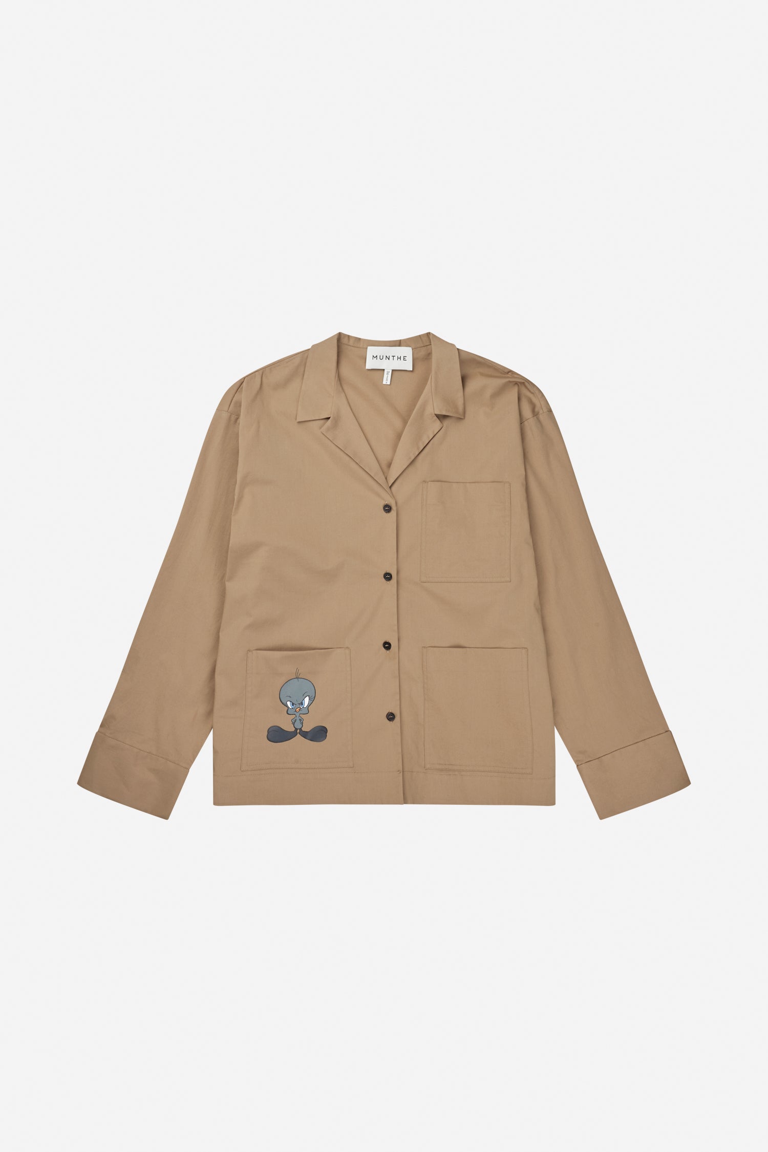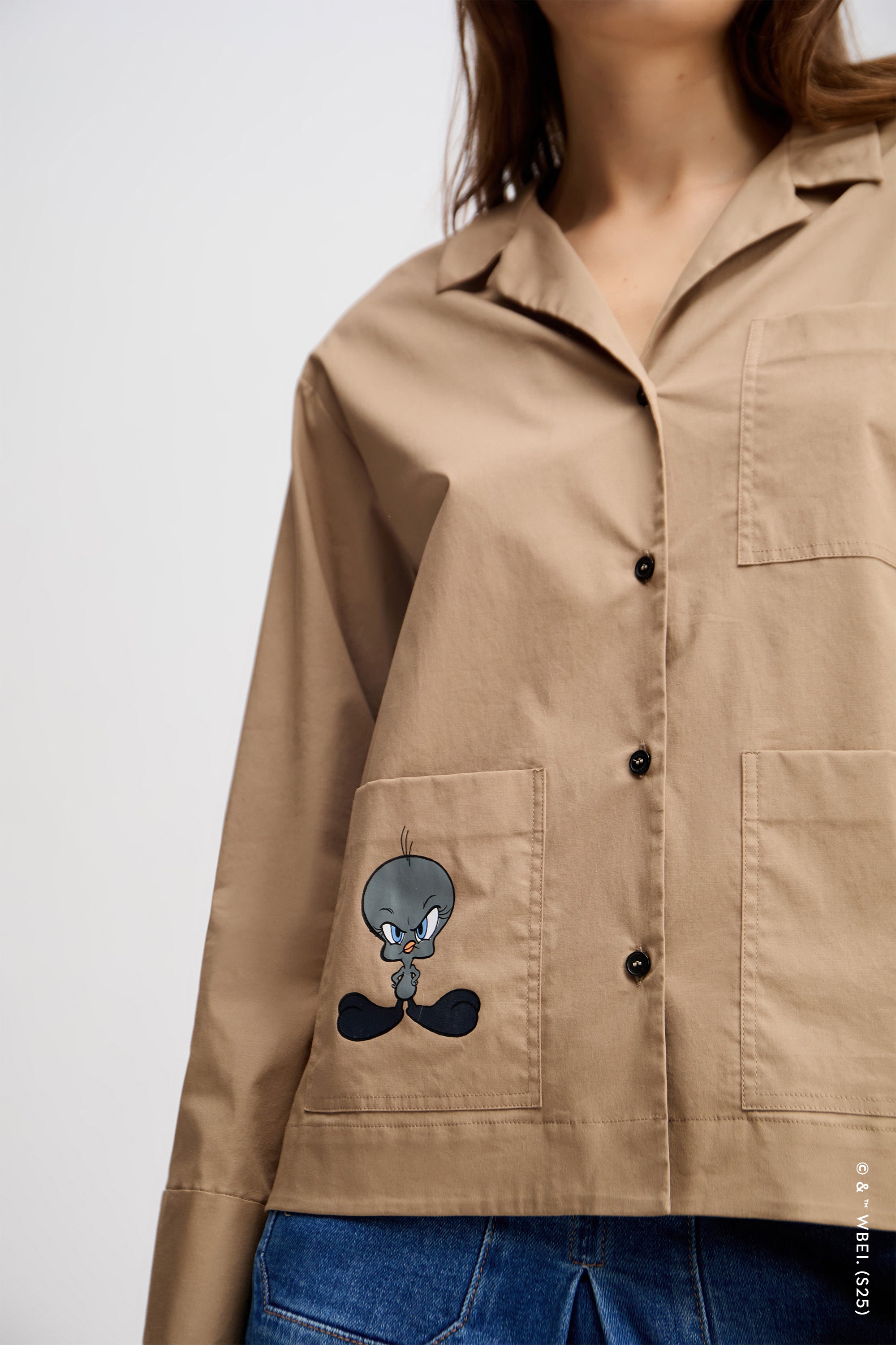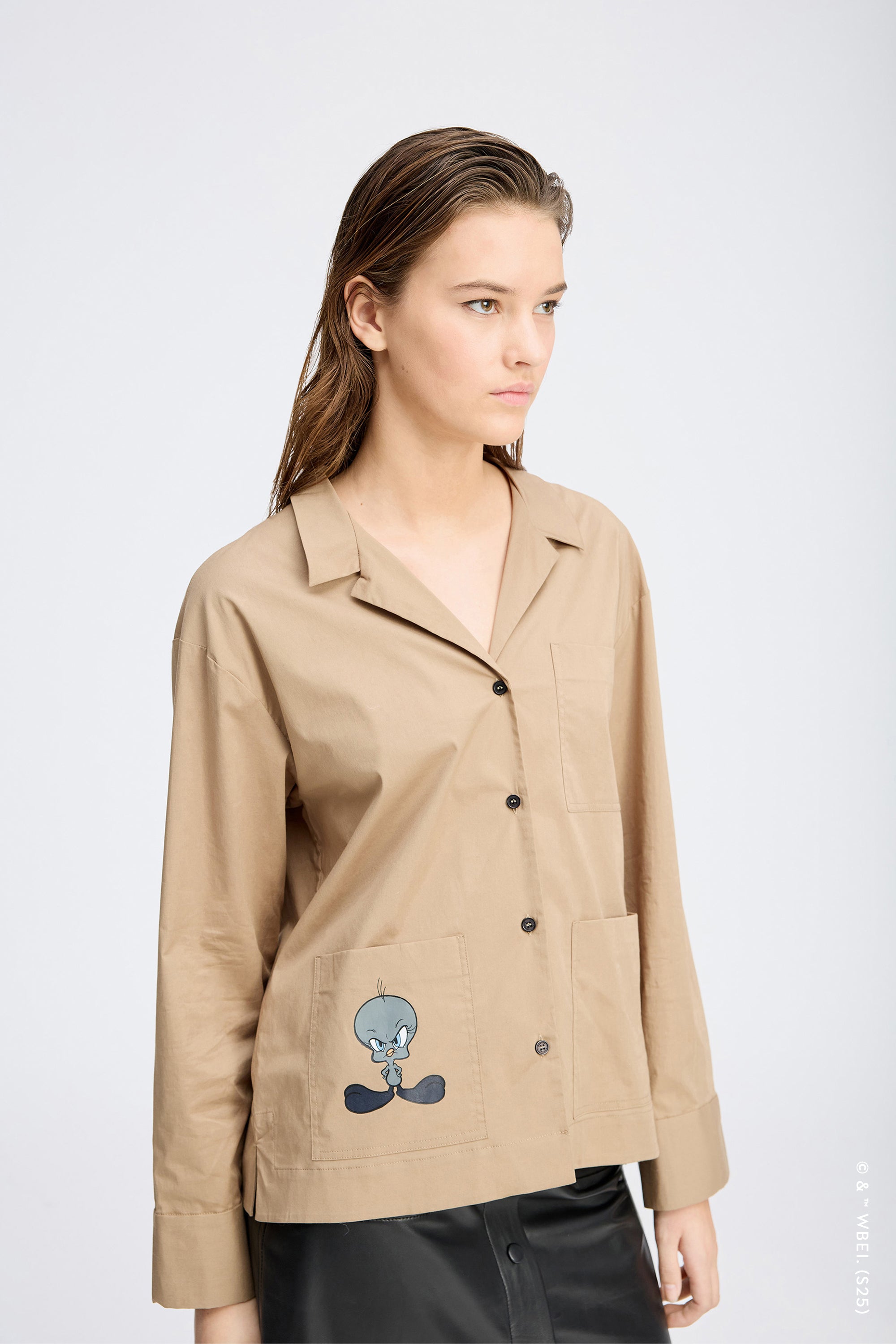 Elegant workwear-inspired shirt with a fine Tweety print on one of the pockets. The shirt is designed with three pockets and fine black buttons. This shirt is created in collaboration with Warner Bros. Discovery Global Consumer Products (WBDGCP).
