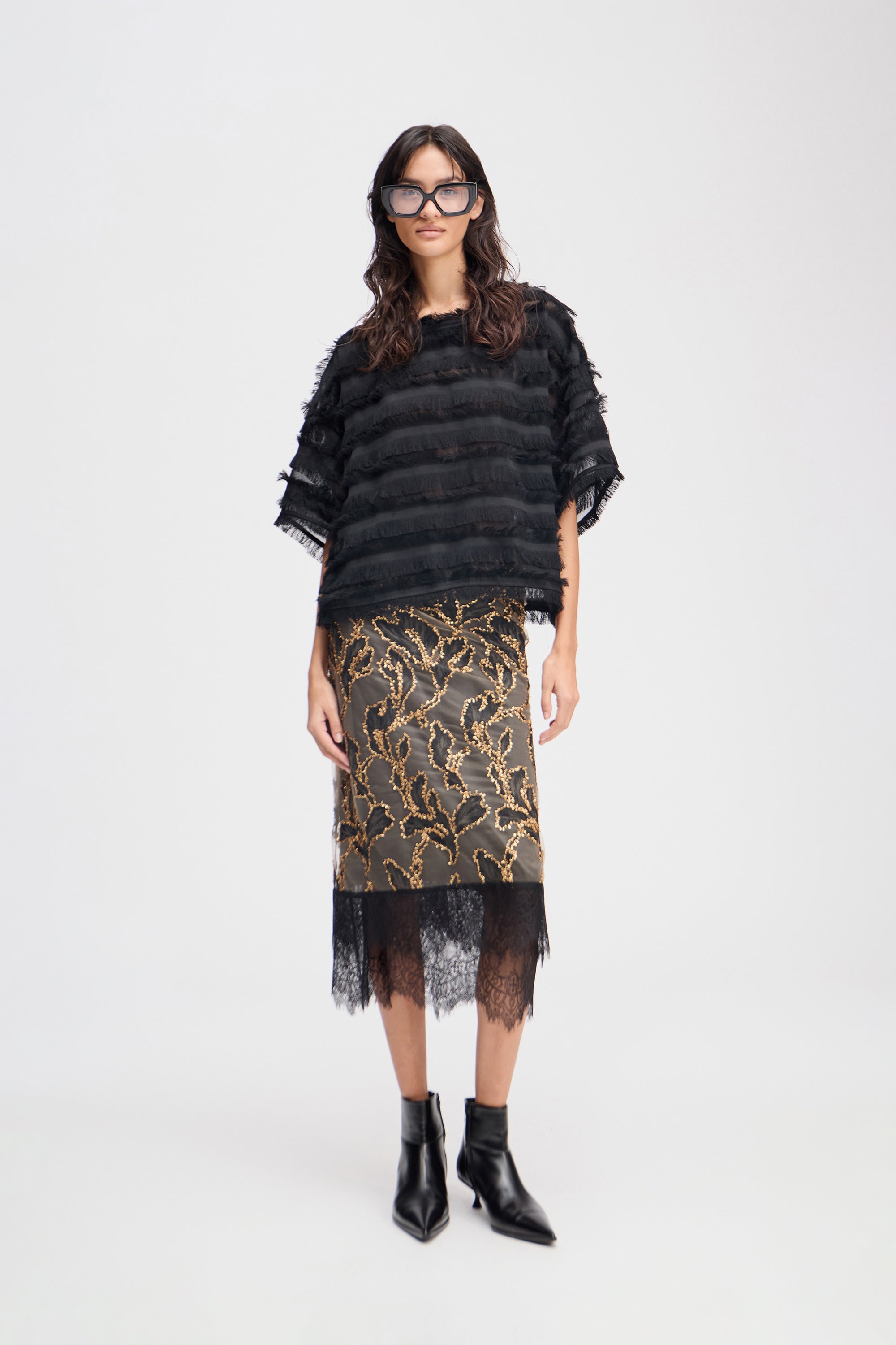 A beautiful, transparent blouse with delicate fringes. The blouse is designed with a round neckline, dropped shoulders, and wide, beautiful short sleeves.
