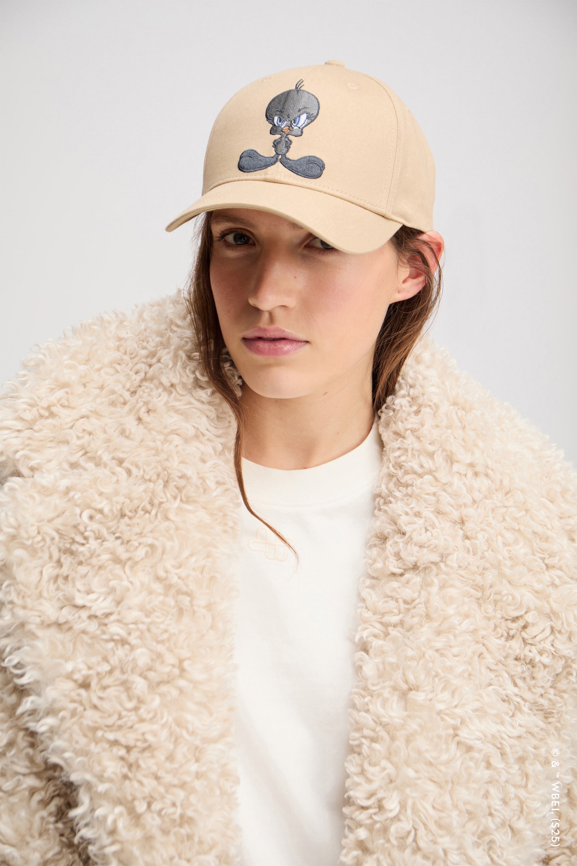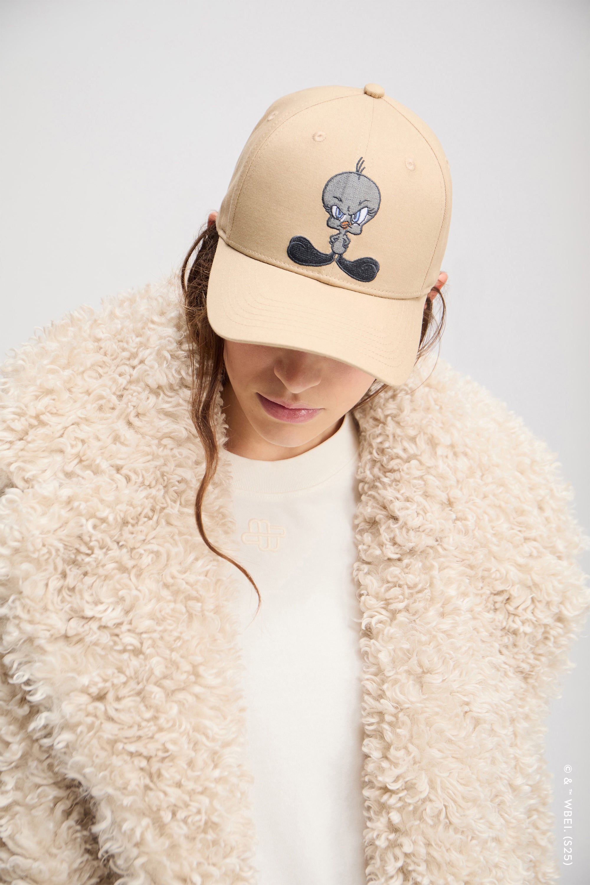 Cap with a beautiful Tweety embroidery. The text "LOONEY TUNES X MUNTHE" is embroidered on the back. This cap is made in collaboration with Warner Bros. Discovery Global Consumer Products (WBDGCP).
