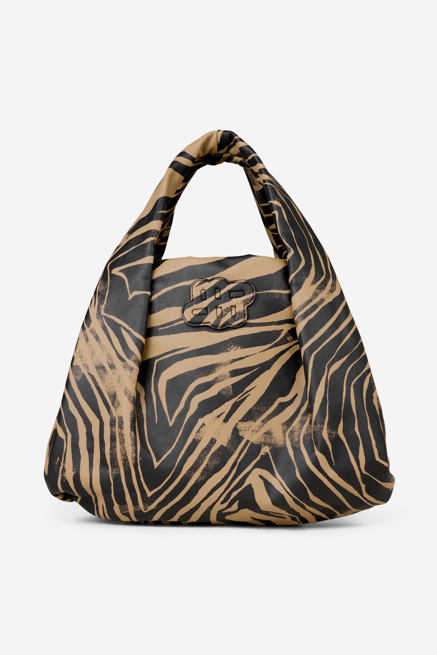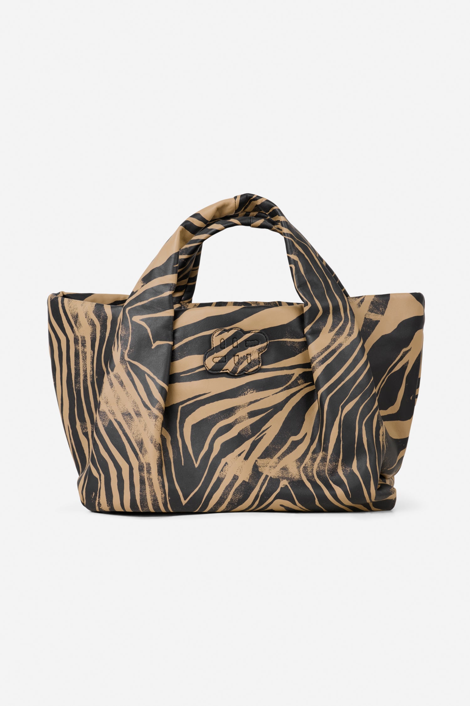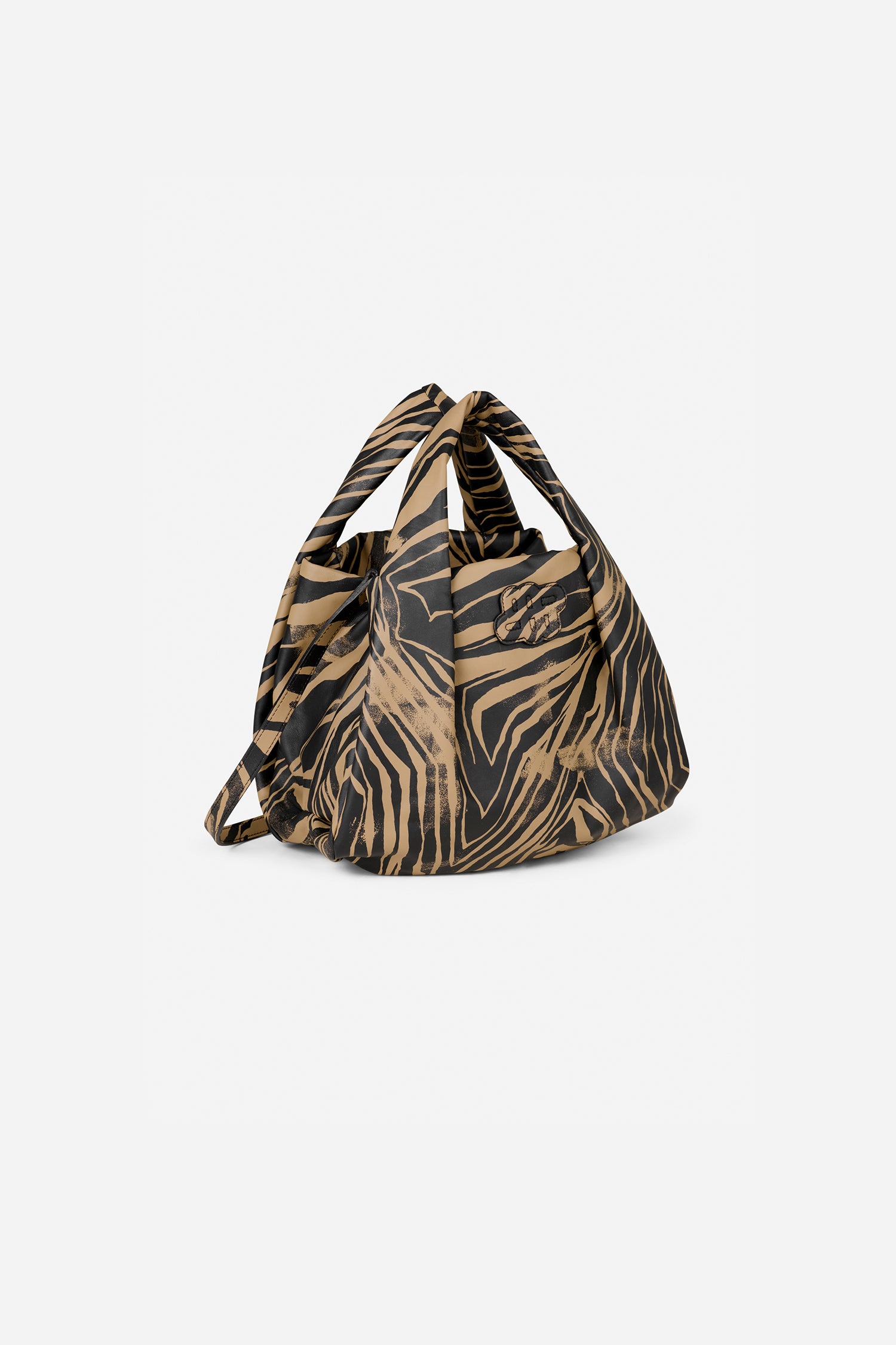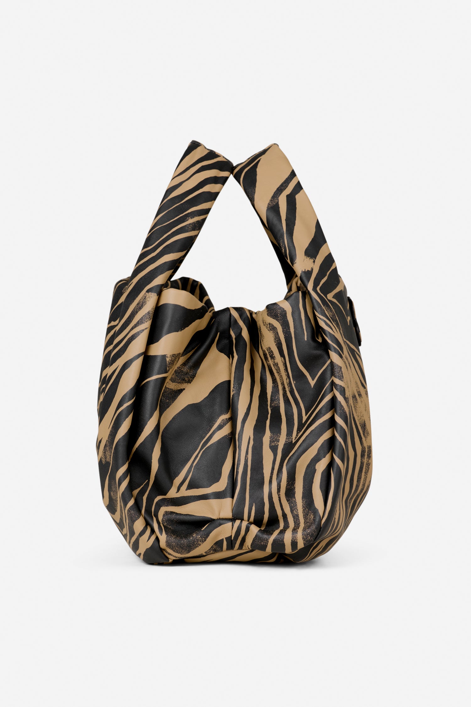 A beautiful bag made of soft leather with two elegant, wide handles and a lovely MUNTHE emblem on the side. The bag is designed with a detachable shoulder strap and features a large main compartment as well as a smaller side pocket inside.