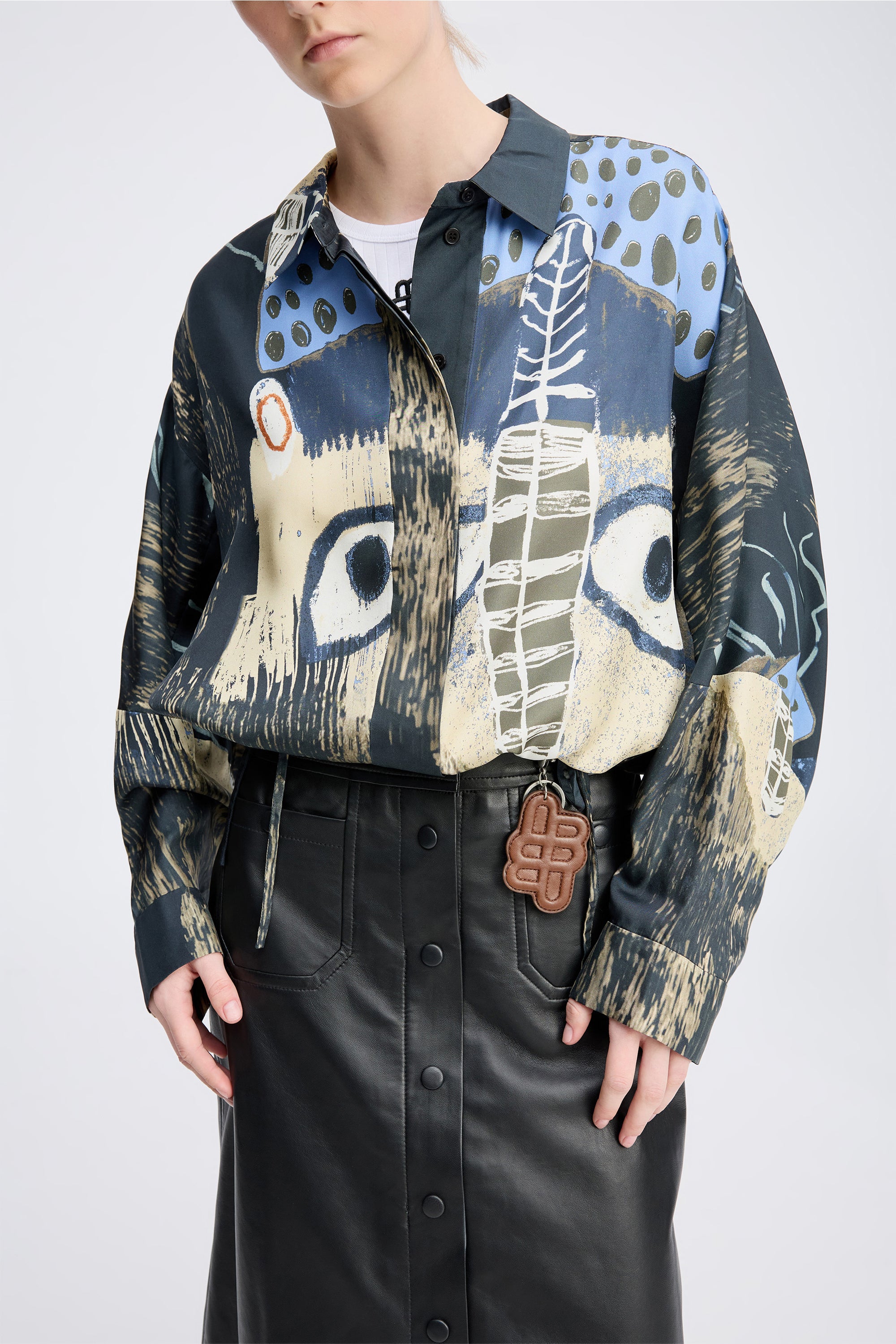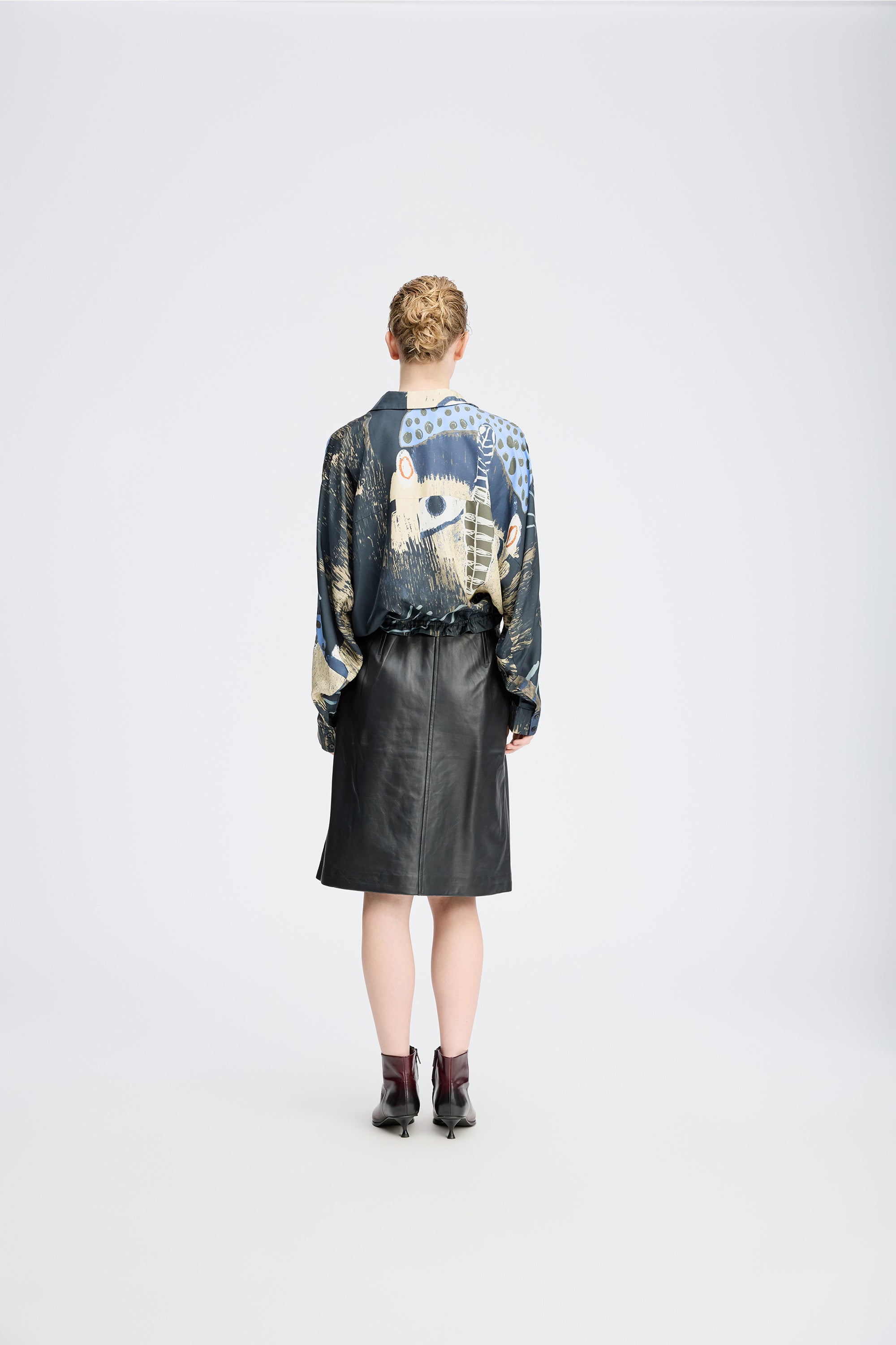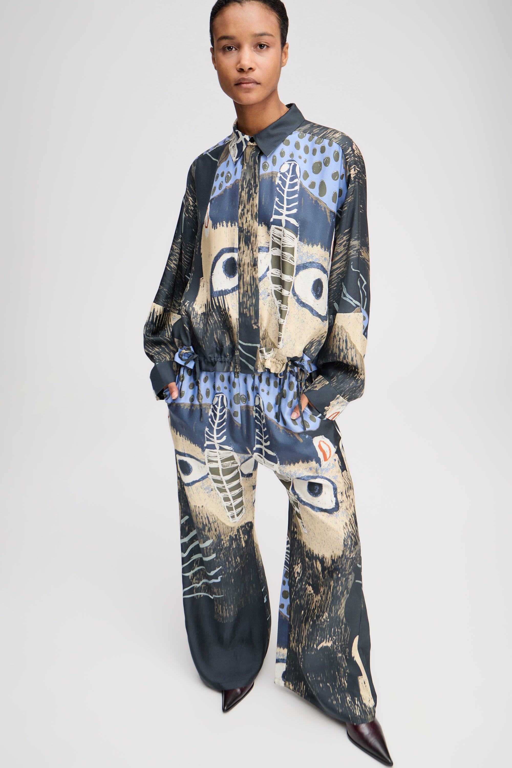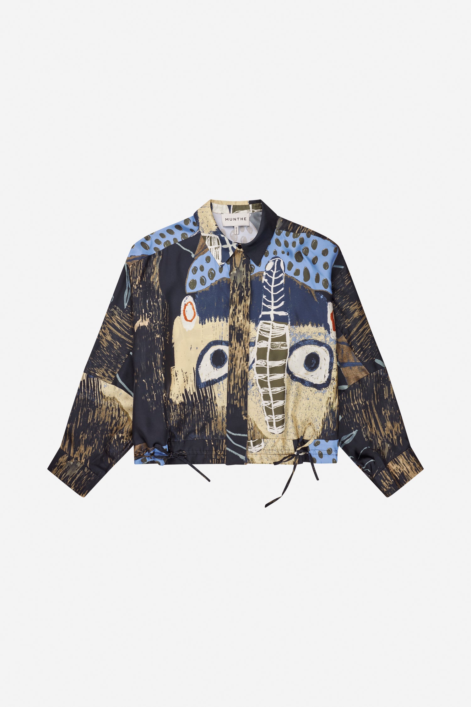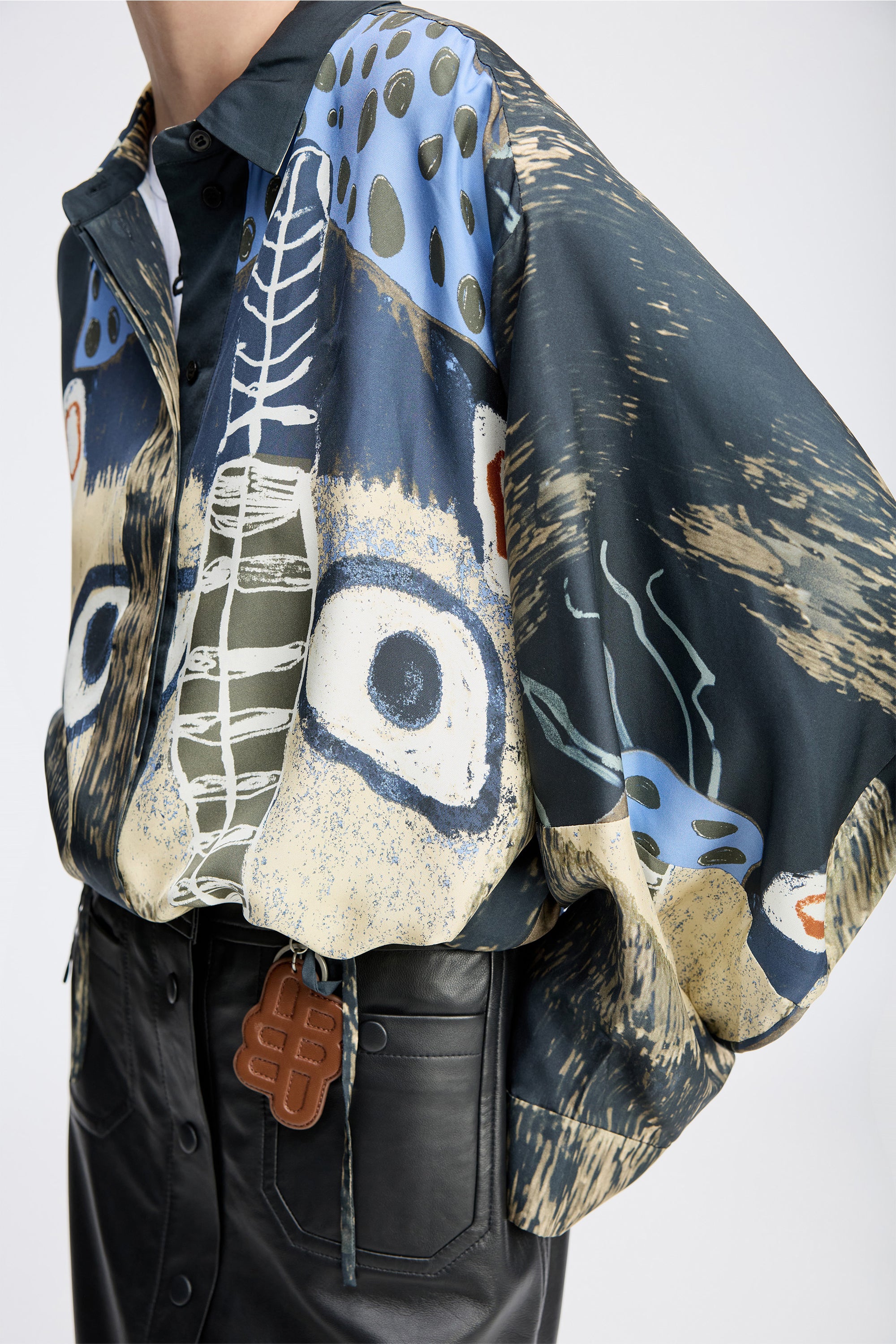 Shirt with a beautiful art print and elegant tie details at the bottom and on the sleeves. The shirt is designed with loose sleeves and can be styled both open and closed.