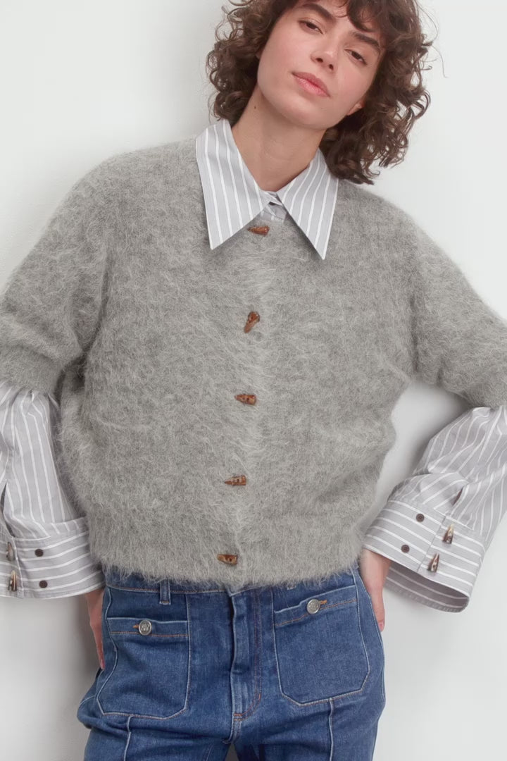 Cardigan with beautiful faux horn buttons and an elegant brushed finish. This cardigan is designed with short sleeves and two elegant front pockets.