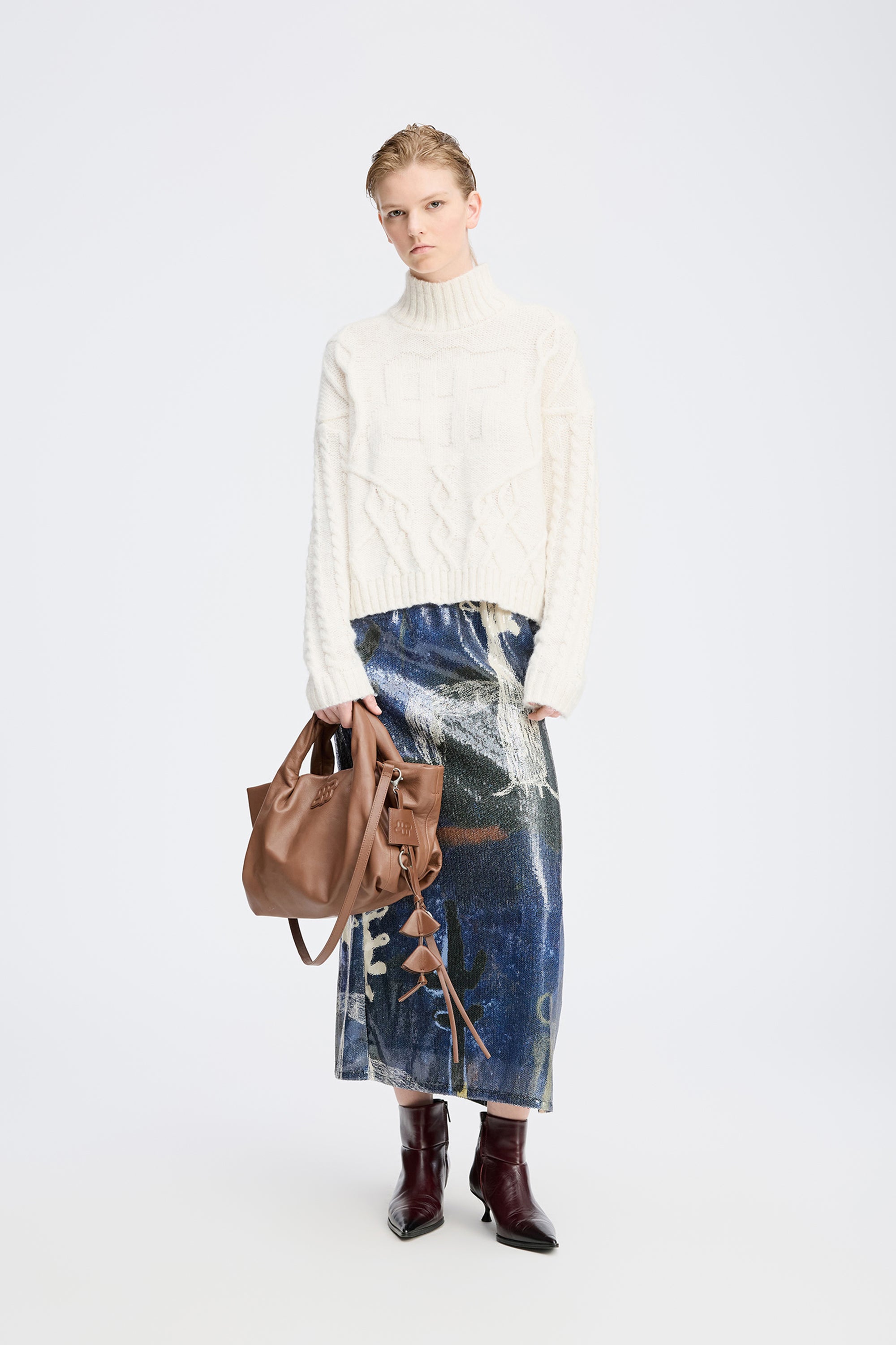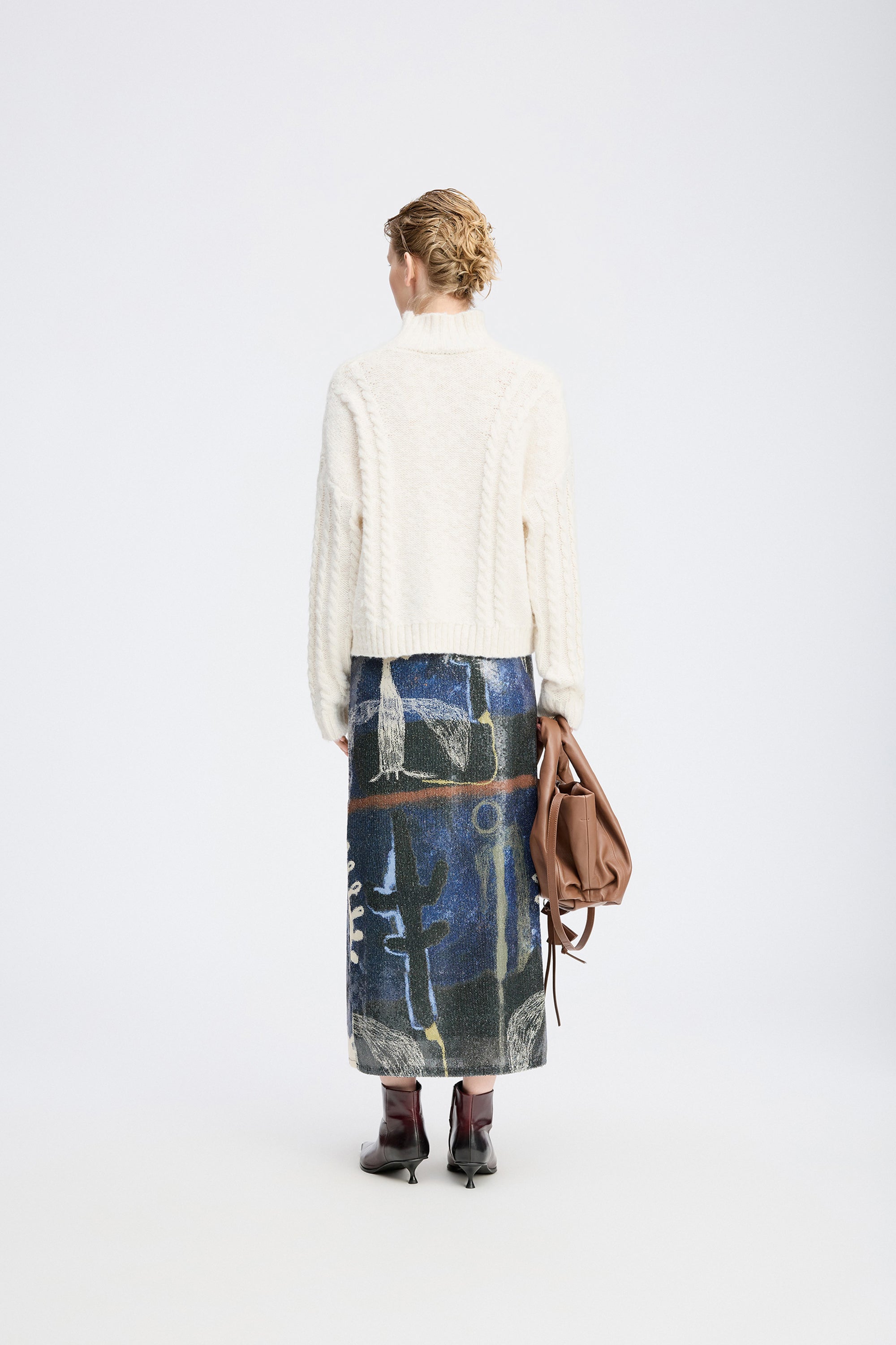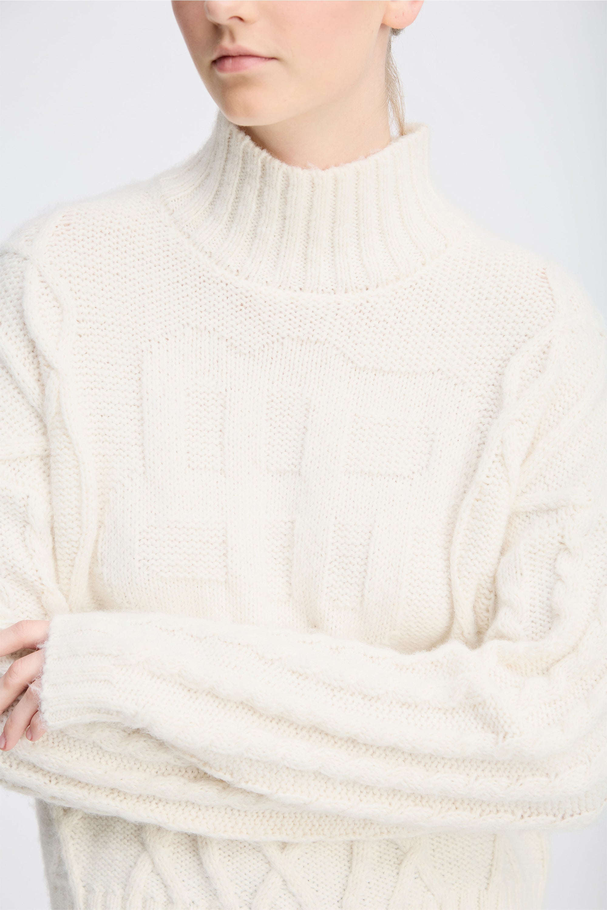 Knit with a beautiful cable-knit pattern and a MUNTHE emblem on the chest. This knit features long sleeves and a high neckline.