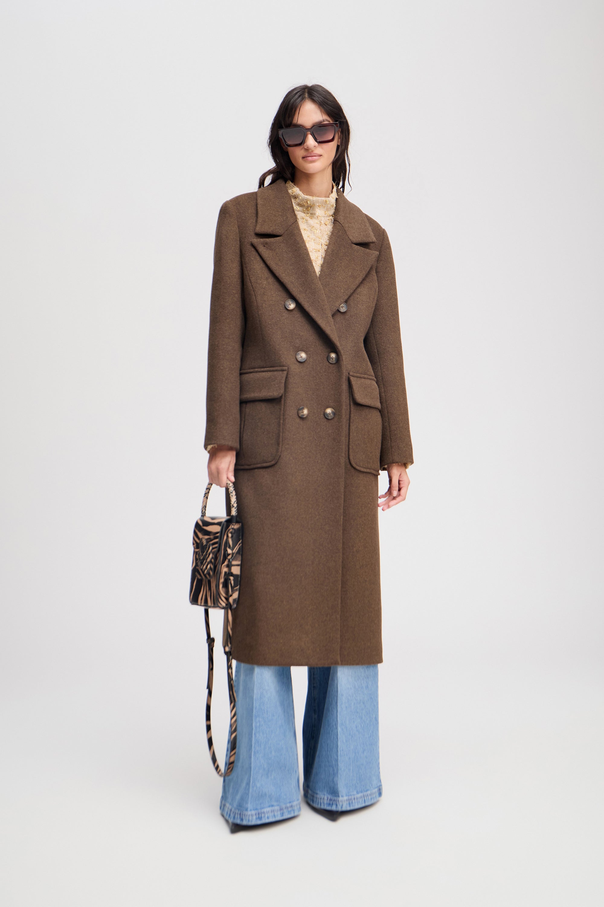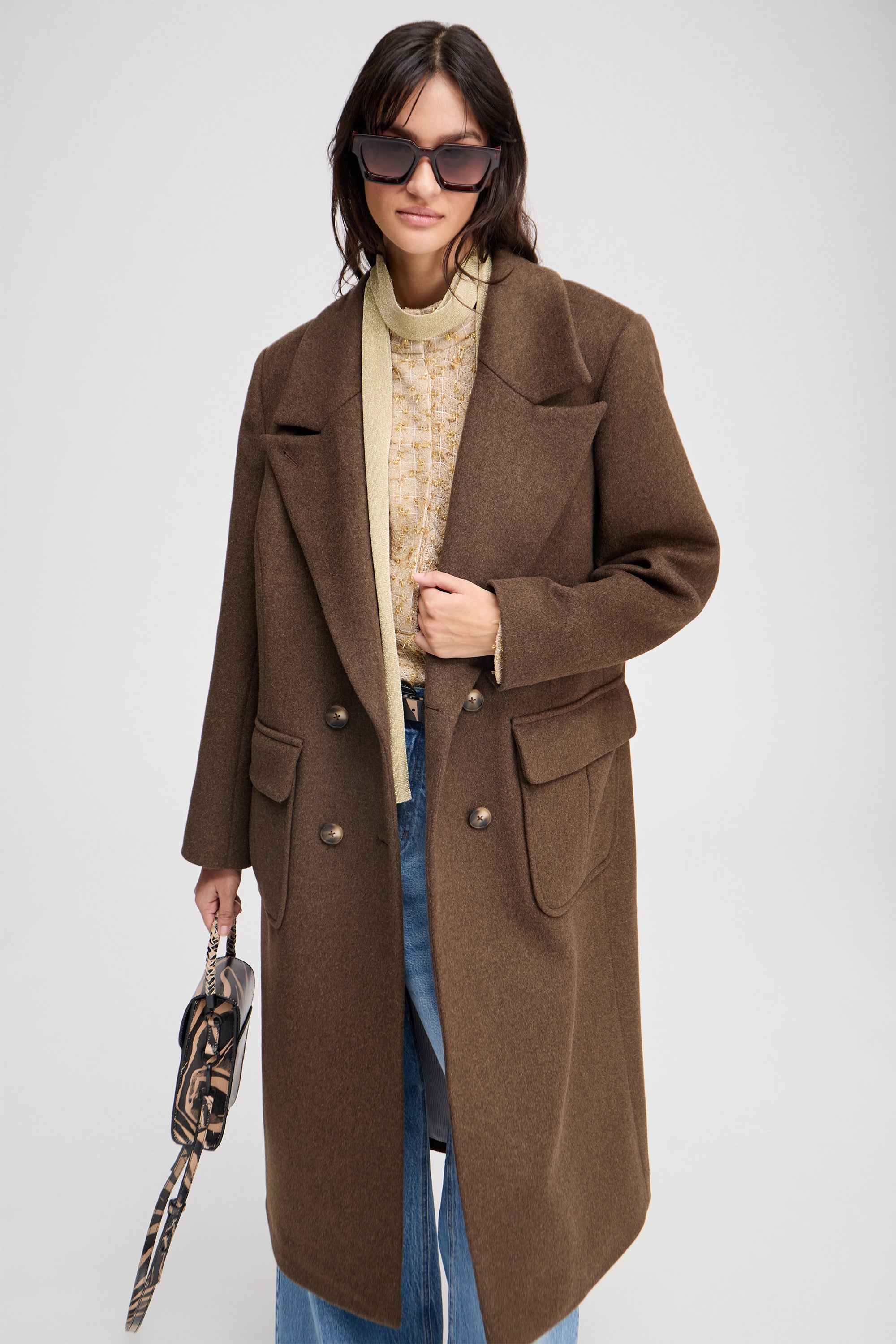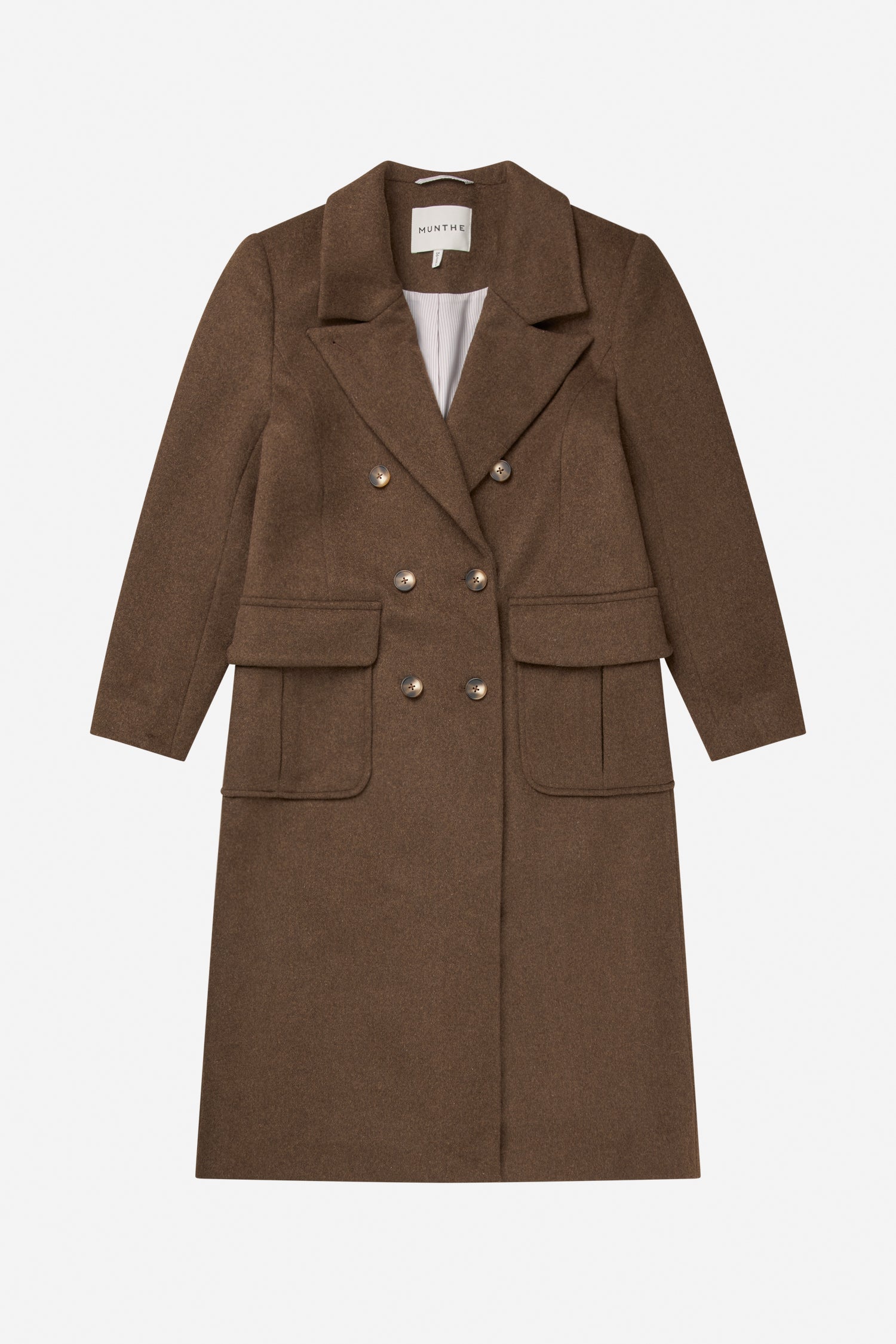 A beautiful coat with elegant, oversized side pockets and a double-breasted button fastening. On cold days, the coat can be fastened with an additional button at the collar.