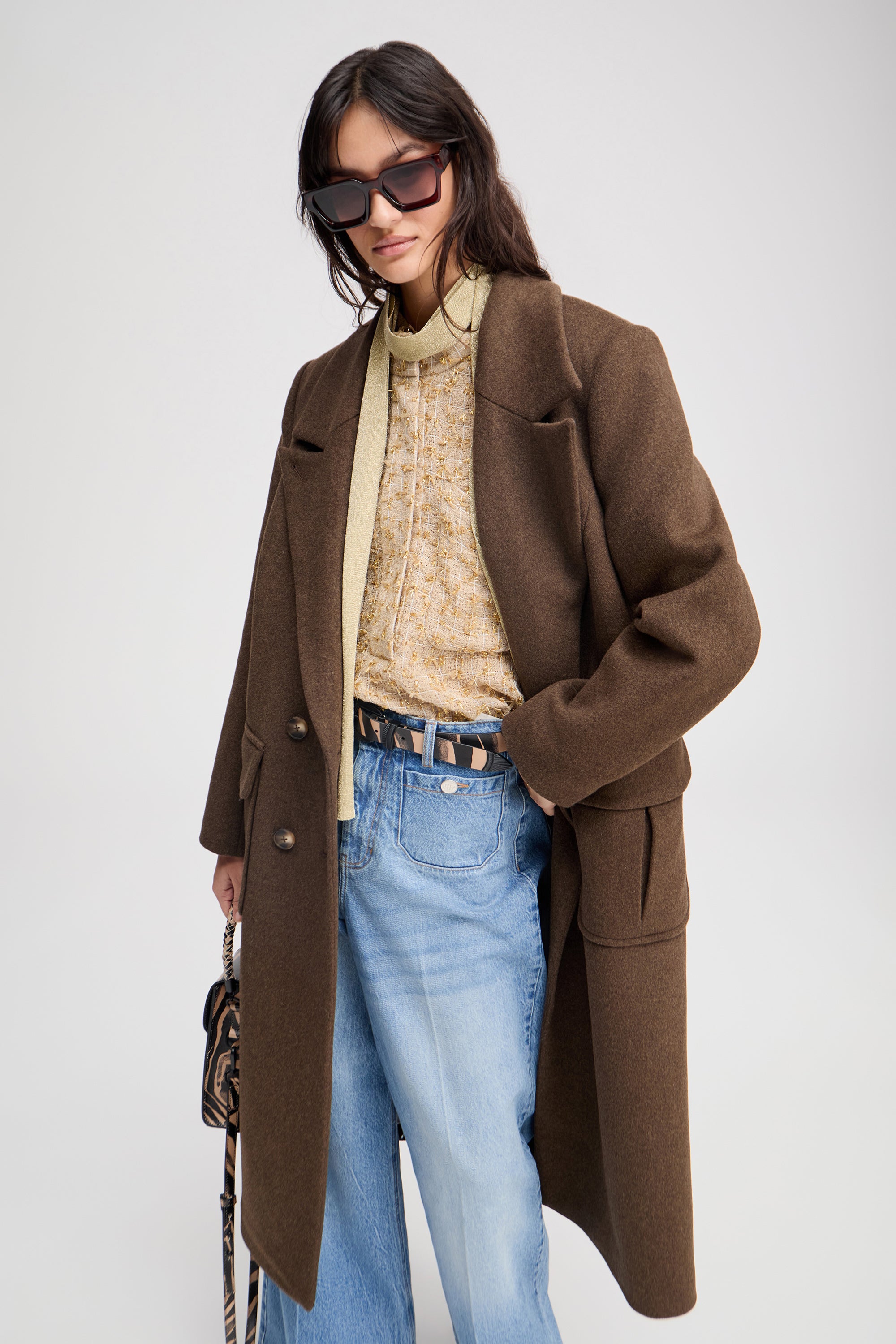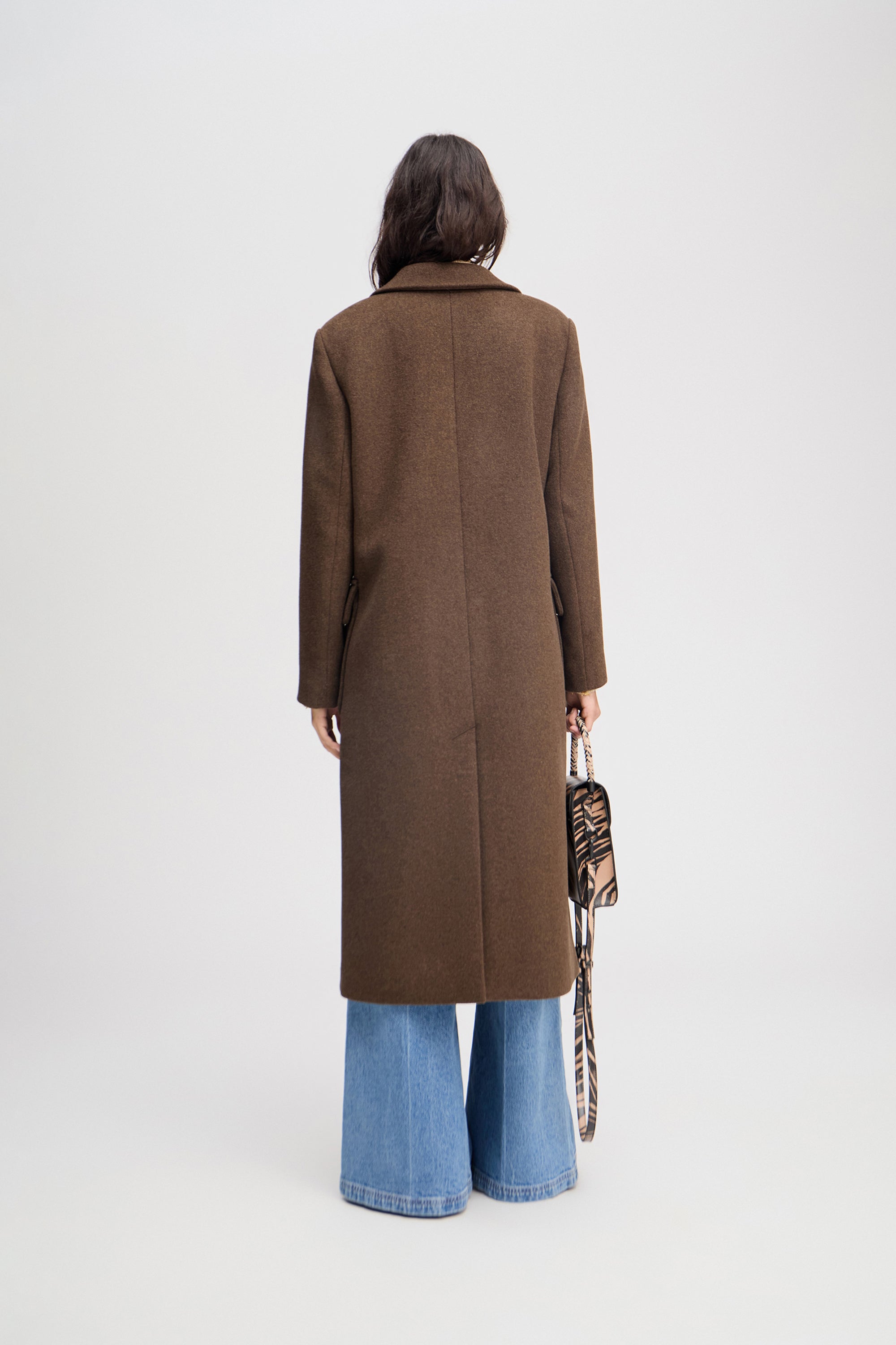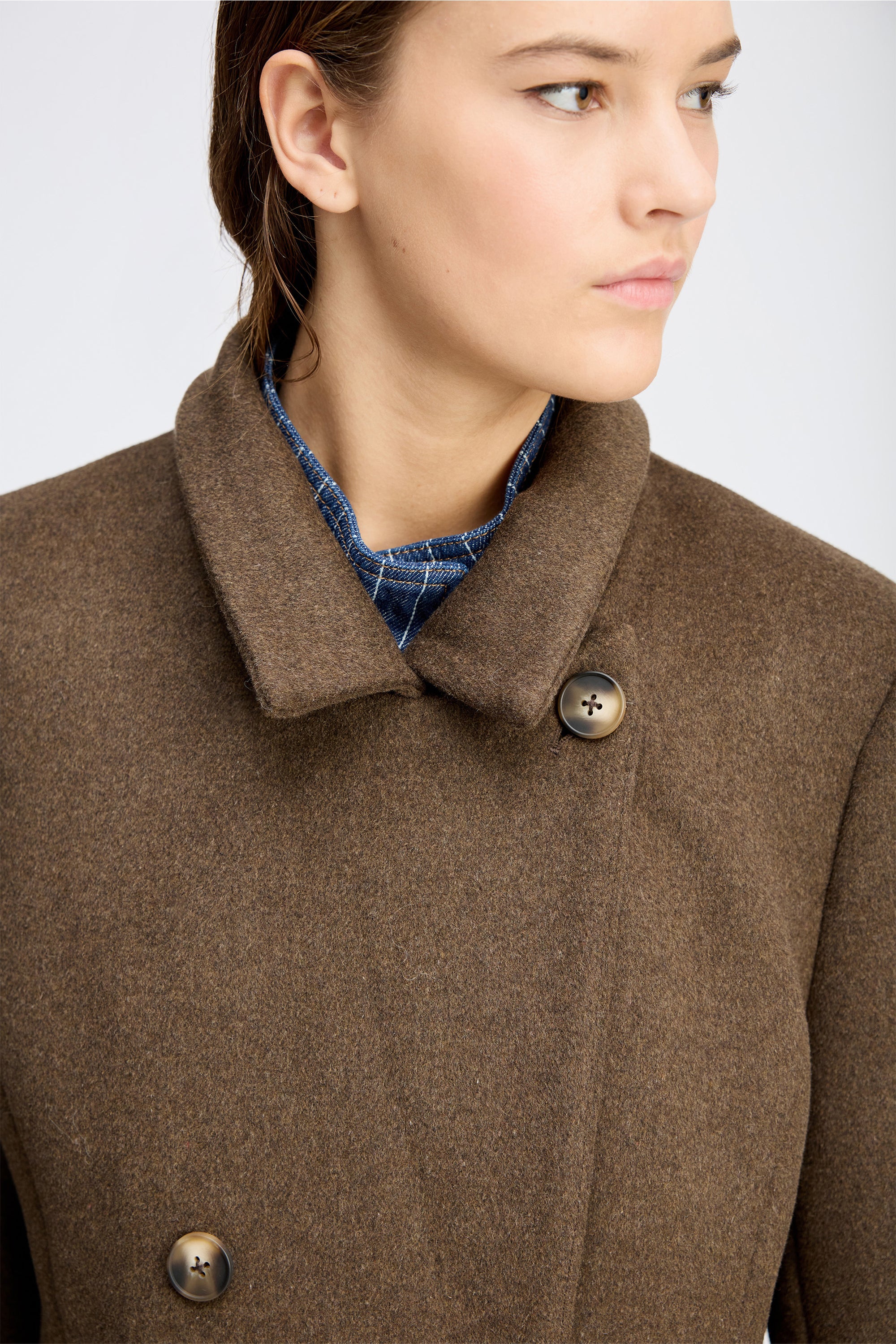 A beautiful coat with elegant, oversized side pockets and a double-breasted button fastening. On cold days, the coat can be fastened with an additional button at the collar.