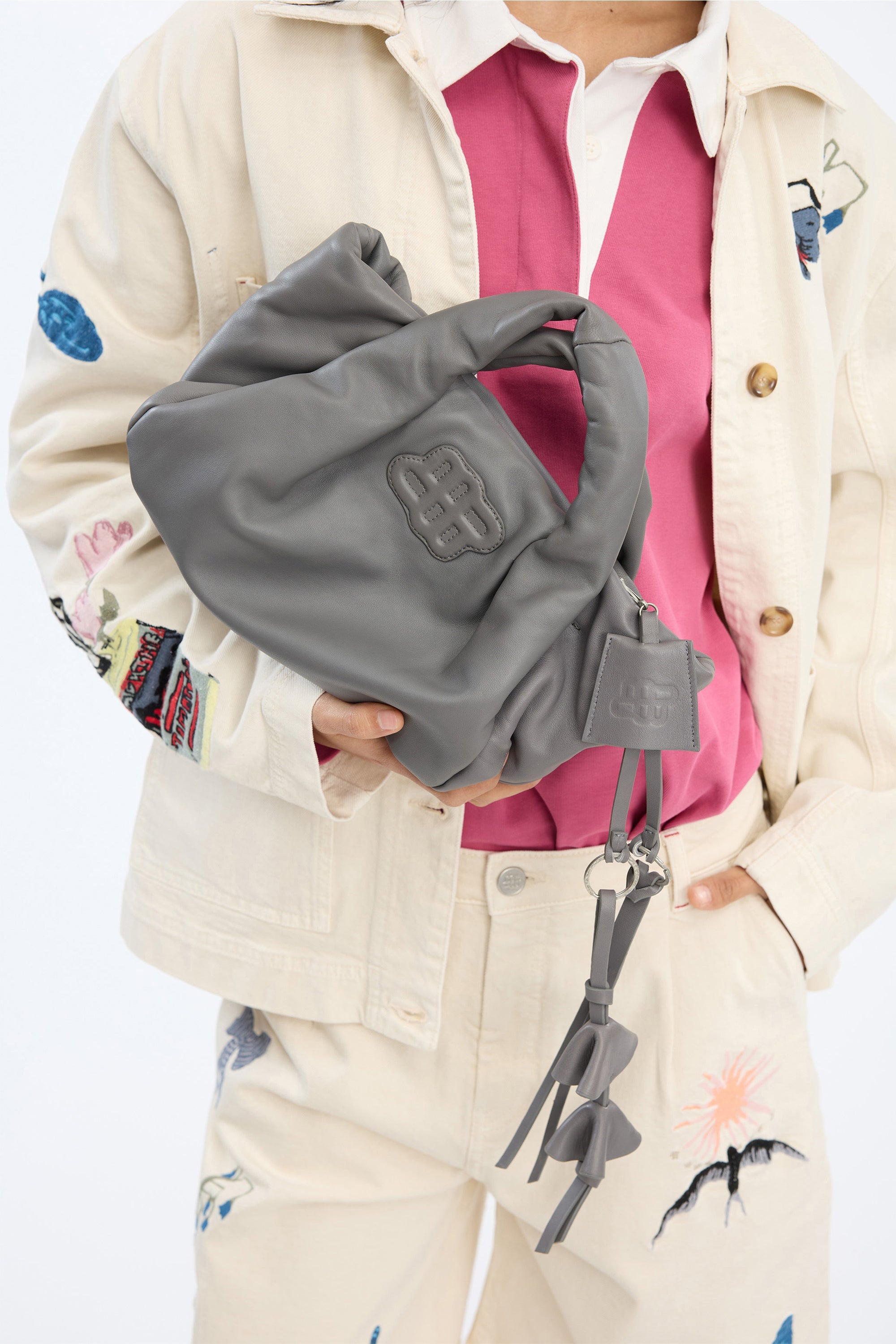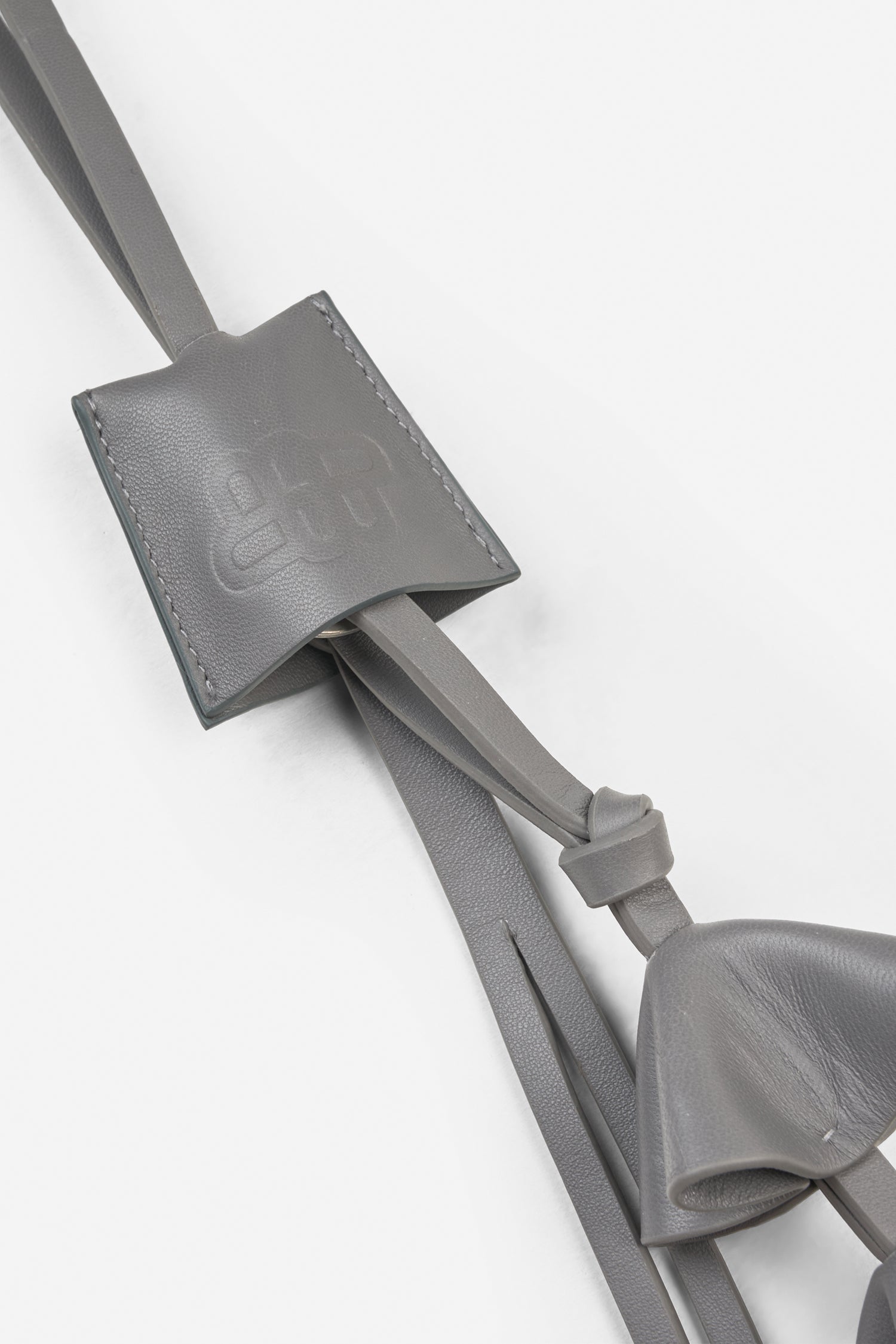 This bag charm is crafted from lamb leather and designed with three small layered leather charms and a long, slim strap.
