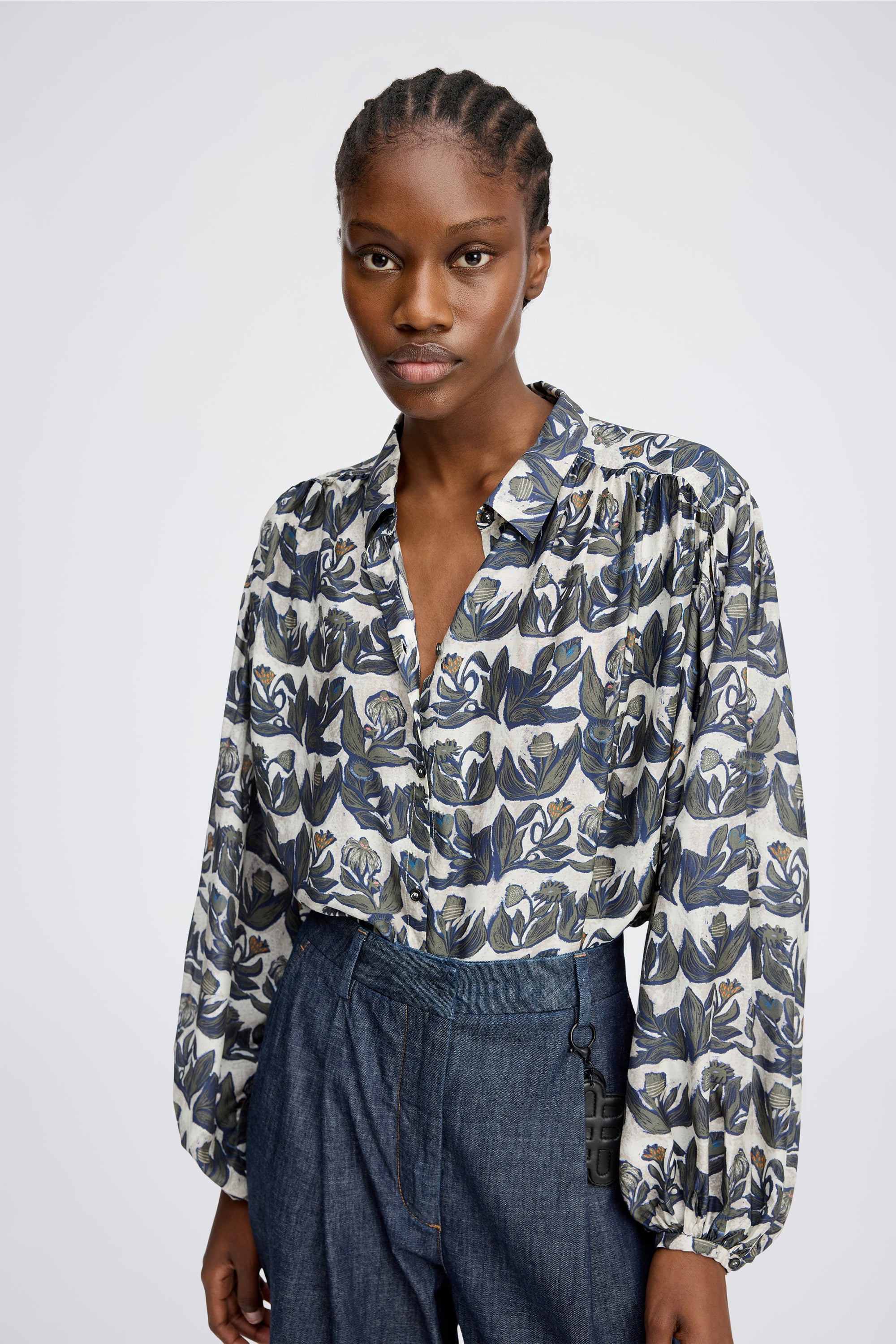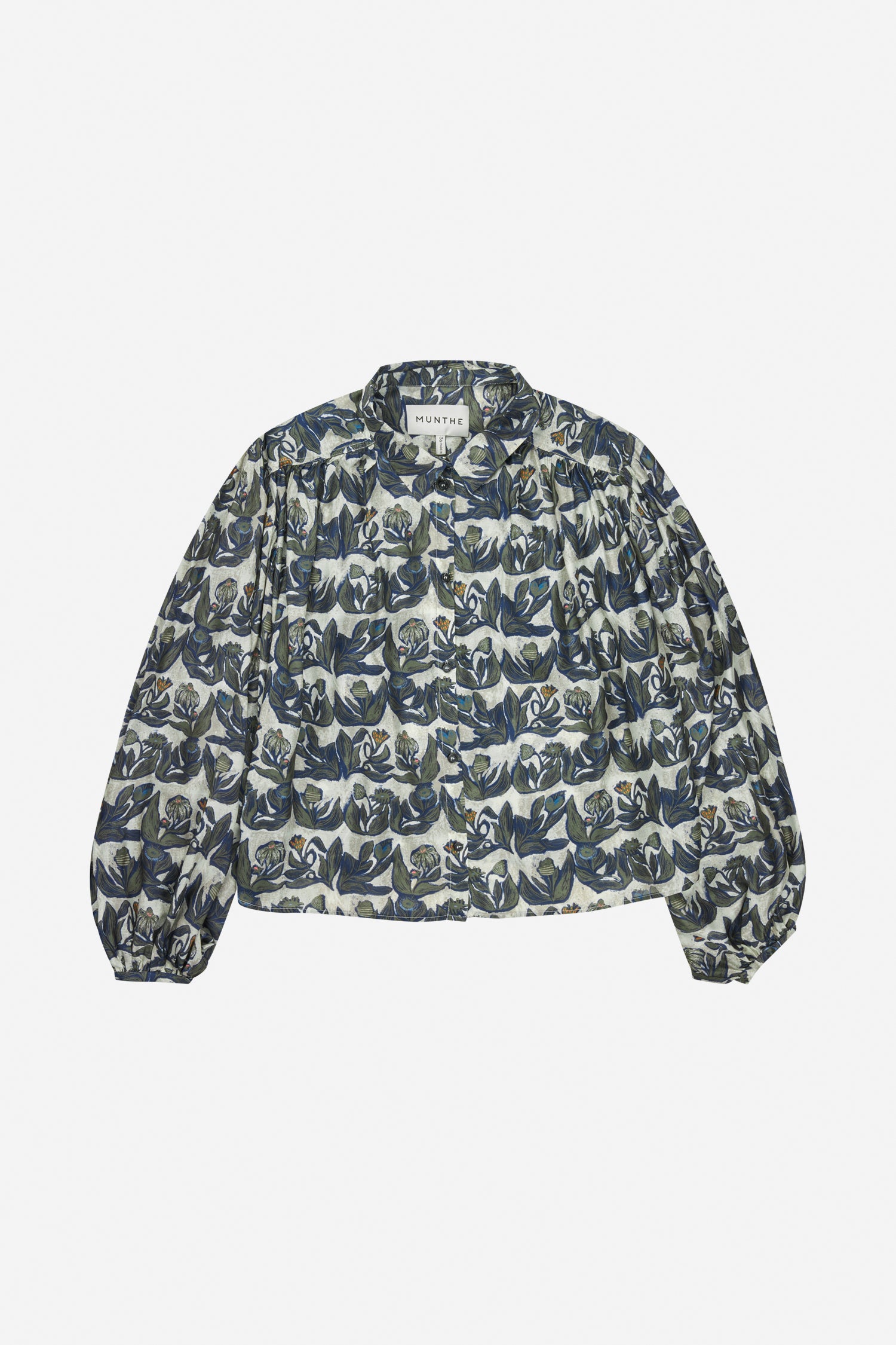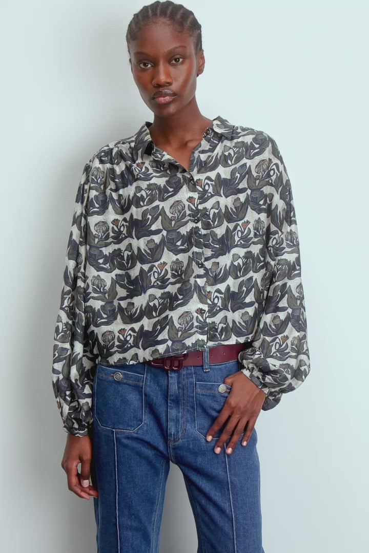 Shirt with a beautiful all-over print and elegant, wide, loose sleeves. This shirt is designed with long sleeves and a delicate button closure.