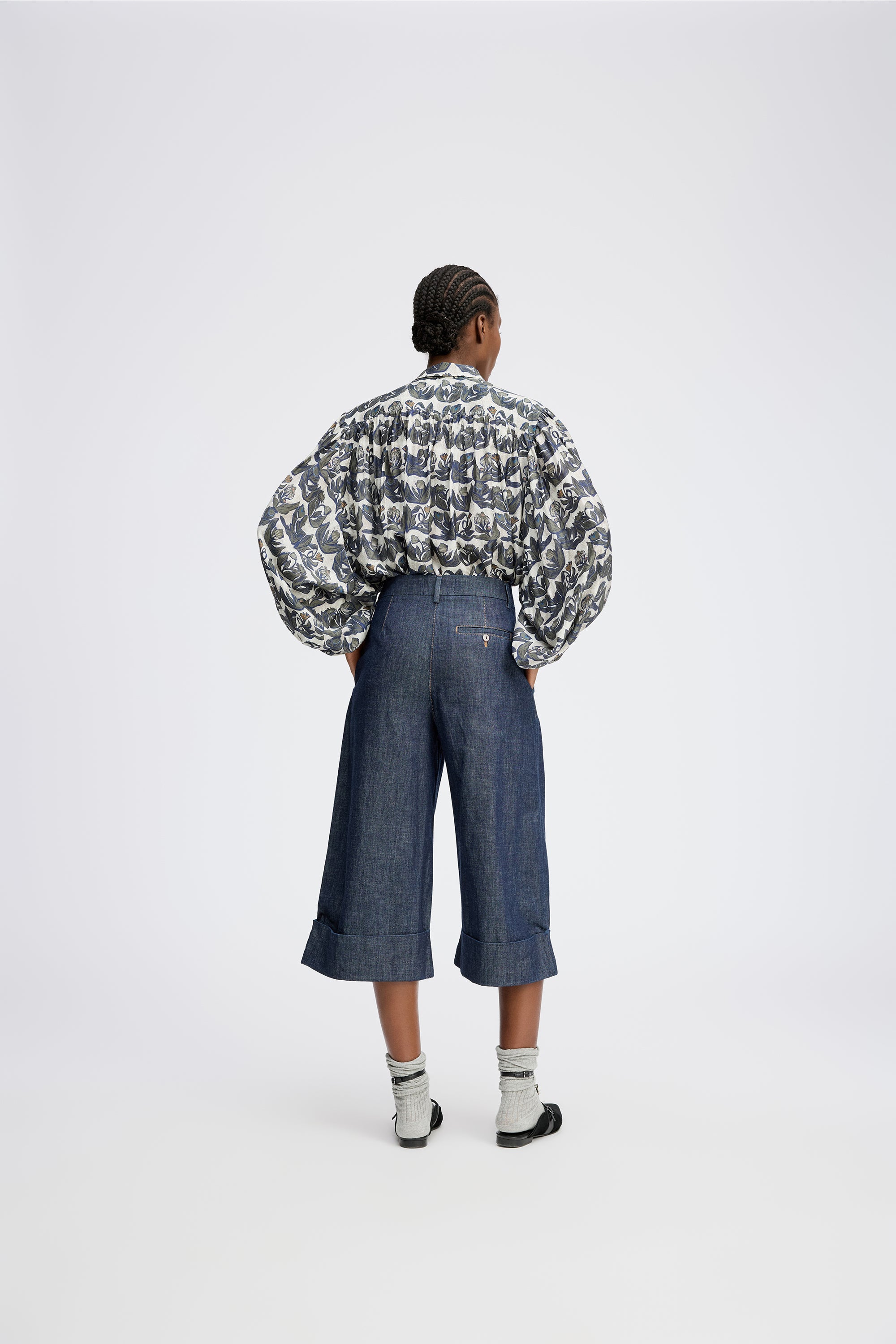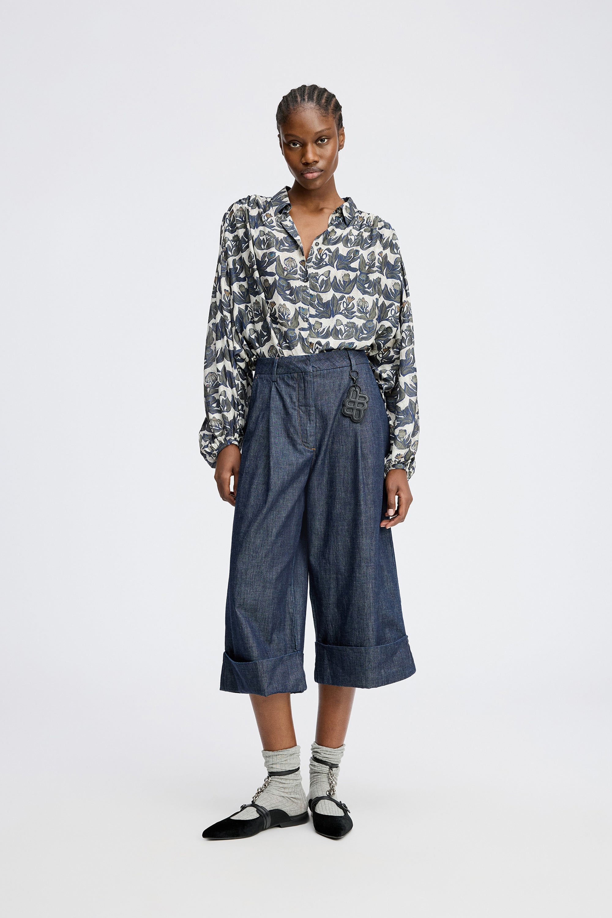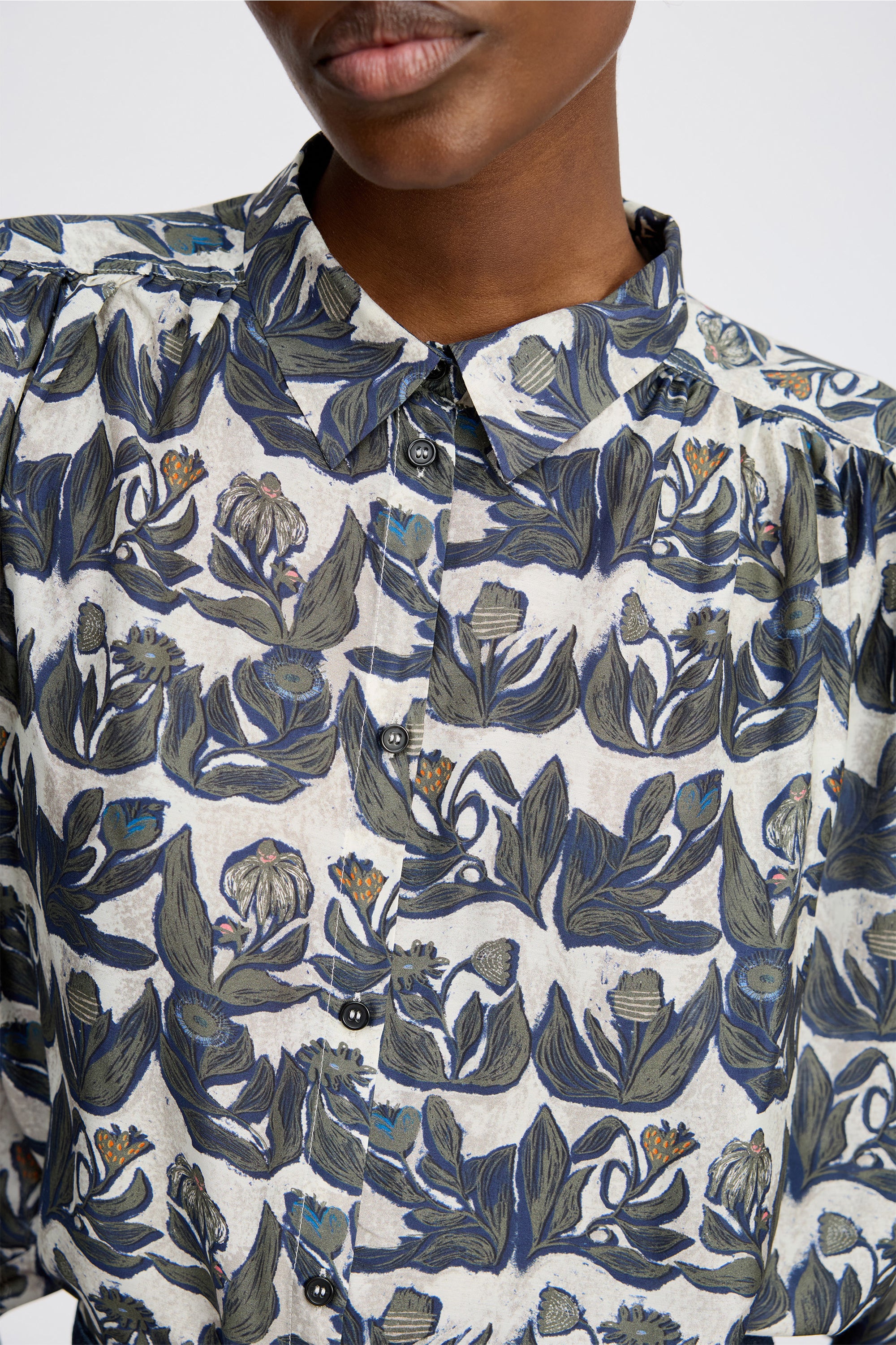 Shirt with a beautiful all-over print and elegant, wide, loose sleeves. This shirt is designed with long sleeves and a delicate button closure.