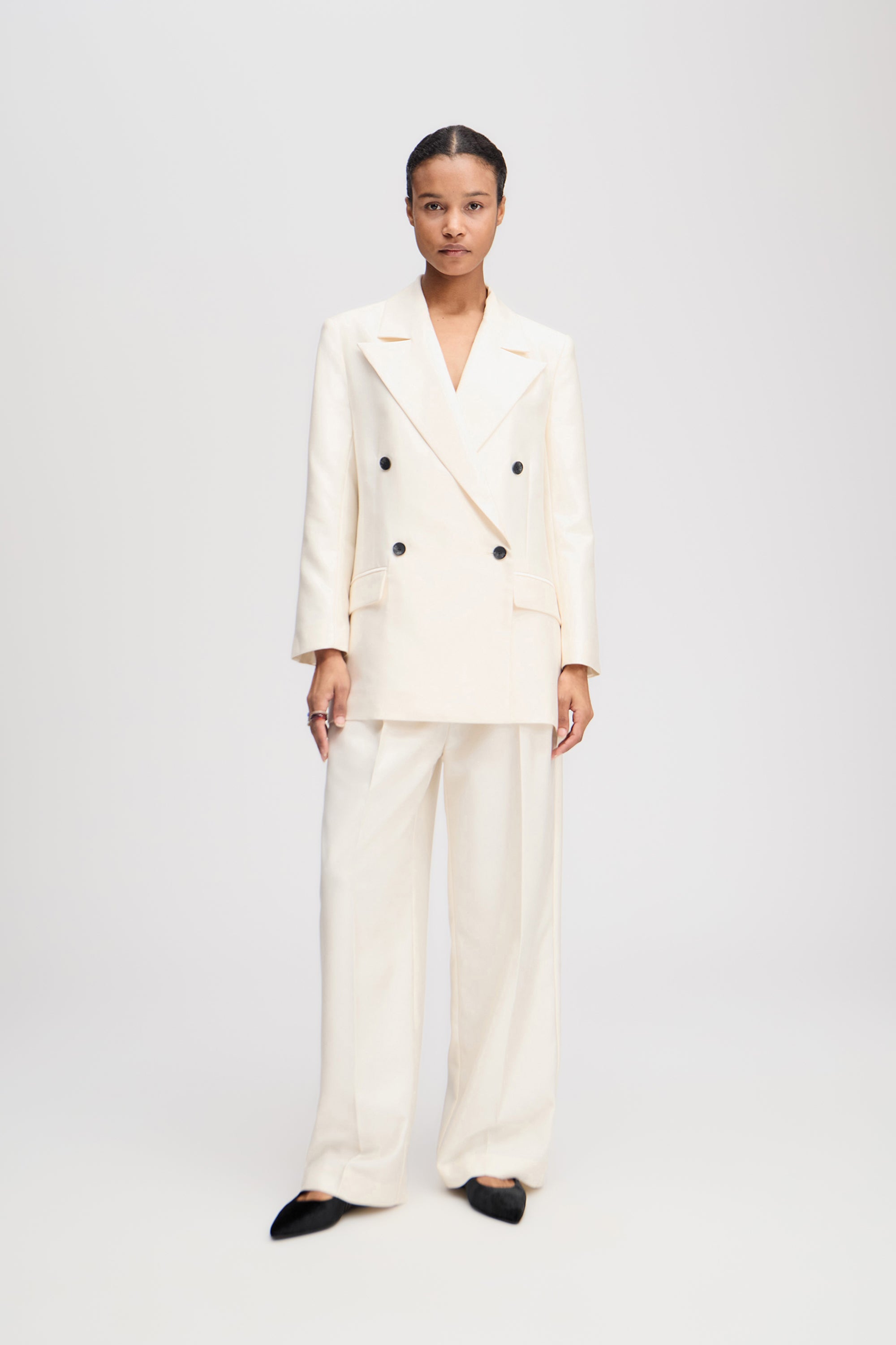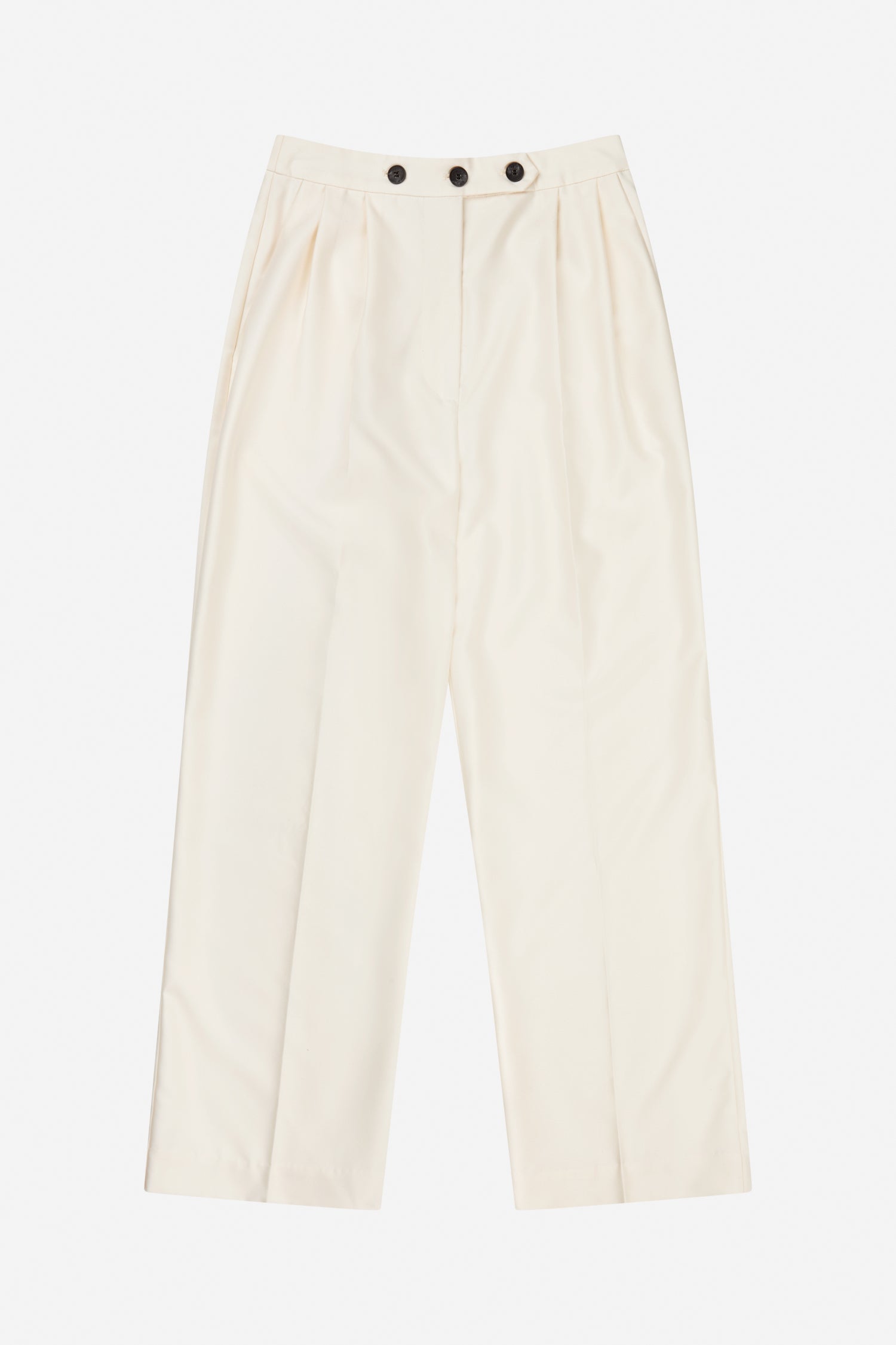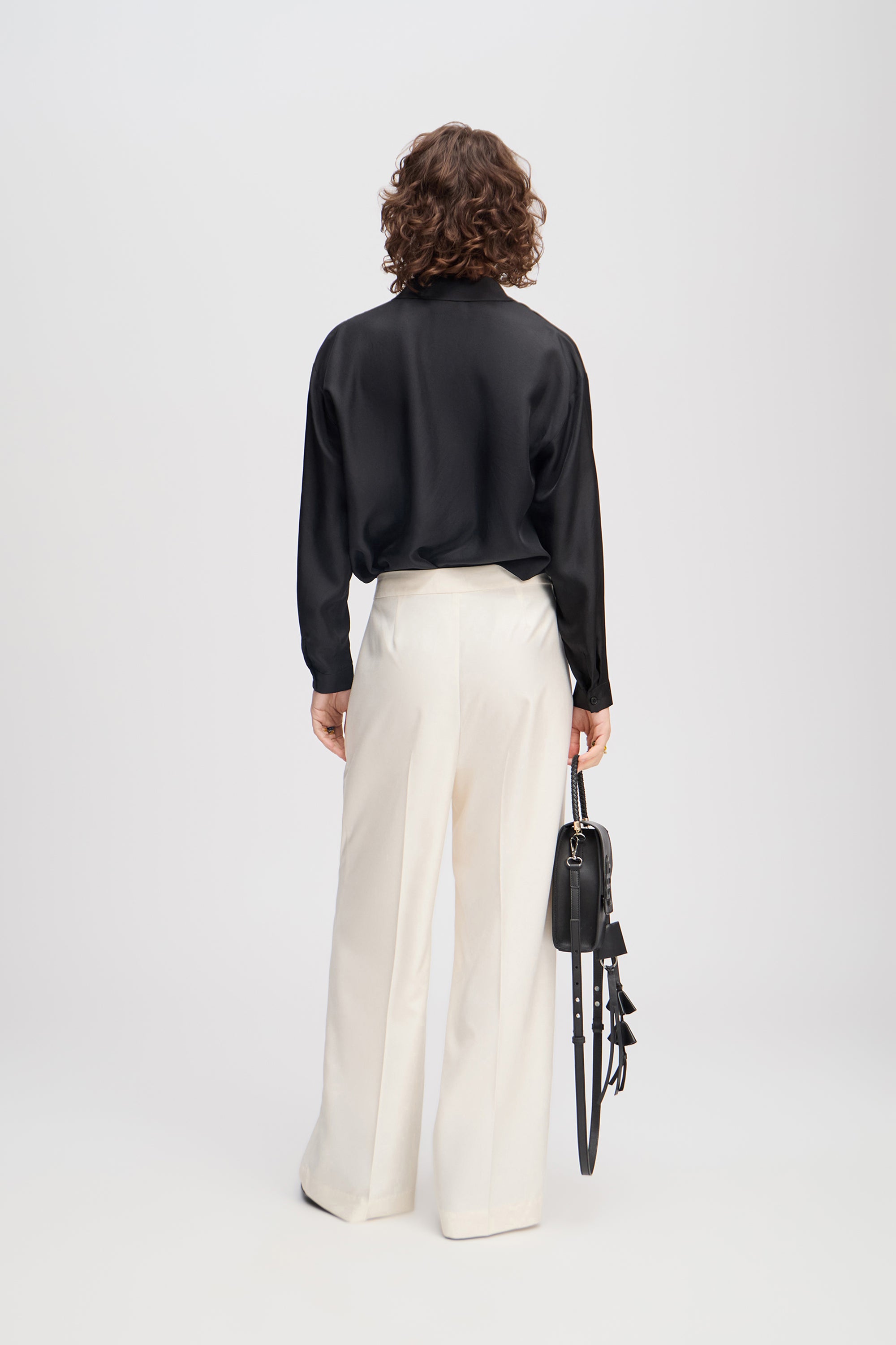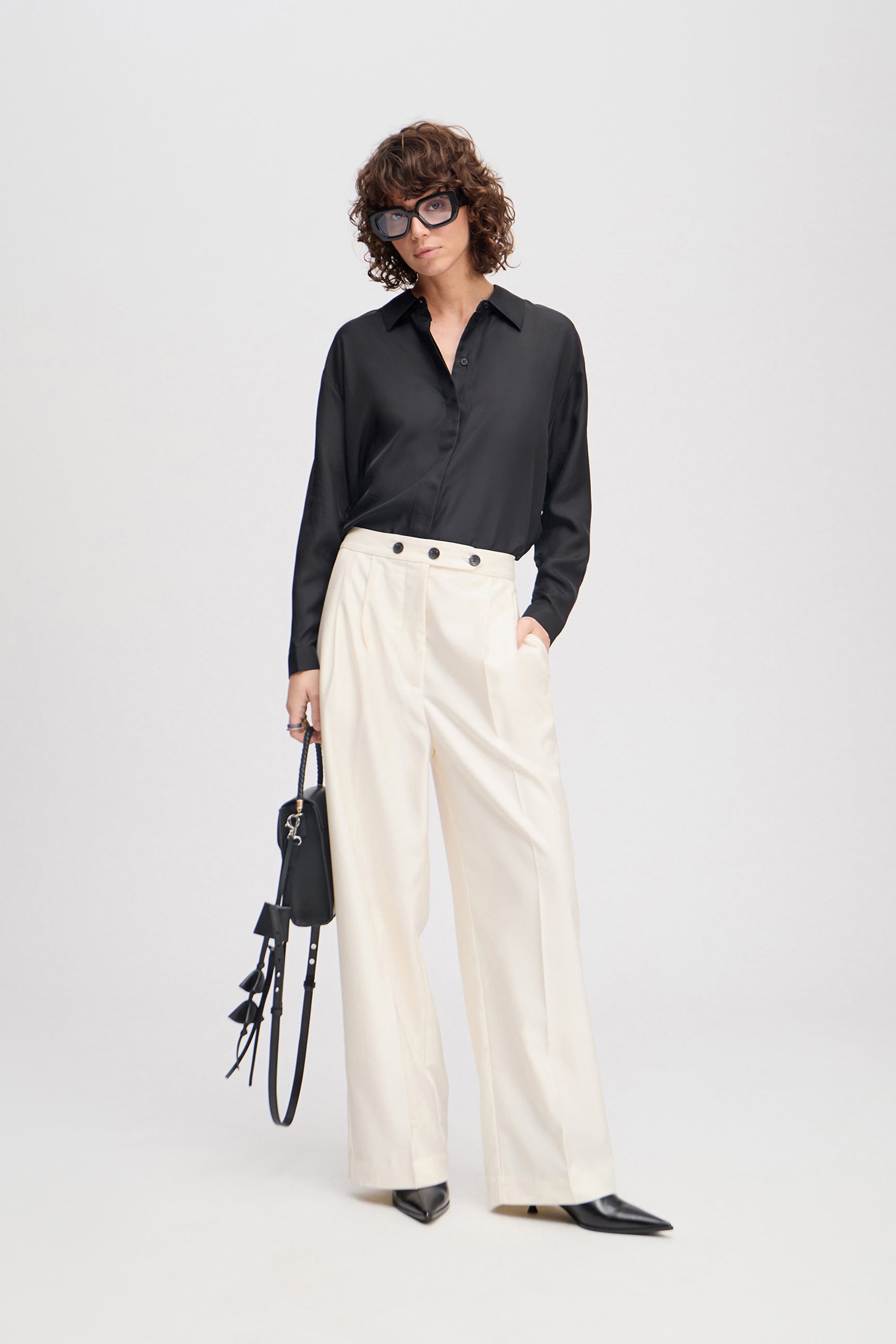 Trousers with elegant details, such as three beautiful black buttons at the waist. These trousers are designed with wide legs, pleats, and side pockets. They close at the front with a zipper.