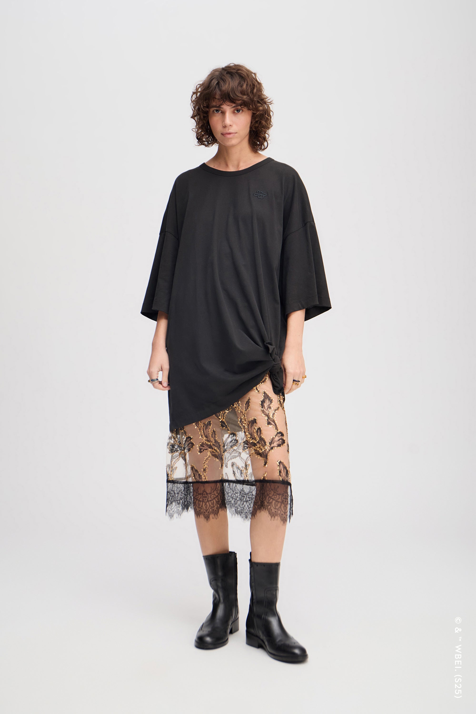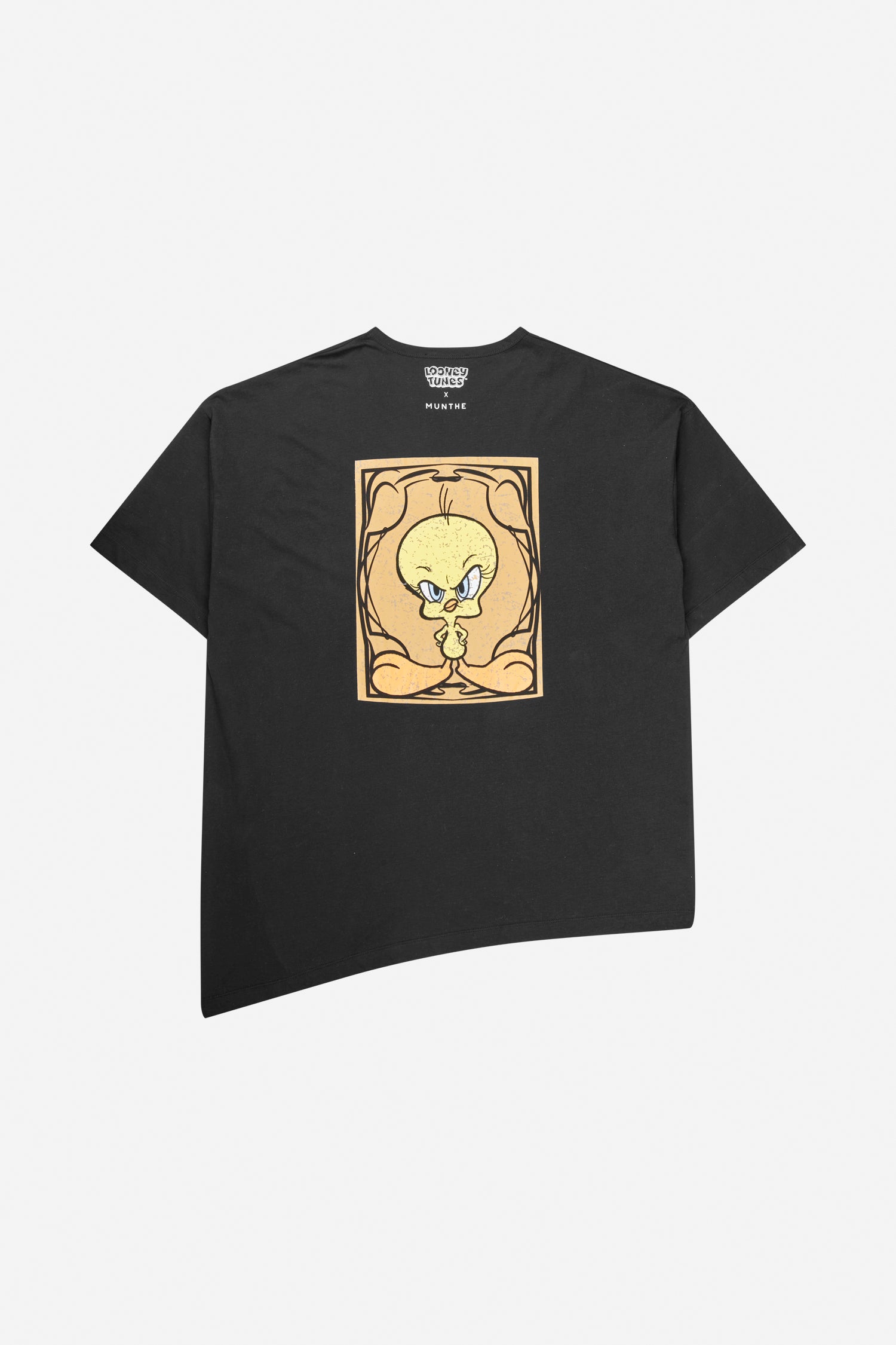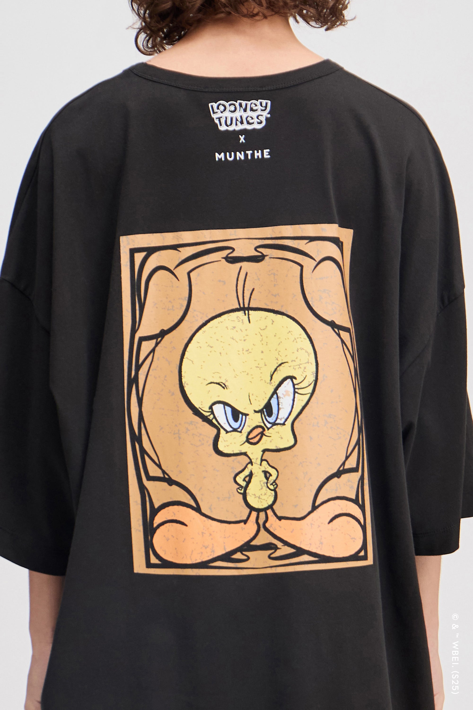 T-shirt with an elegant Tweety print and an asymmetrically cut bottom. The asymmetrical bottom allows you to style the T-shirt by either tying a knot or letting it hang freely as it is. This T-shirt is made in collaboration with Warner Bros. Discovery Global Consumer Products (WBDGCP).