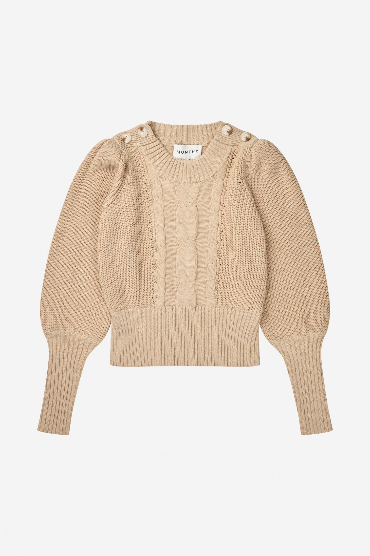 A beautiful cable knit sweater with elegant, wide sleeves and a fine, high ribbed edge at both the cuffs and the hem. The sweater is also designed with a stylish button closure at the neckline.