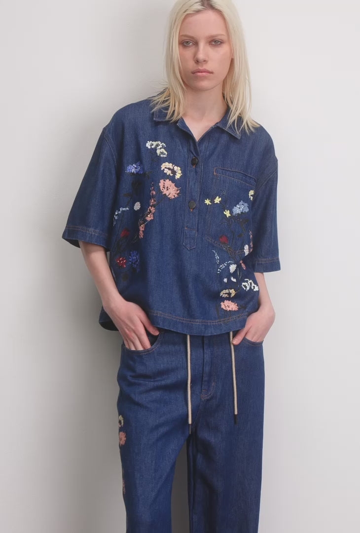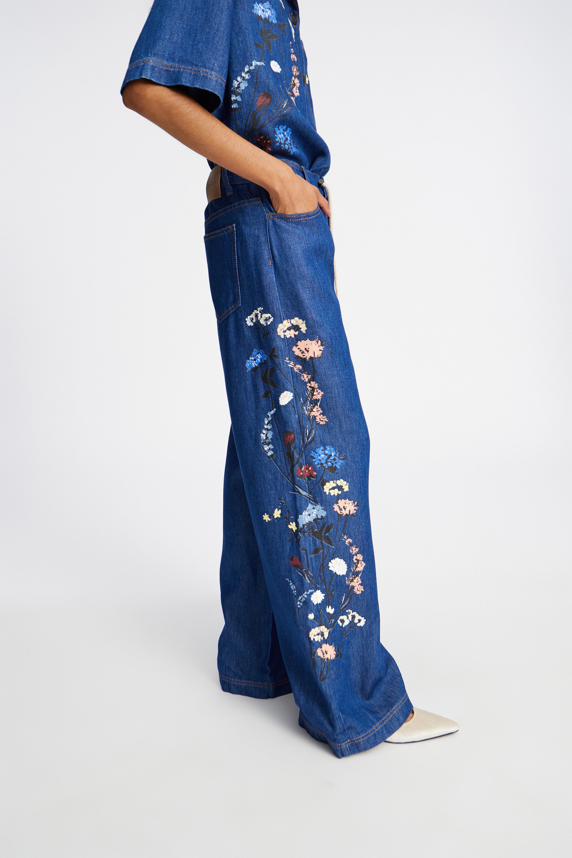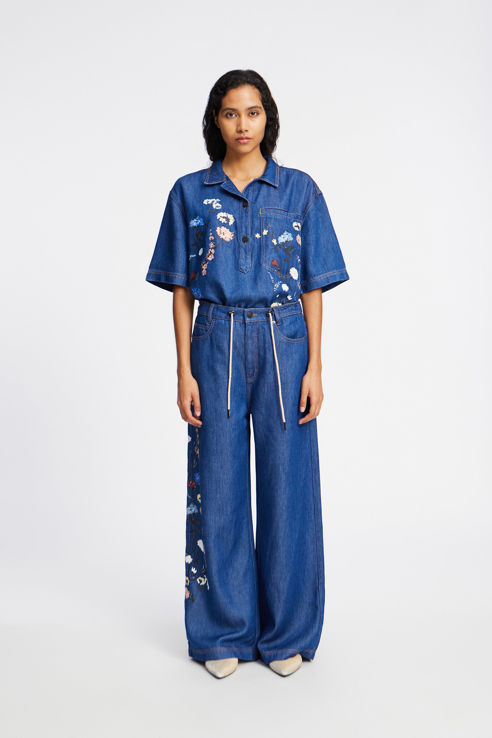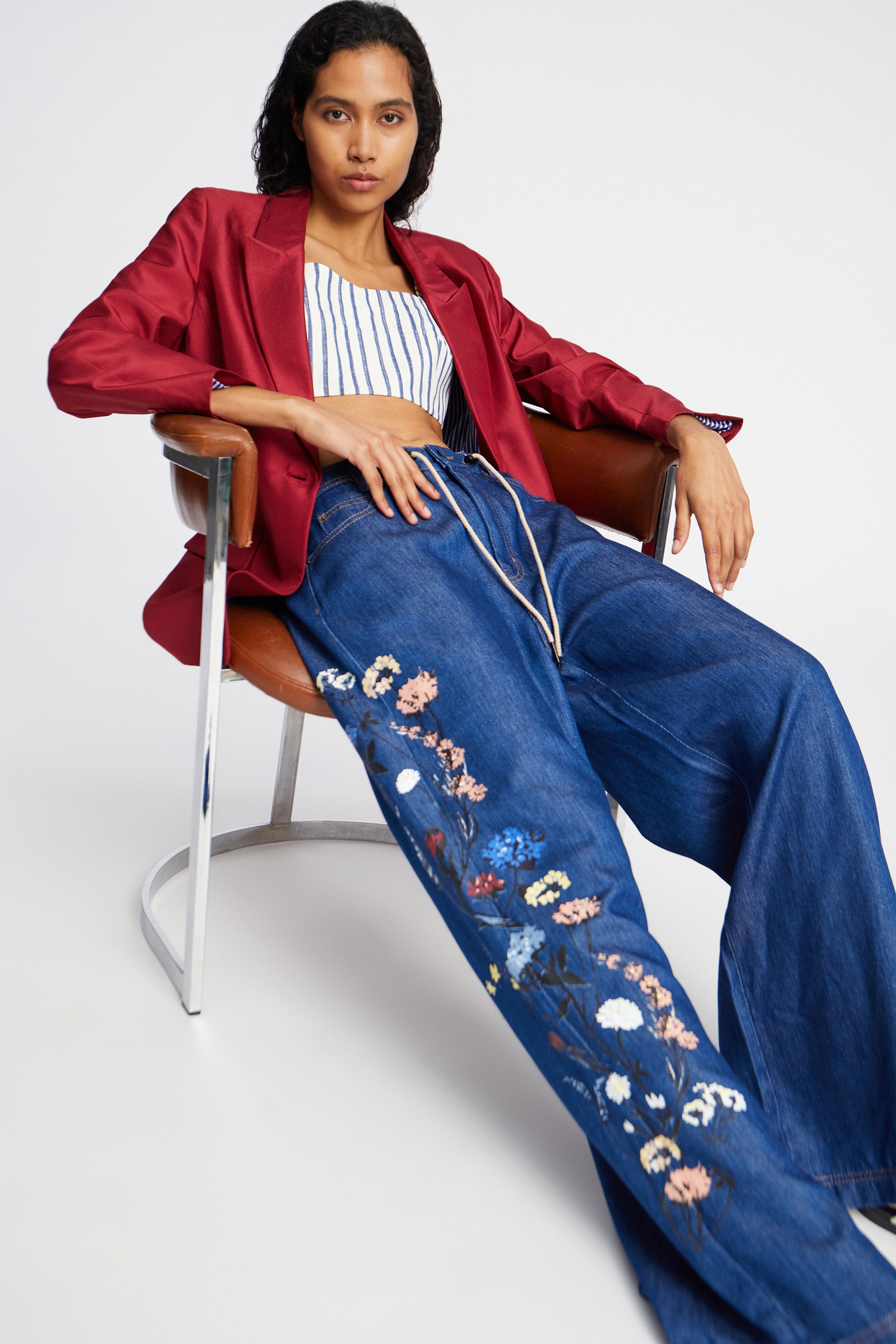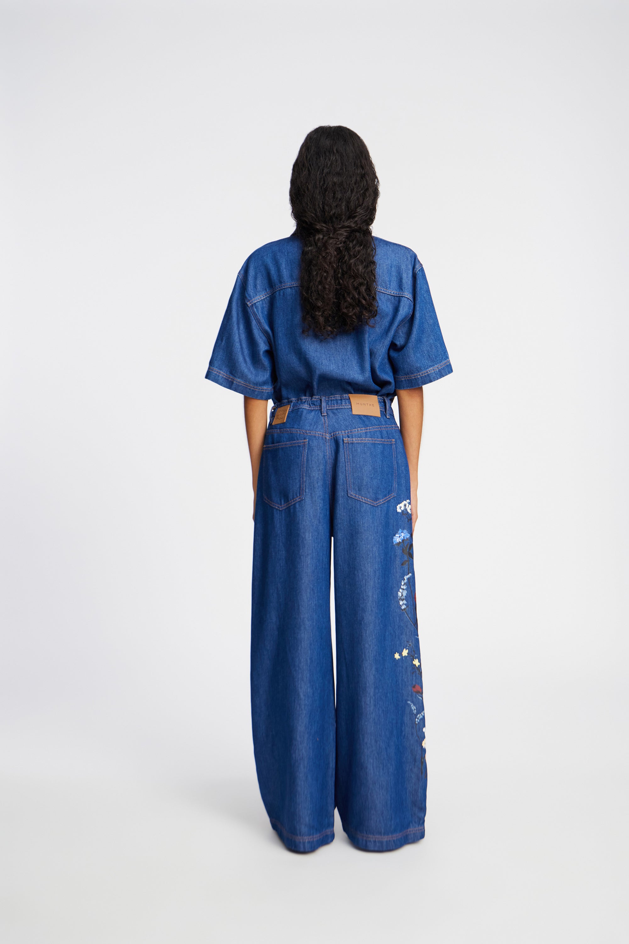 Dark blue jeans, designed with a beautifully painted floral print. These jeans have an elegant drawstring detail at the waist, a loose fit, wide legs and are designed with front and back pockets.